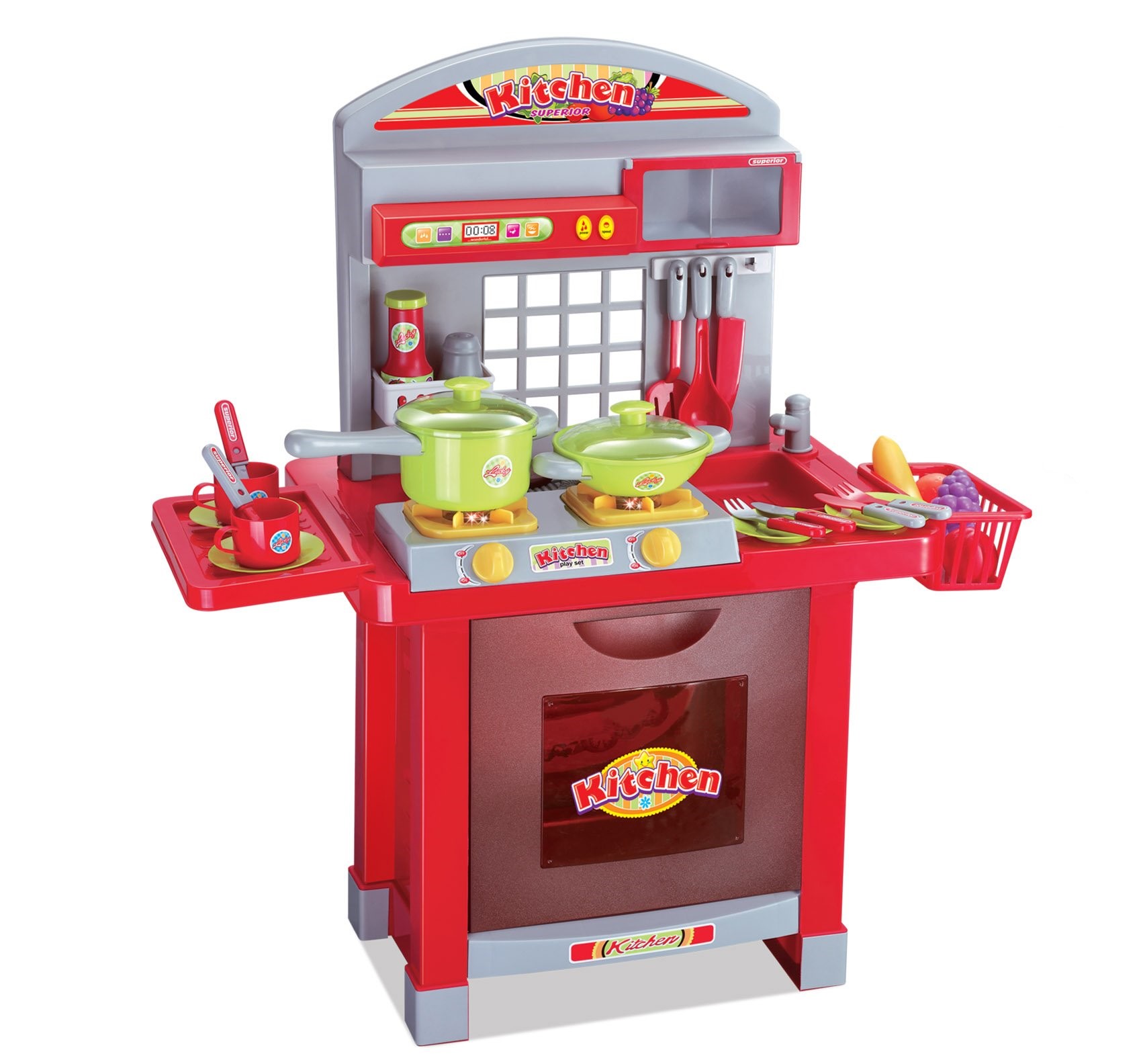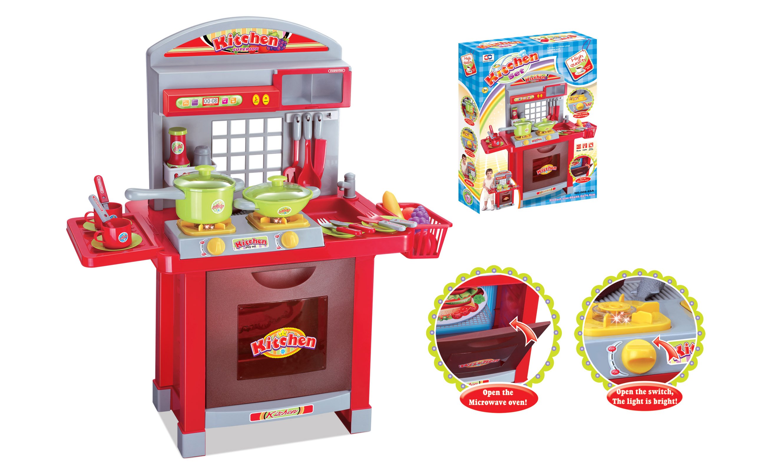Kuchyňka má troubu, dvě plotýnky na vaření, dřez, odkládací plochu, věšák na kuchyňské náčiní a mnoho dalšího příslušenství. V balení najdete například hrnce, talíře, hrnečky, příbory, ovoce, zeleninu a kořenky.