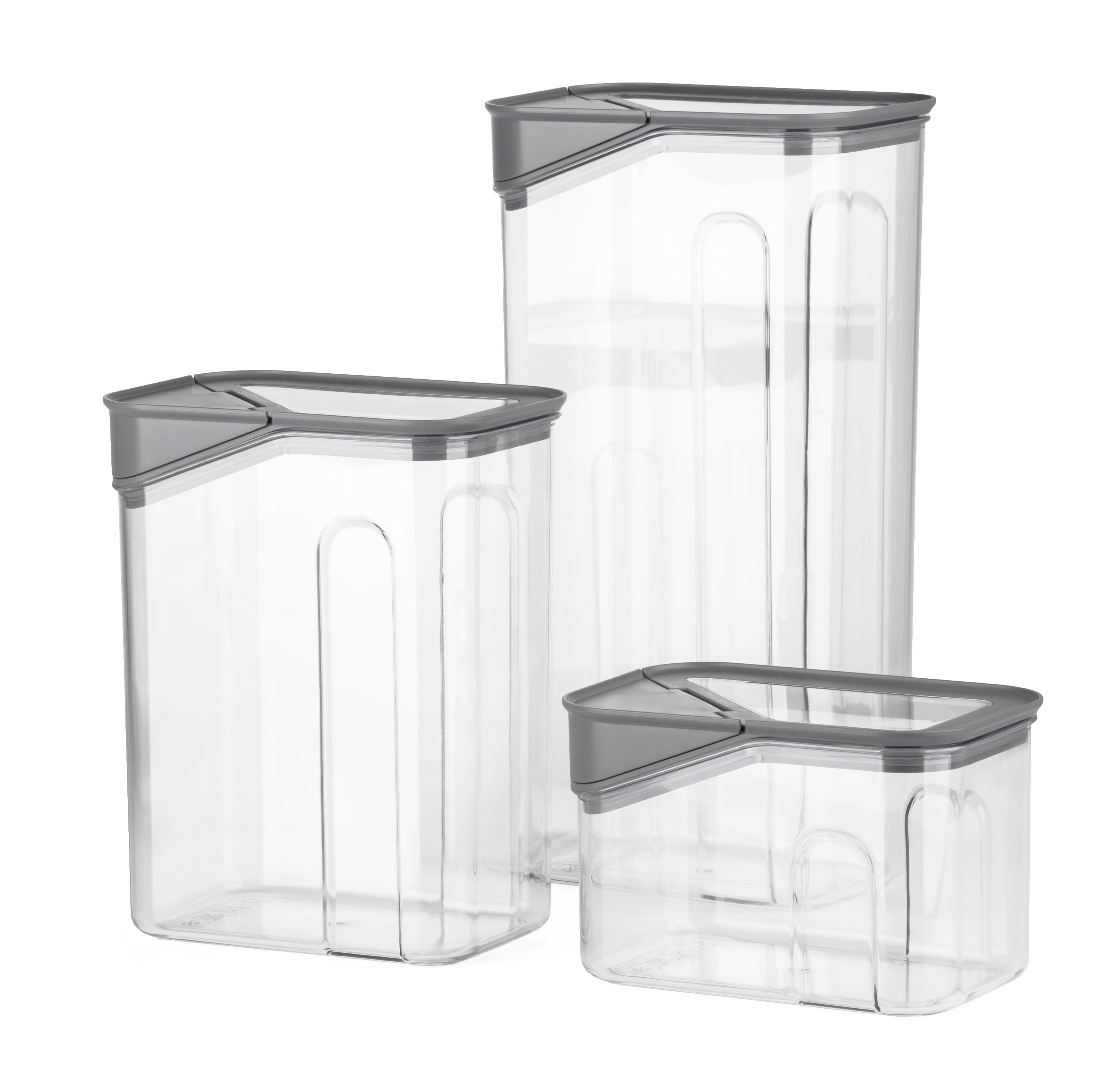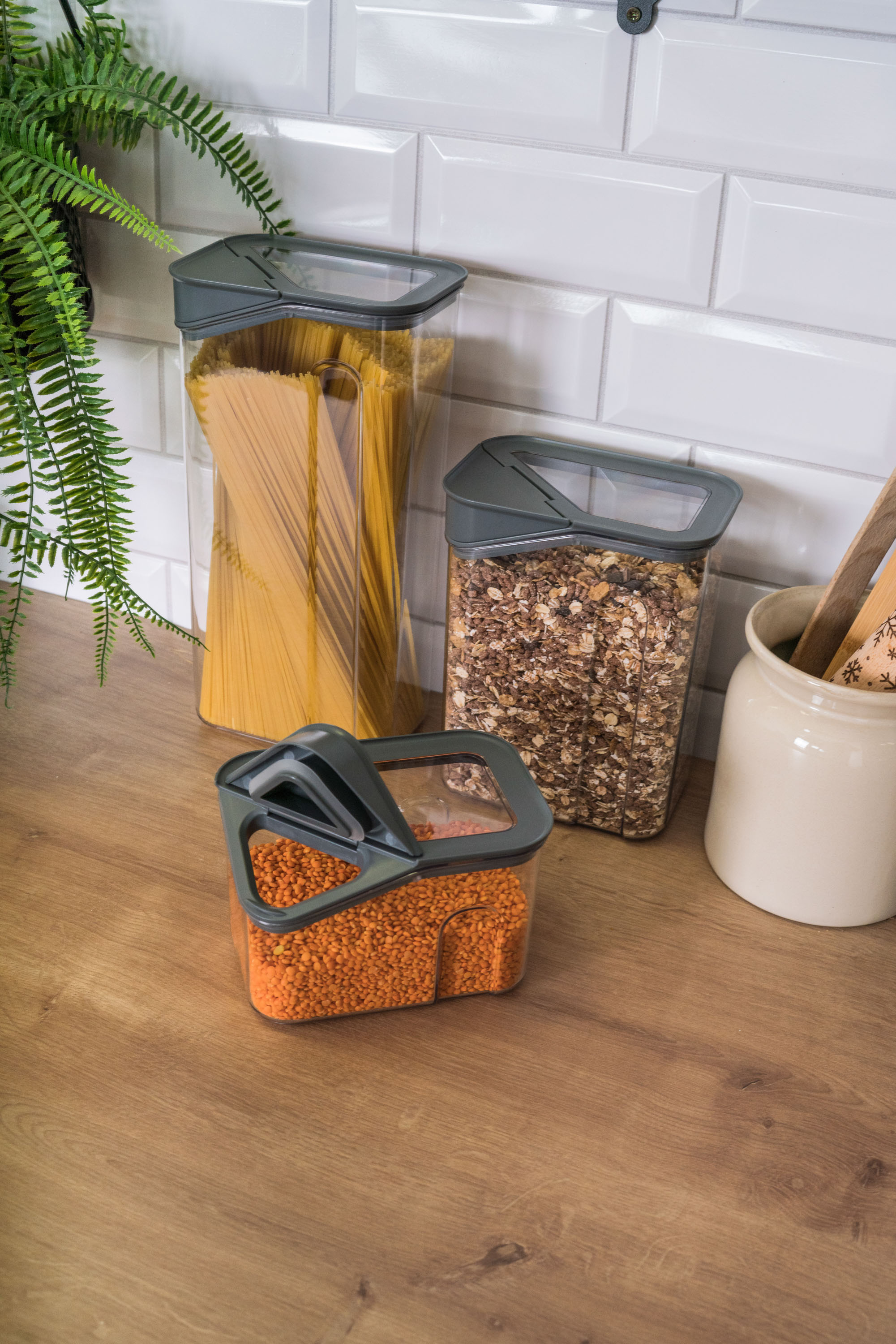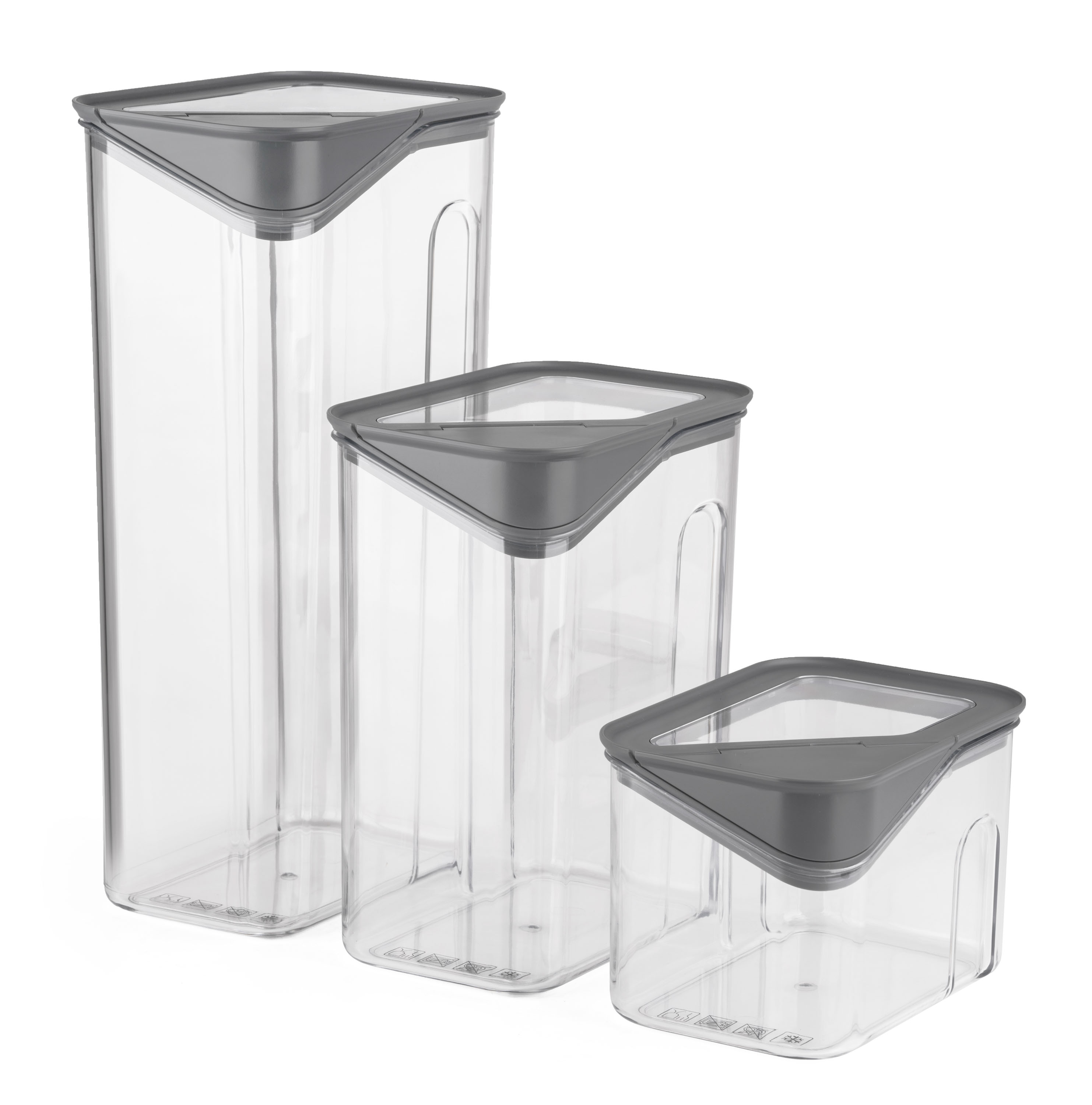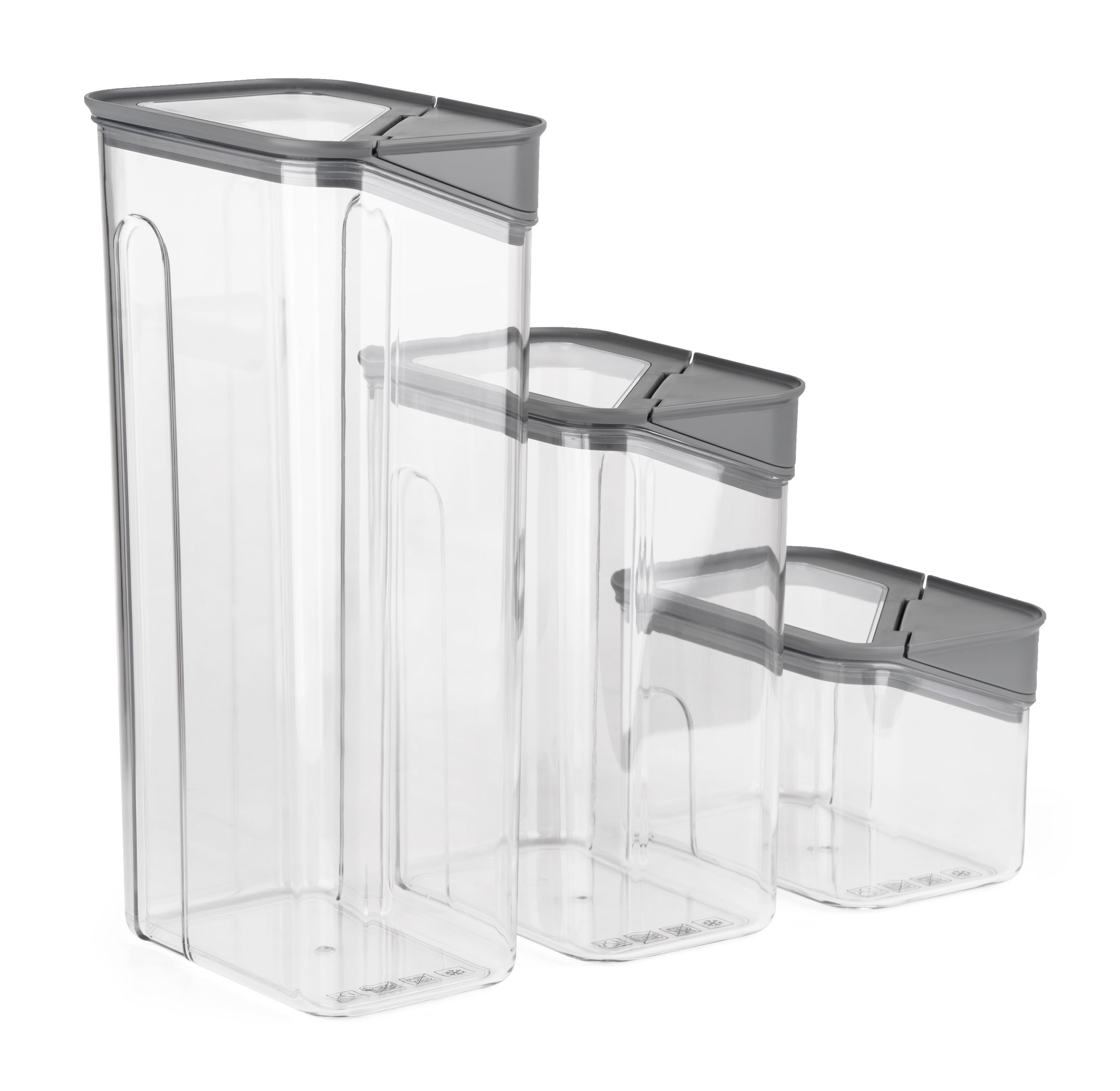 Dózy G21 oceníte při skladování mouky, těstovin, rýže i sušeného ovoce. Díky třem různým velikostem si snadno zorganizujete spíž nebo lednici podle aktuální potřeby. Vzduchotěsné víko udrží potraviny déle čerstvé, zatímco odklápěcí roh víka s násypkou umožní pohodlné a přesné vysypávání obsahu. Kvalitní plast neobsahuje BPA, proto jsou dózy 100% bezpečné pro použití s potravinami. Stohovatelný tvar oceníte v případě, že potřebujete dózy uskladnit na sebe do jedné police.