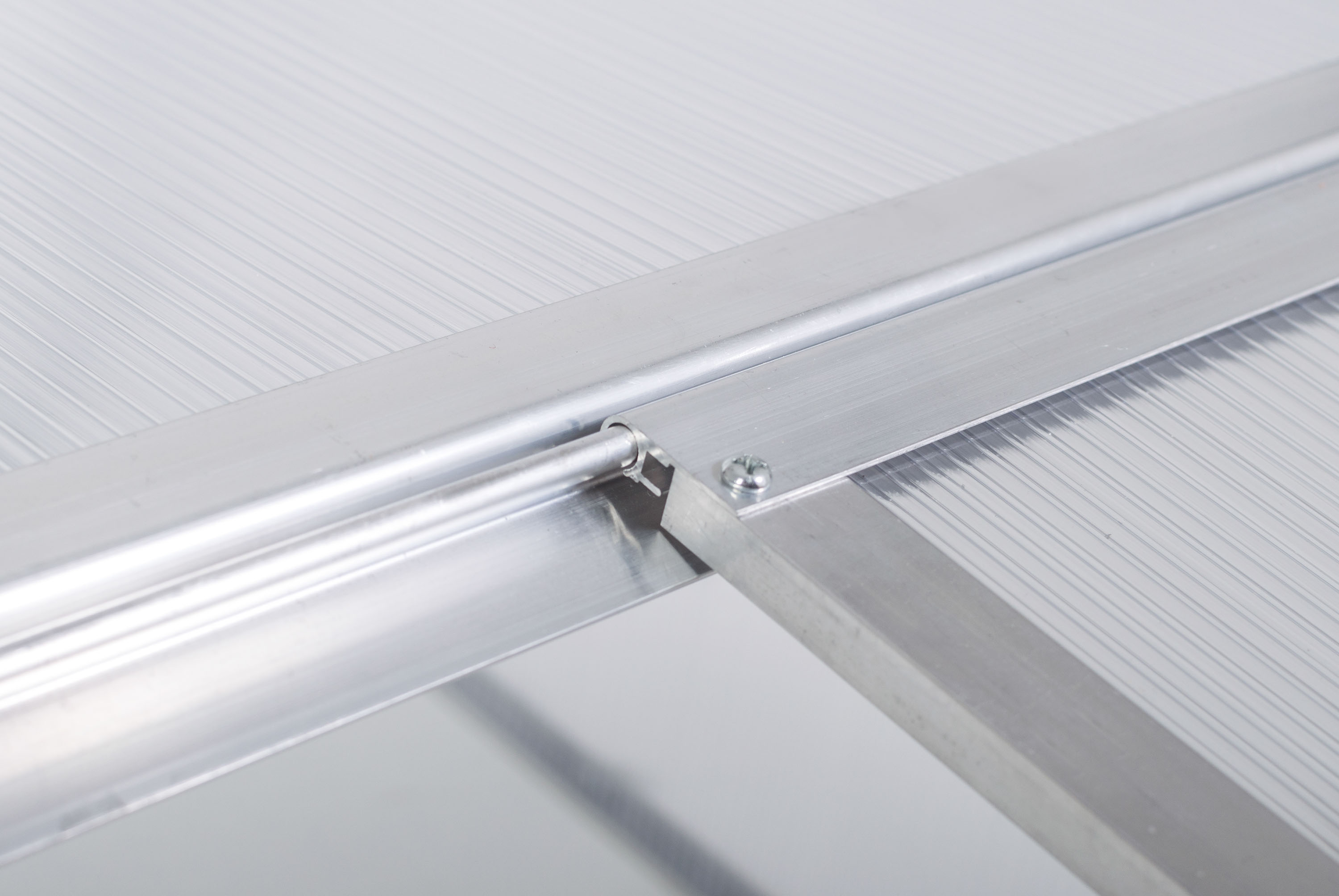 Jedna strana každé polykarbonátové desky je pokryta bílou fólií. Tato strana je chráněna proti UV záření, proto je určena jako vnější stěna natočená k slunci. Při montáži z každého okraje desky odlepte asi 2 palce ochranné fólie. Po dokončení montáže odstraňte veškerou zbývající fólii.