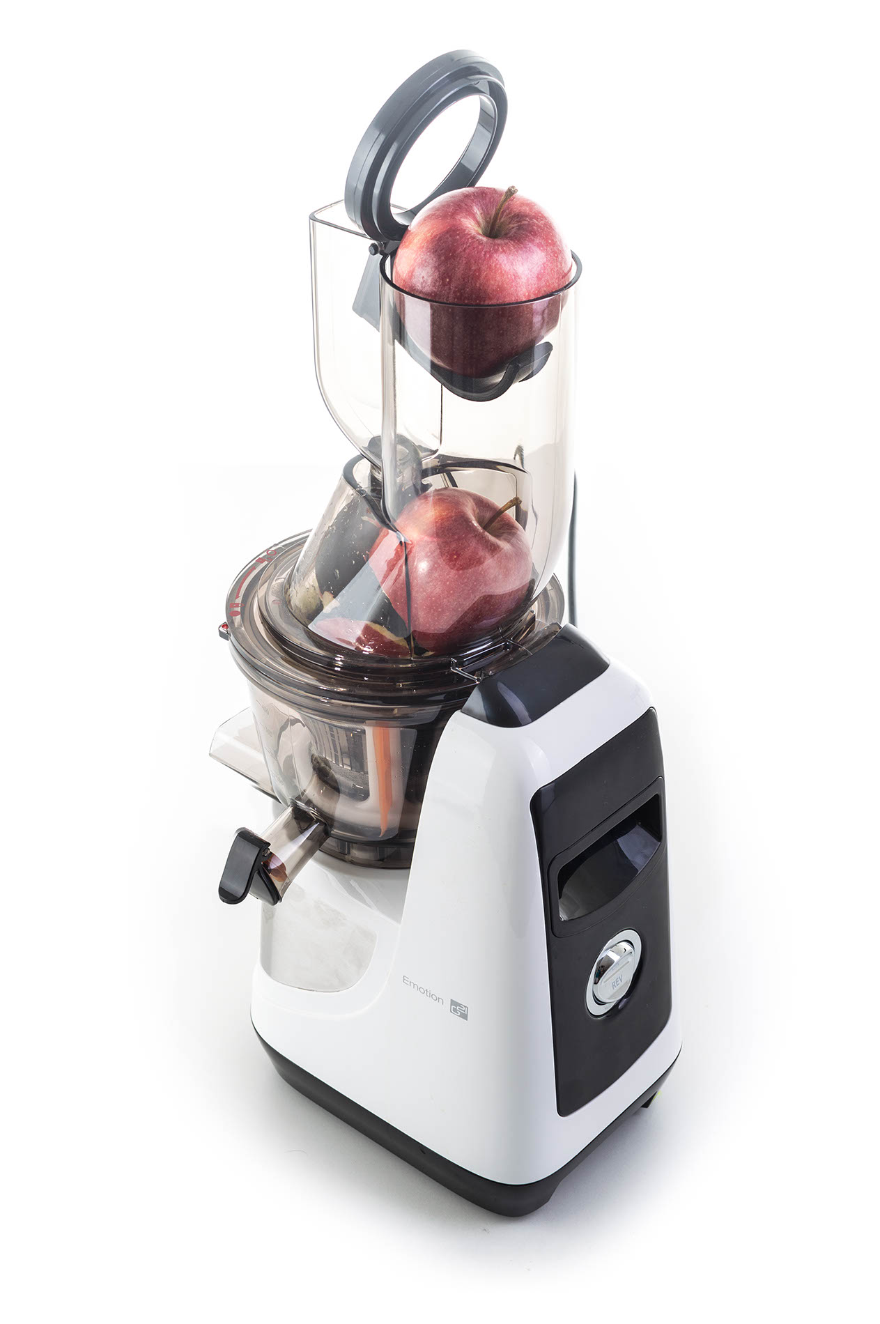 Na odšťavňovači G21 Emotion nenajdete jedinou zbytečnost. Celá obsluha spočívá v přepínání jednoho tlačítka, kterým přístroj spustíte, vypnete a přepnete na zpětný chod. Když se vám při odšťavňování zasekne kousek ovoce nebo zeleniny, nezoufejte. Přidržením tlačítka na poloze “zpětný chod” se šnek uvolní a vy můžete vesele pokračovat.