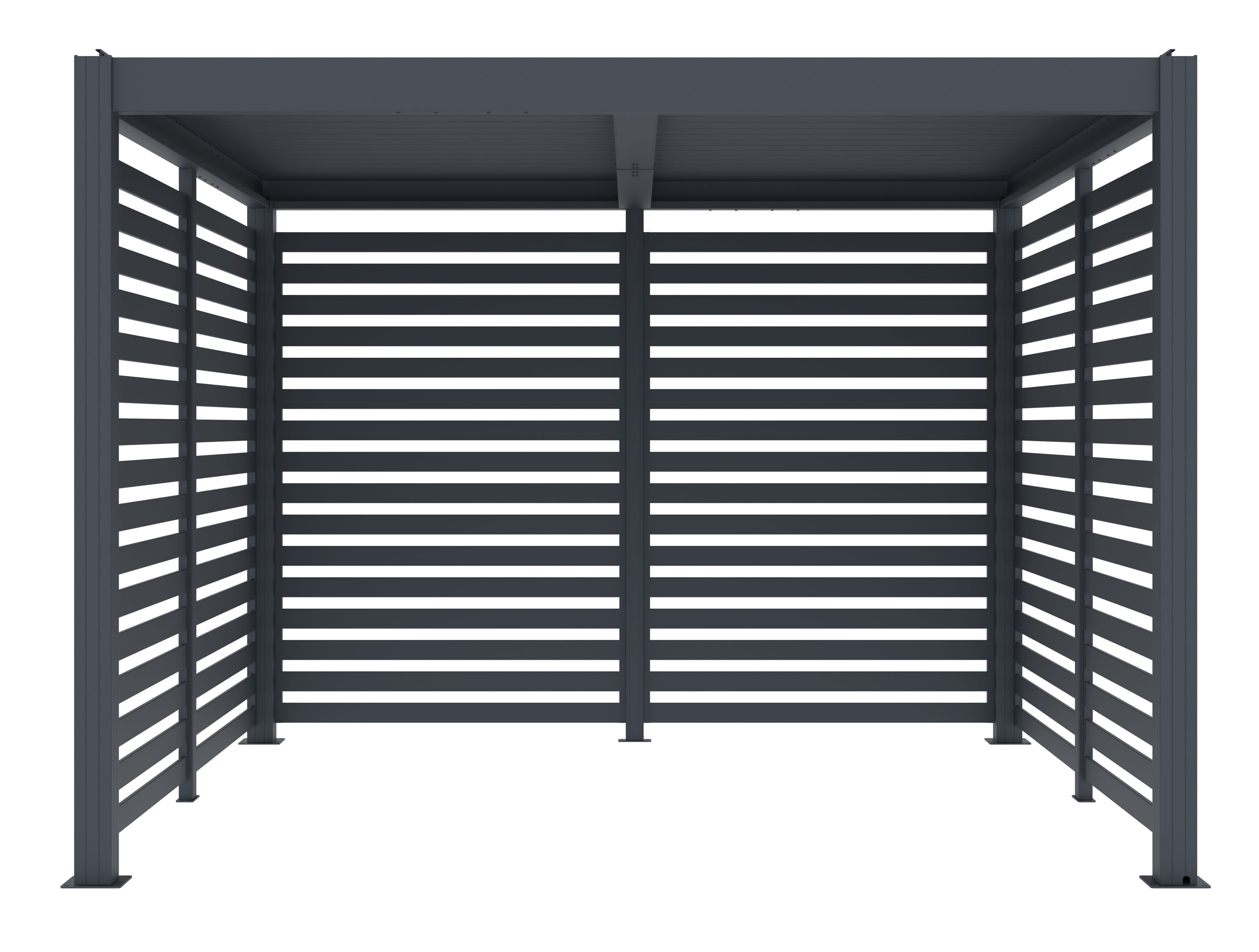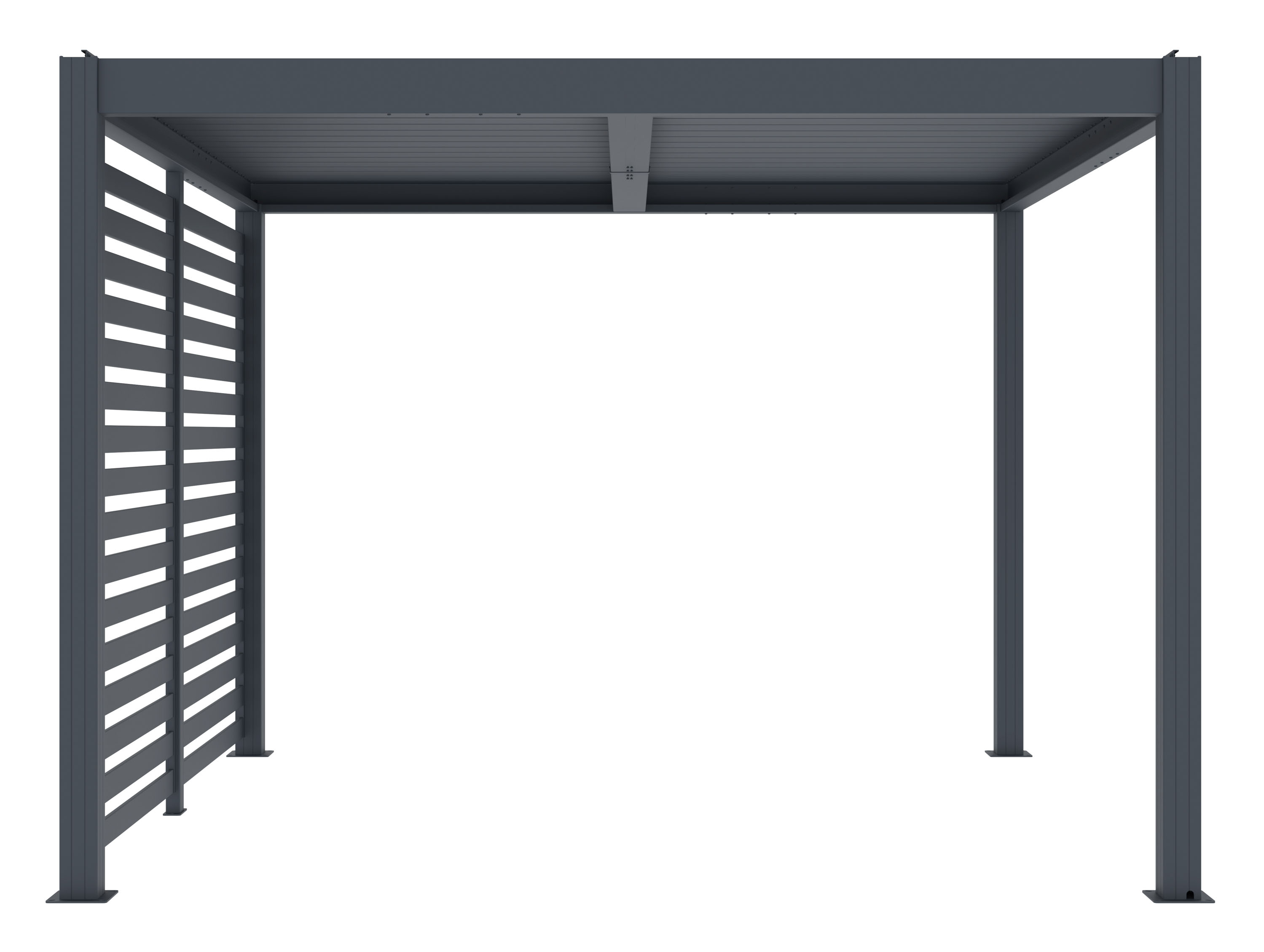 Boční stěna s otočnými pozinkovanými lamelami pro větší soukromí i ochranu před větrem, deštěm či sluncem. Stabilní konstrukce z kvalitního hliníku, snadná instalace.