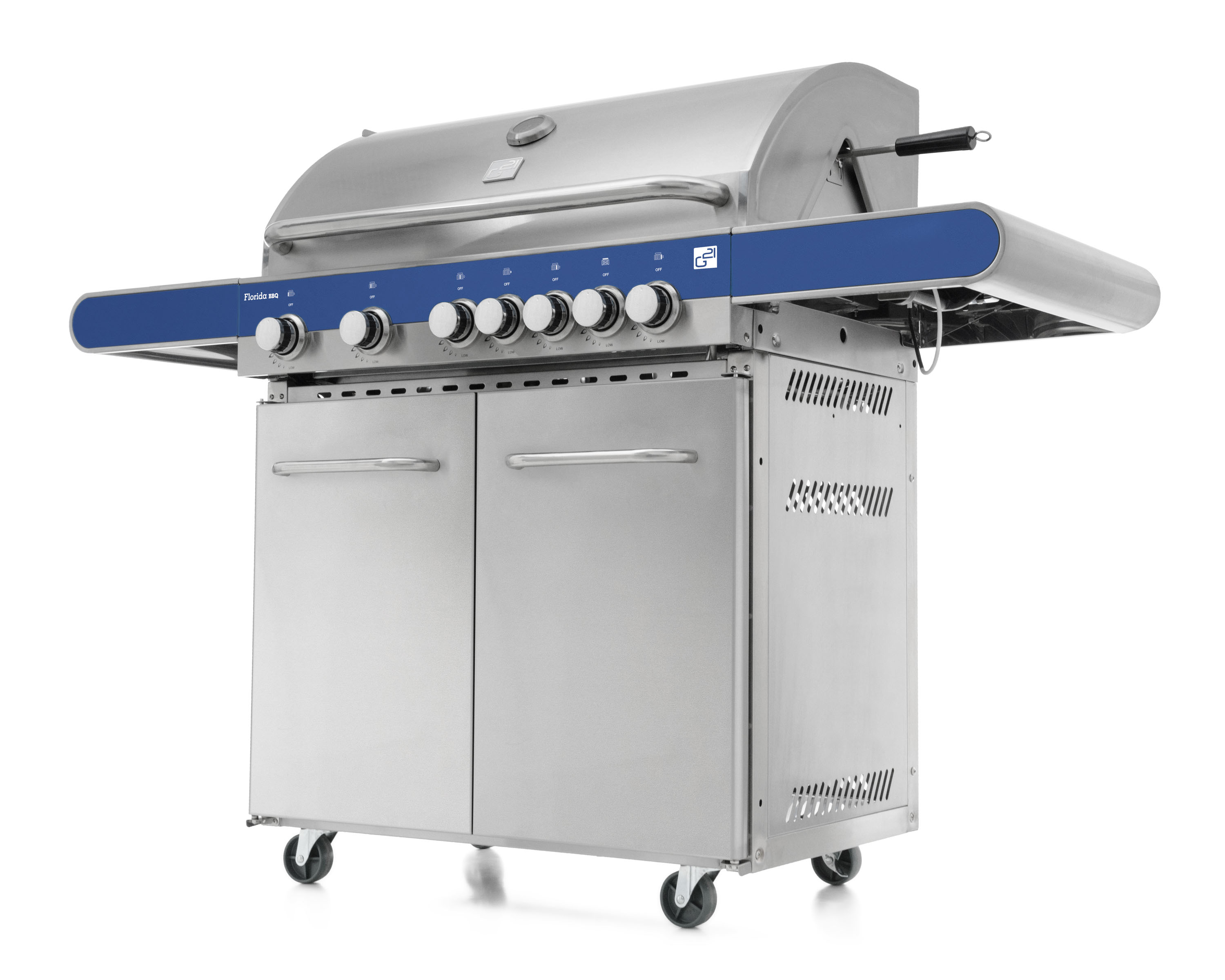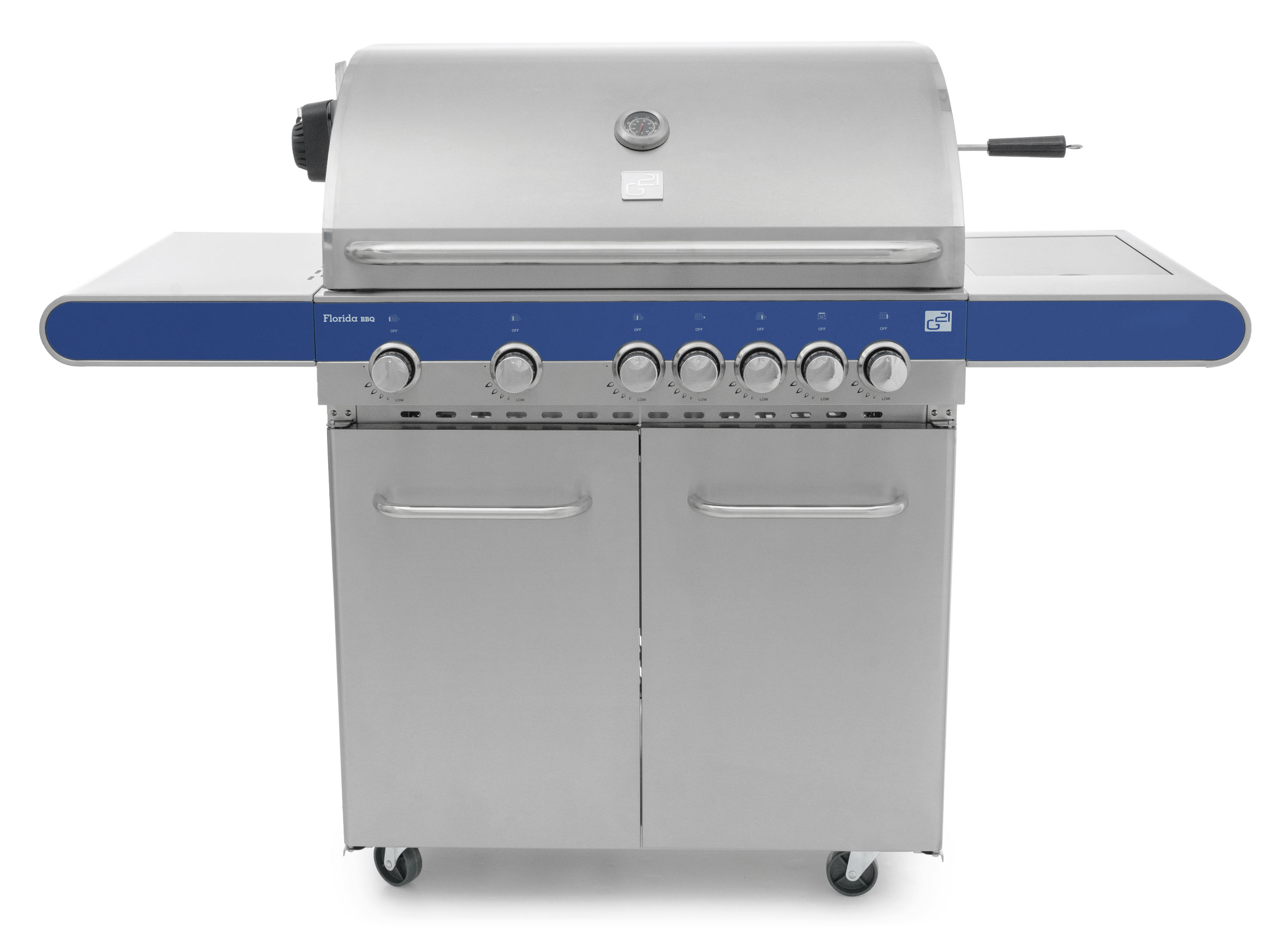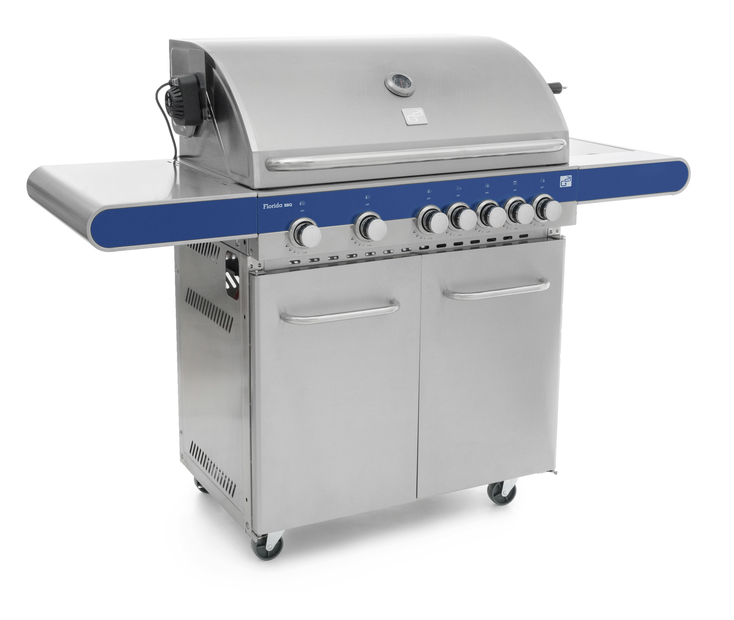 Pojízdný plynový gril G21 Florida BBQ s vestavěným teploměrem ve víku, ze všech stran uzavřenou skříňkou s dvířky na grilovací potřeby a velkou pracovní/odkládací plochou je dokonalým grilem pro každou zahradní grilovačku. Moderní atraktivní design a kvalitní materiál mu zaručují velkou oblibu mezi jeho uživateli.