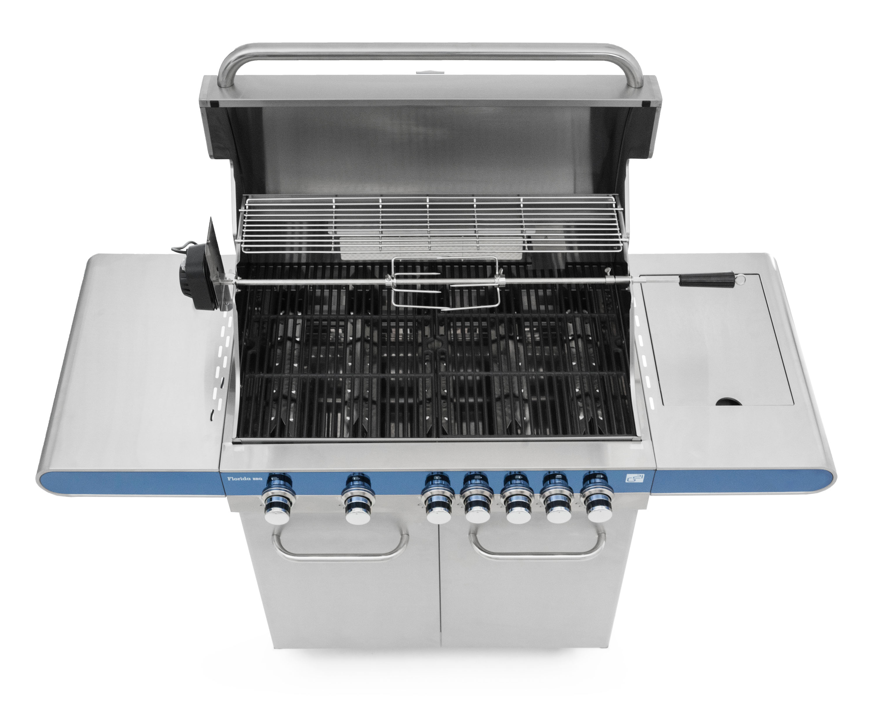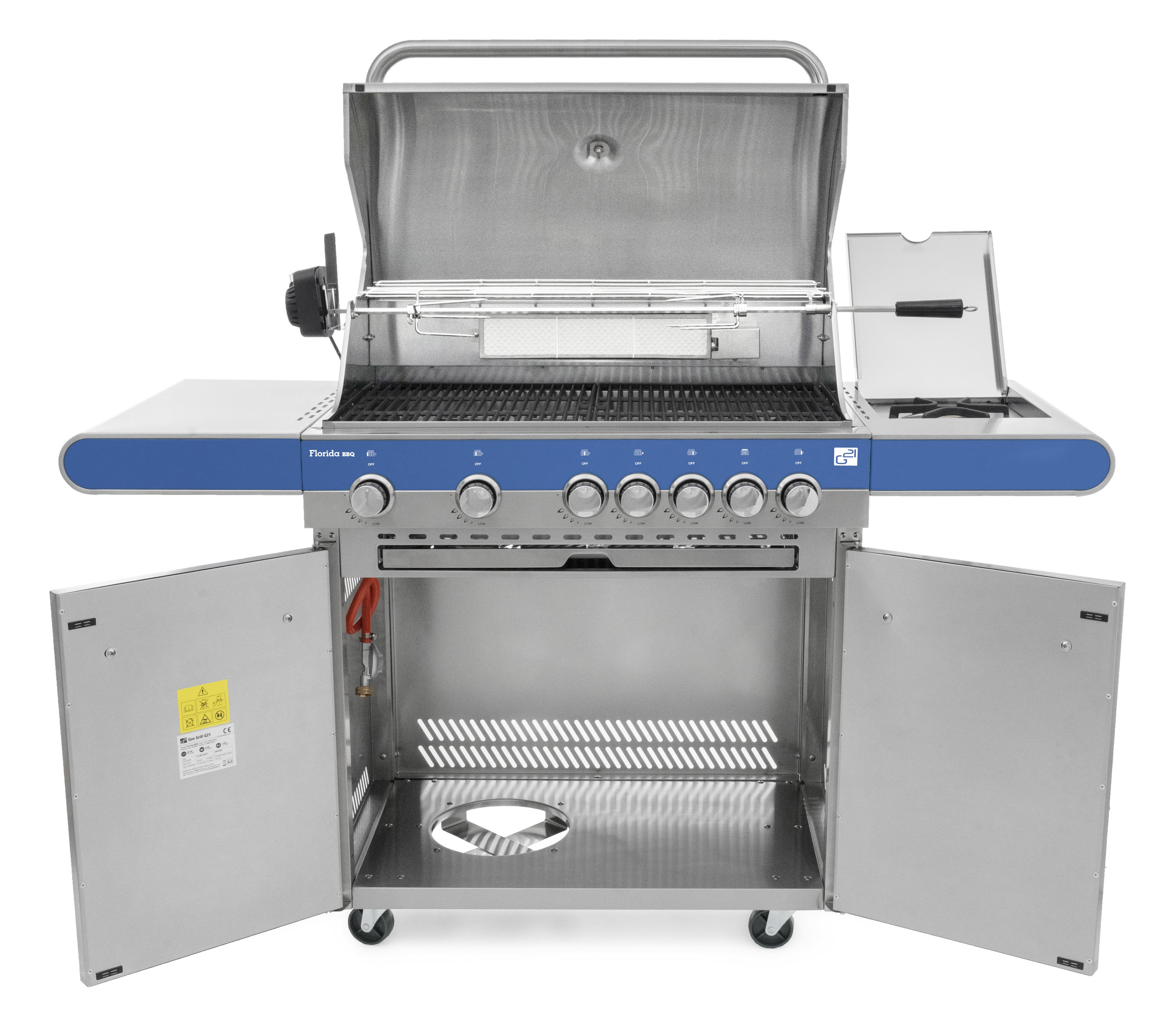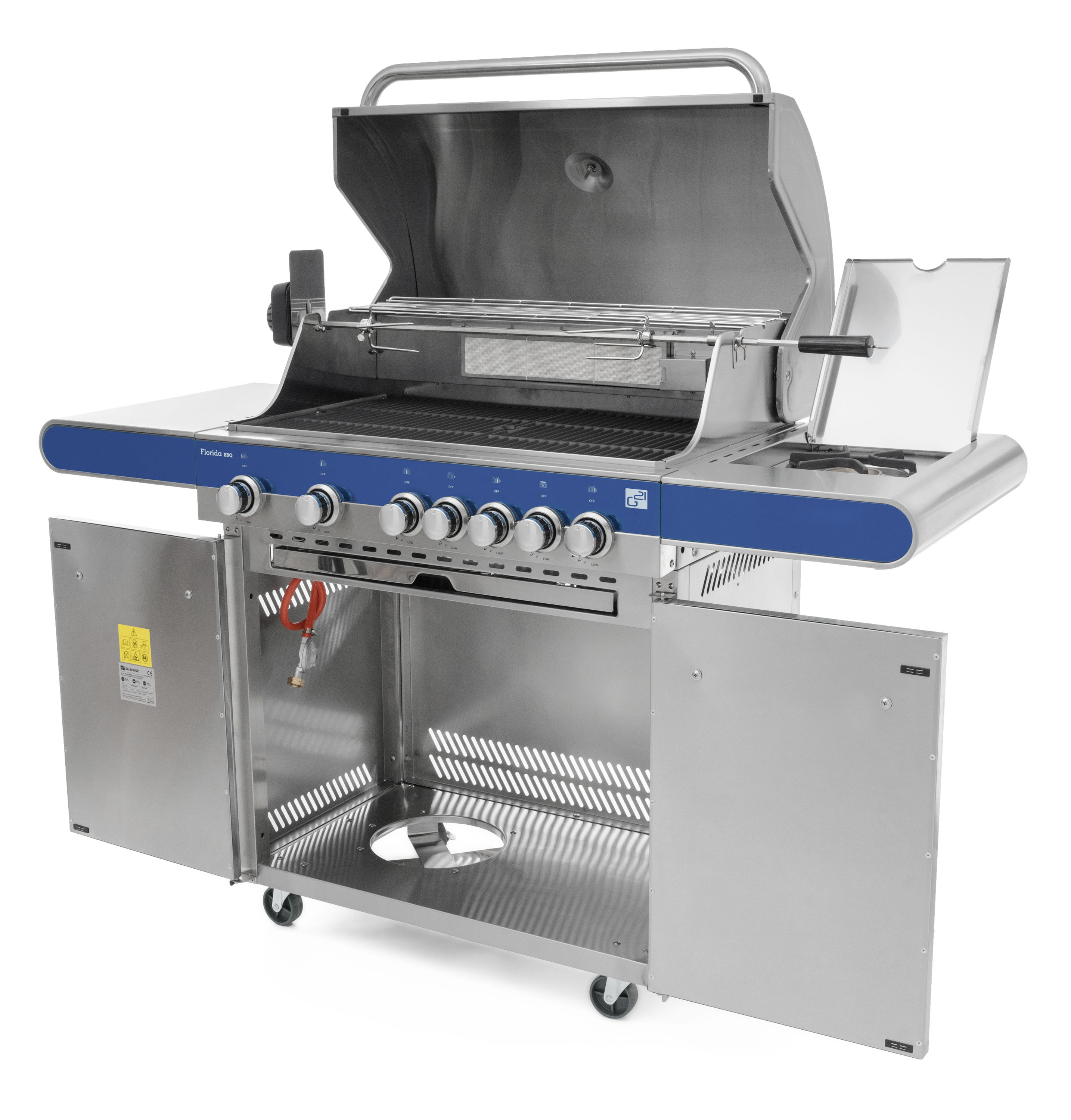 Nerezový plynový gril G21 Florida BBQ na kuře, steak či na gyros, grilovací jehla s motorem. Gril s teploměrem, bočním hořákem, dohromady 7 hořáků (7 x 4 kW), systém Flame Tamer. Úložné prostory, plynová regulace. Stříbrná barva.