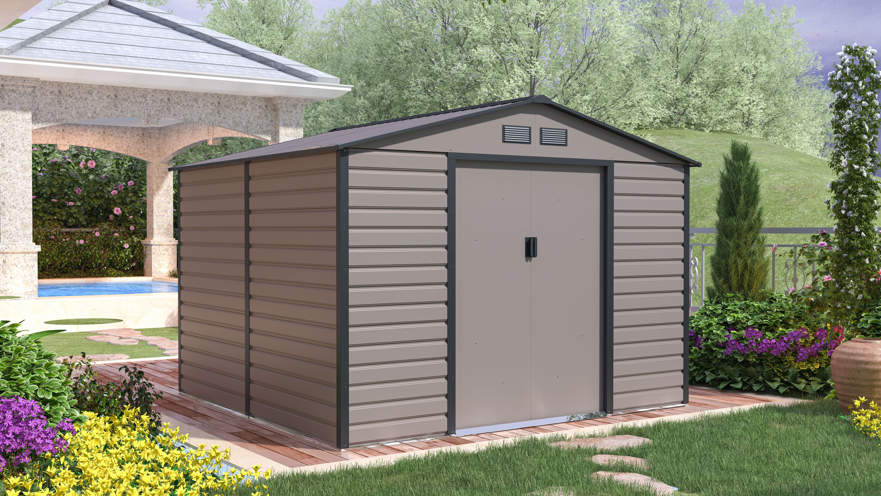 Zahradní domky na nářadí v moderním designu se hodí do každé zahrady. Vstupní dveře jsou dostatečně široké, proto do domečku pohodlně uložíte své nářadí, zahradní kolečko i venkovní nábytek.