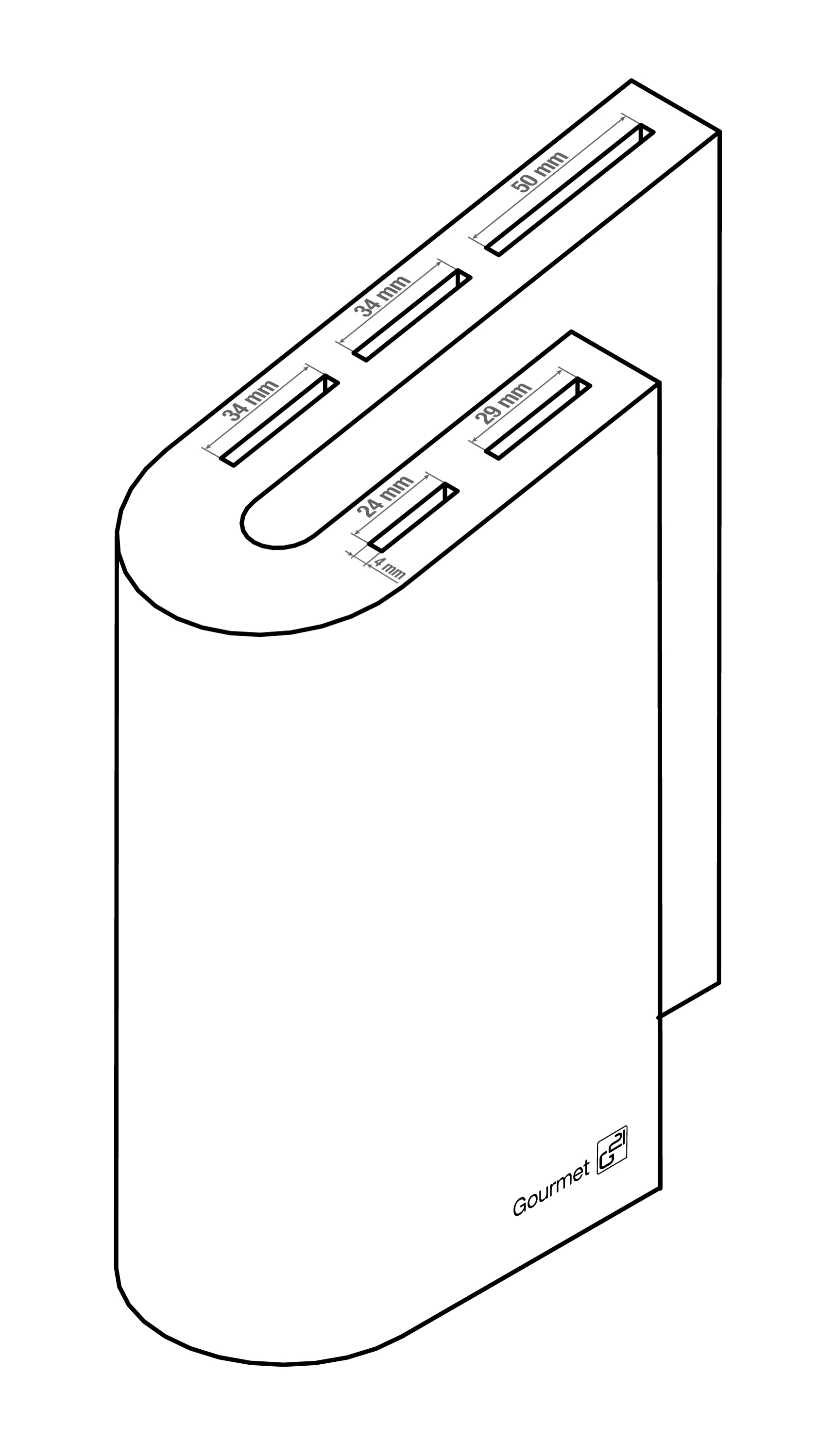 V bloku je 5 otvorů pro nože. Otvory jsou velikostí uzpůsobeny pro sadu damaškových nožů G21 Gourmet Damascus. Do stojánku však můžete umístit jakékoliv kuchyňské nože stejných rozměrů.