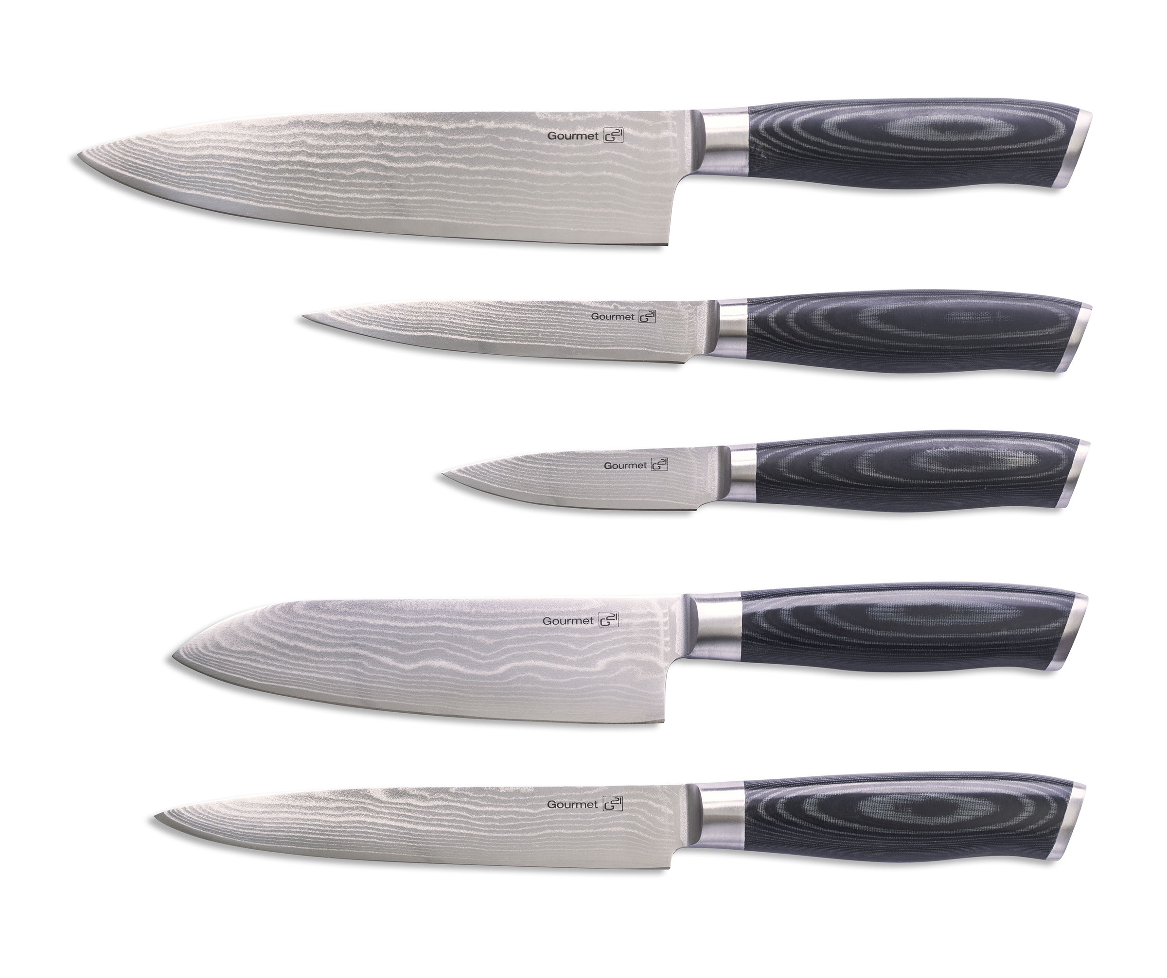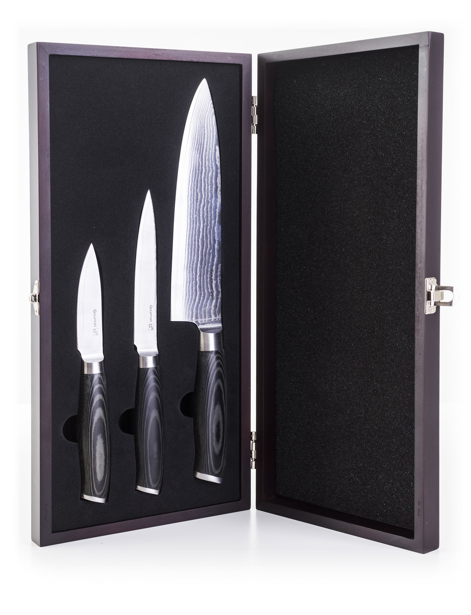 Sada tří vysoce kvalitních nožů G21 Gourmet Damascus z damascénské oceli s vámi bude krájet, ořezávat i porcovat. Čepele nožů G21 Gourmet Damascus jsou vyrobeny z kvalitní 67vrstvé damaškové oceli VG-10, rukojeti z Micarty.