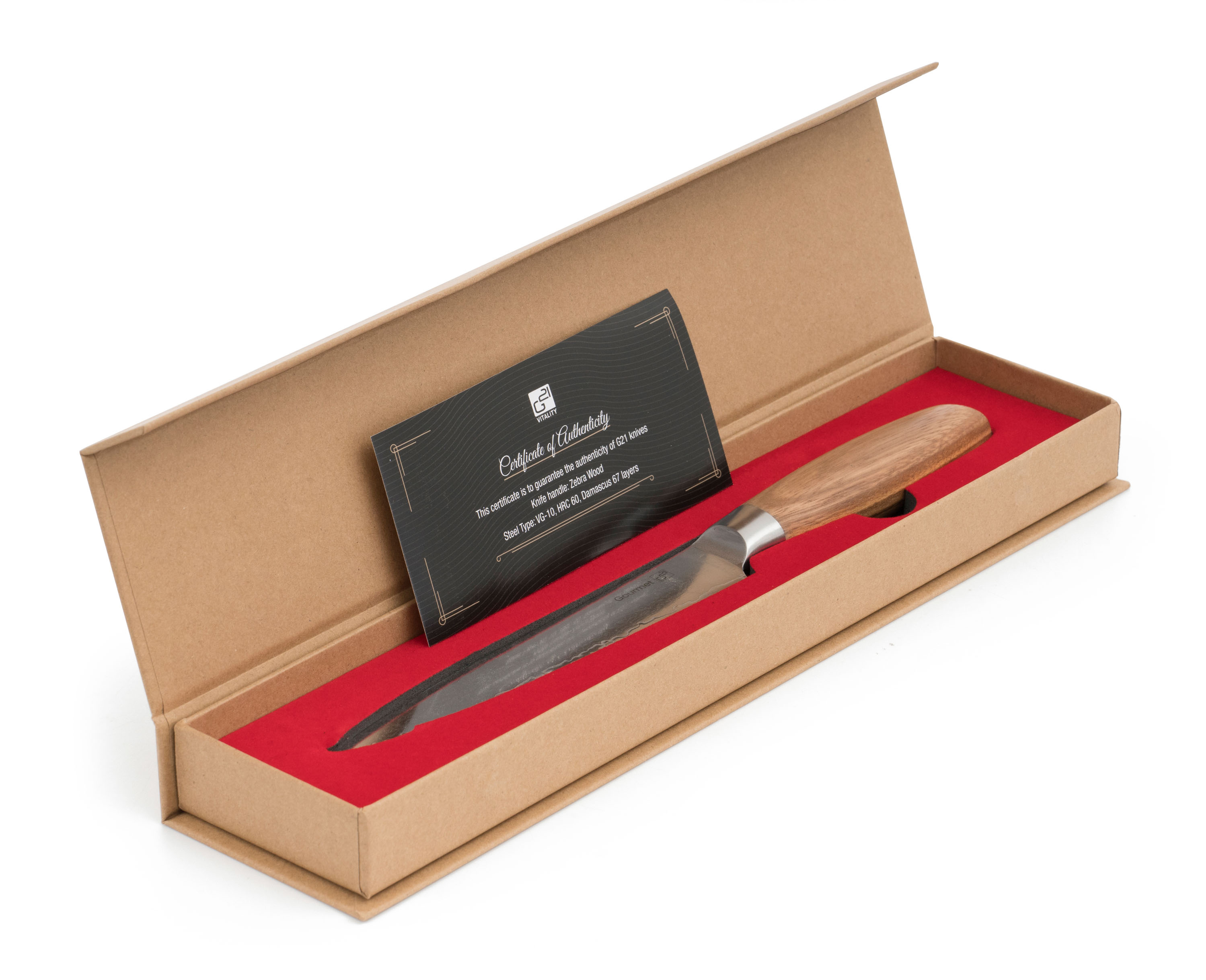 Čepel nože G21 Gourmet Damascus je vyrobena z kvalitní 67vrstvé damaškové oceli VG-10, která je velice odolná, má vysokou stabilitu a neuvěřitelně dlouhou životnost ostří. Vrstvená damascénská ocel se používala i k výrobě zbraní nebo mečů pro svou vysokou tvrdost a stálost. Damašková ocel je složena ze dvou či více různých ocelí, které jsou spojeny v jeden celek. Výsledkem je materiál odolný proti opotřebení a zároveň proti přelomení. Díky použitému materiálu je čepel nože G21 Gourmet Damascus ostrá, odolná, pevná a při správné péči vám bude sloužit i desítky let.
