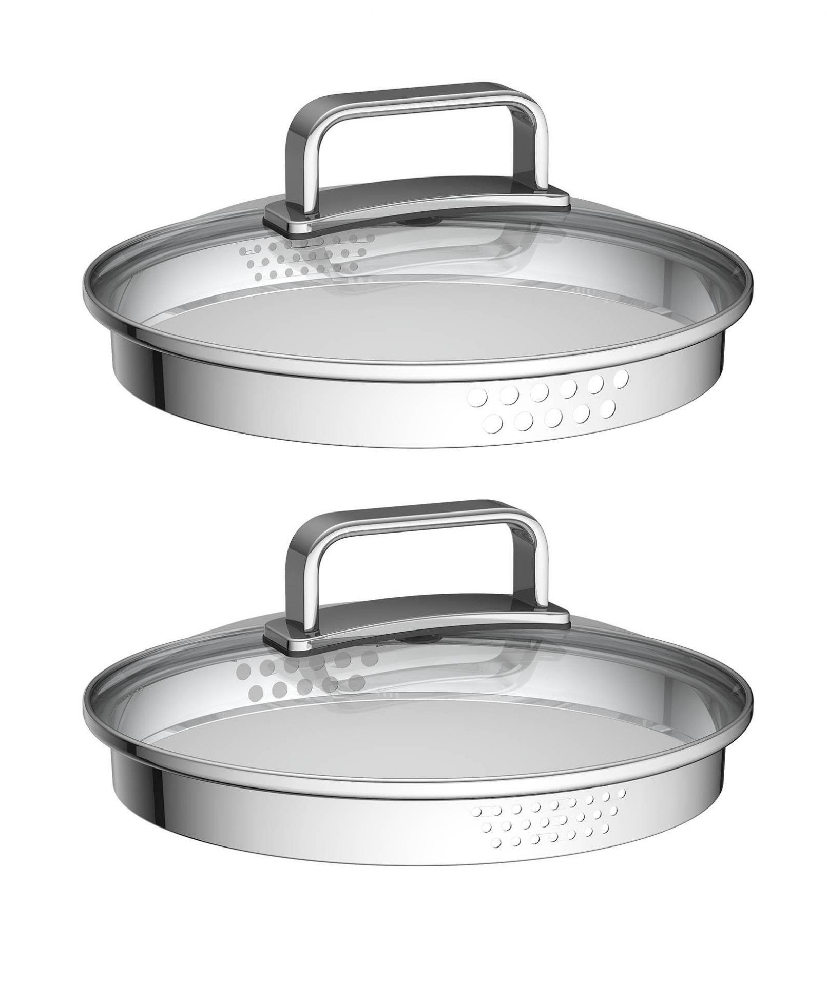 Obrovskou výhodou oproti běžně používaným hrncům jsou výparníky/cedníky, kterými jsme osadili všechny poklice v sadě. Už si nepopálíte ruce při slévání horké vody z brambor či těstovin. Pro rychlejší uvedení surovin k varu jen pootočíte poklicí a výparník/cedník se uzavře.