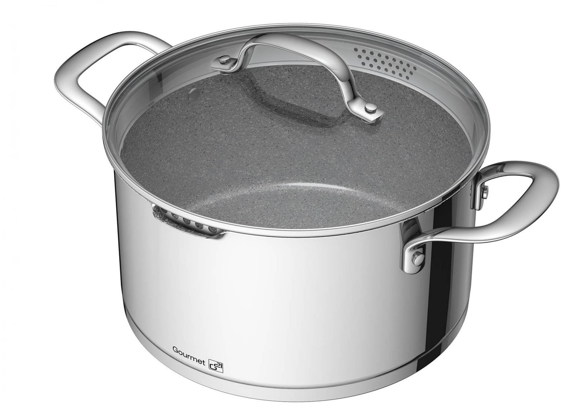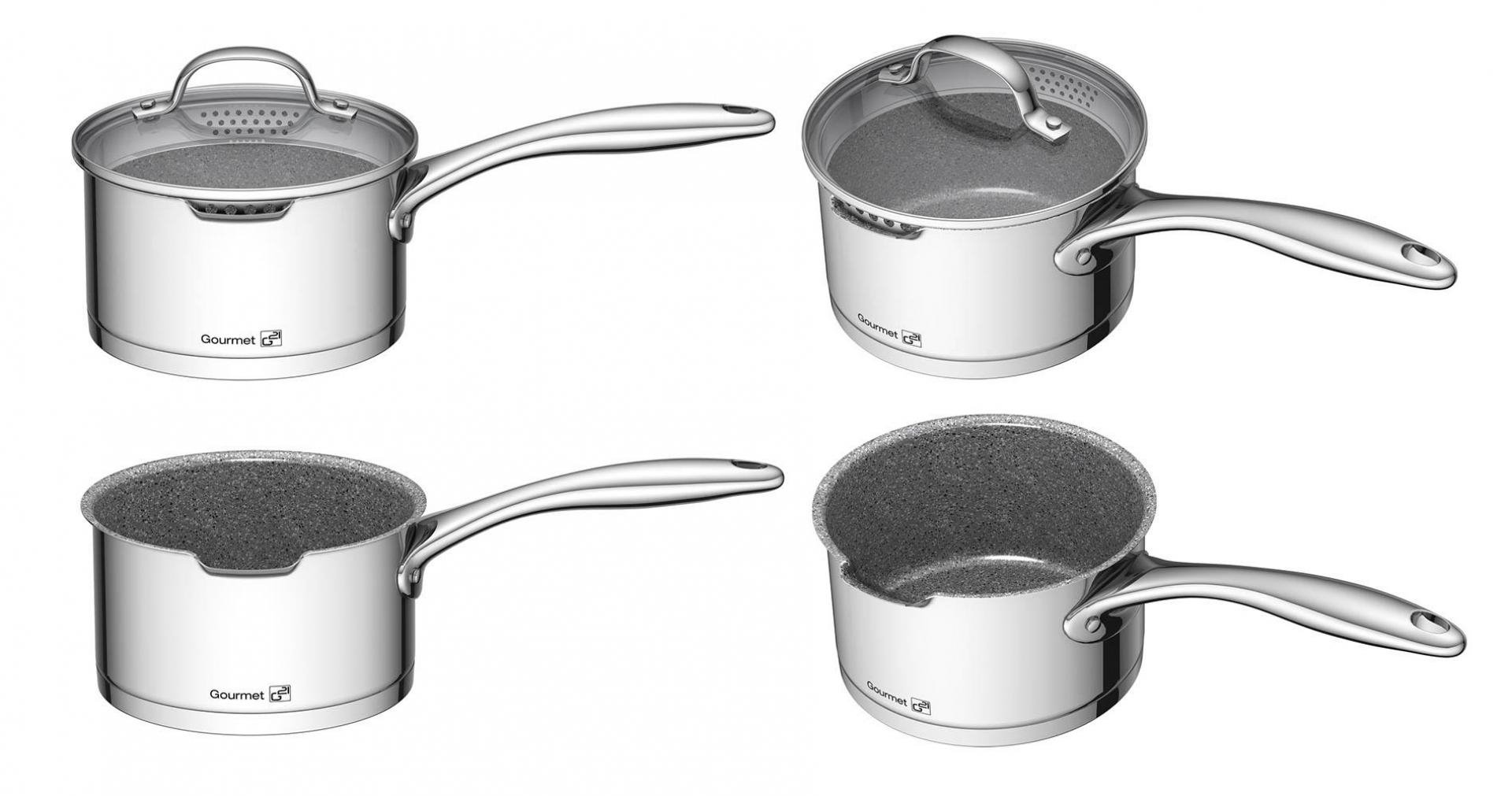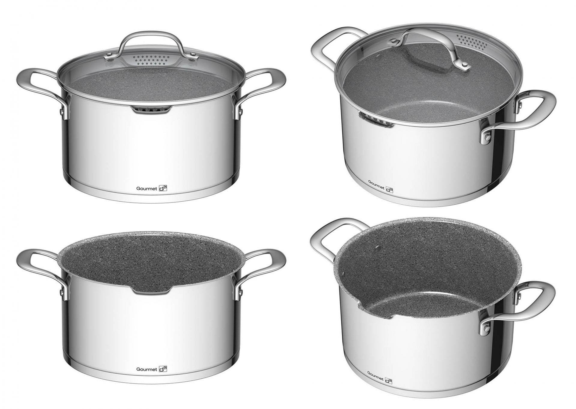 Celonerezová sada nádobí G21 Gourmet Miracle je ze speciální potravinářské oceli 18/10 CrNis s vnitřním nepřilnavým povrchem GREBLON® C3+ s vysokou tvrdostí a odolností. Všechny hrnce i pánve mají silná sendvičová dna pro dokonale rovnoměrné rozvádění tepla a jsou vhodné pro každý typ ohřevu. Díky svým jedinečným vlastnostem a dokonalému provedení je greblonové nádobí v nadčasovém designu velmi oblíbené a vydrží dlouhé roky.