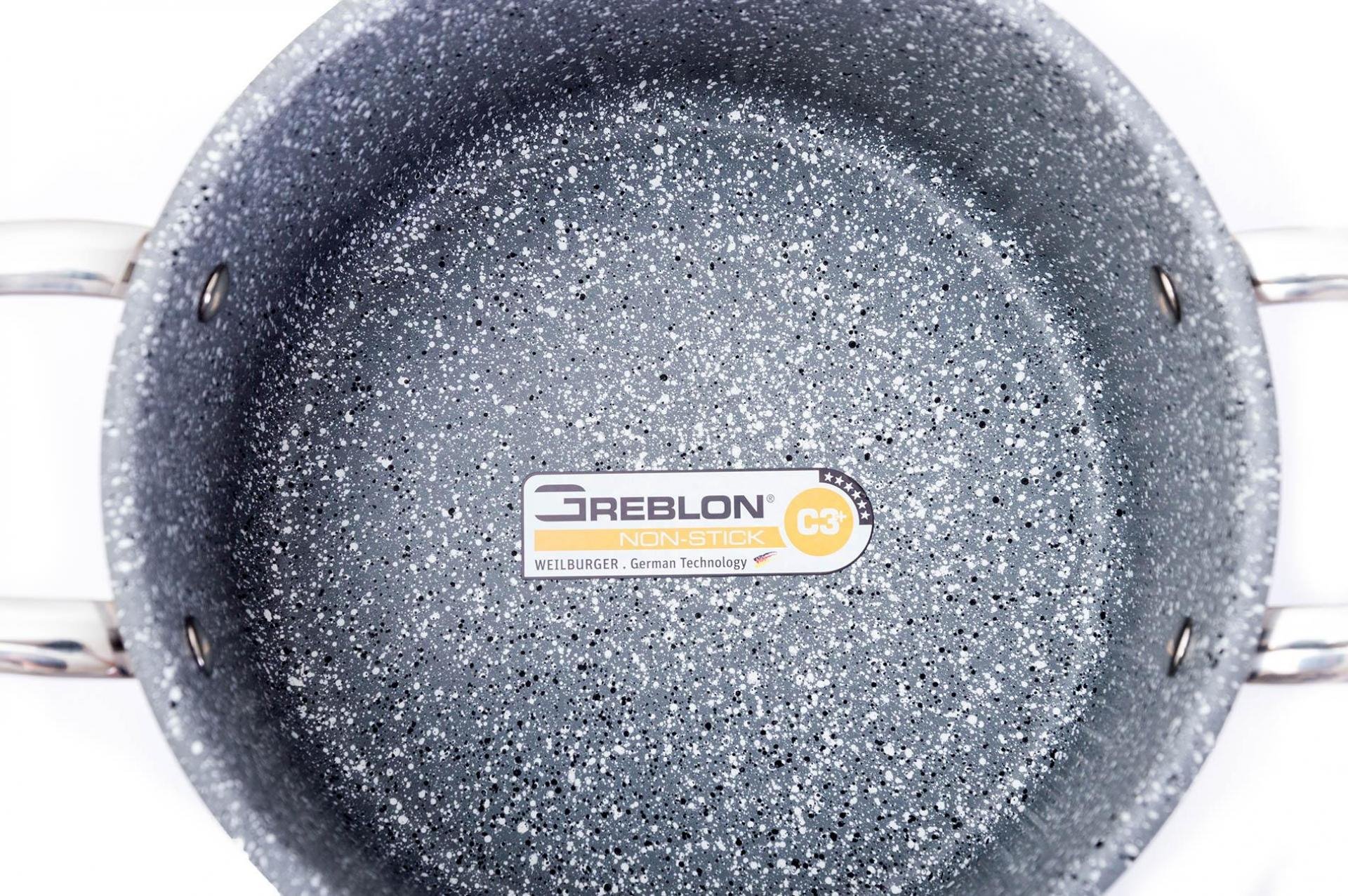 GREBLON® se vyznačuje vysokou tvrdostí. Existuje několik typů greblonových vrstev. Na pánvi G21 Gourmet Miracle najdete teu nejlepší a nejkvalitnější z nich. Třívrstvý povrch GREBLON® C3+ se sklokeramickou výztuží je mimořádně tvrdý, odolný proti poškrábání a opotřebení a hlavně - nepřilnavý. Ano, GREBLON® C3+ dává hrncům schopnost odolat přilepení surovin k vnitřním stěnám. Povrch patří do skupiny PTFE (teflon).