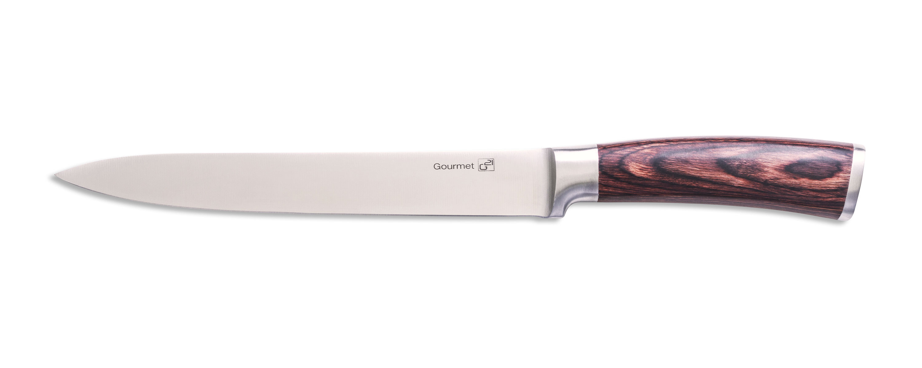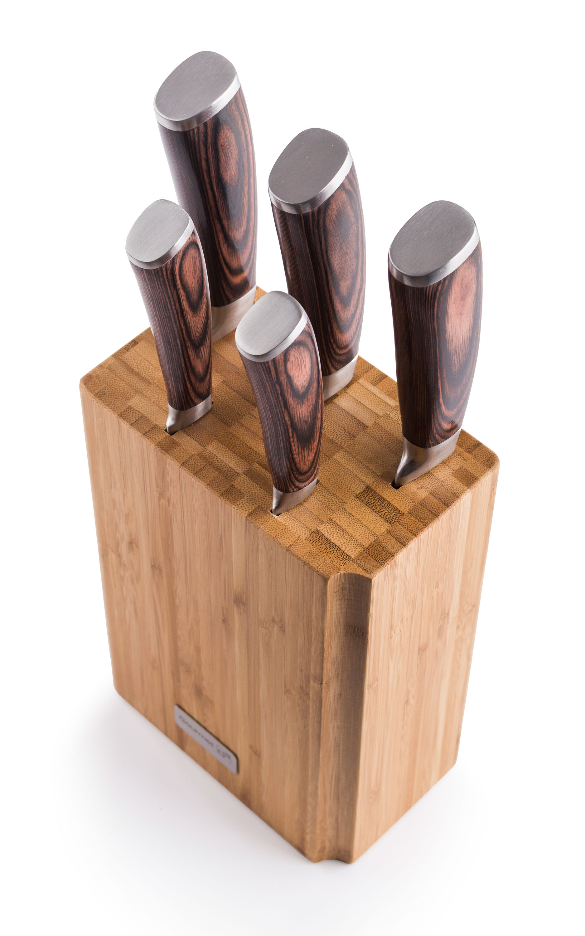 Sada pěti vysoce kvalitních nožů G21 Gourmet Stone s vámi bude krájet, ořezávat i porcovat. Čepele nožů z kvalitní oceli 5CR15, rukojeti z Pakka wood. Bambusový stojan pro správné ukládání nožů.