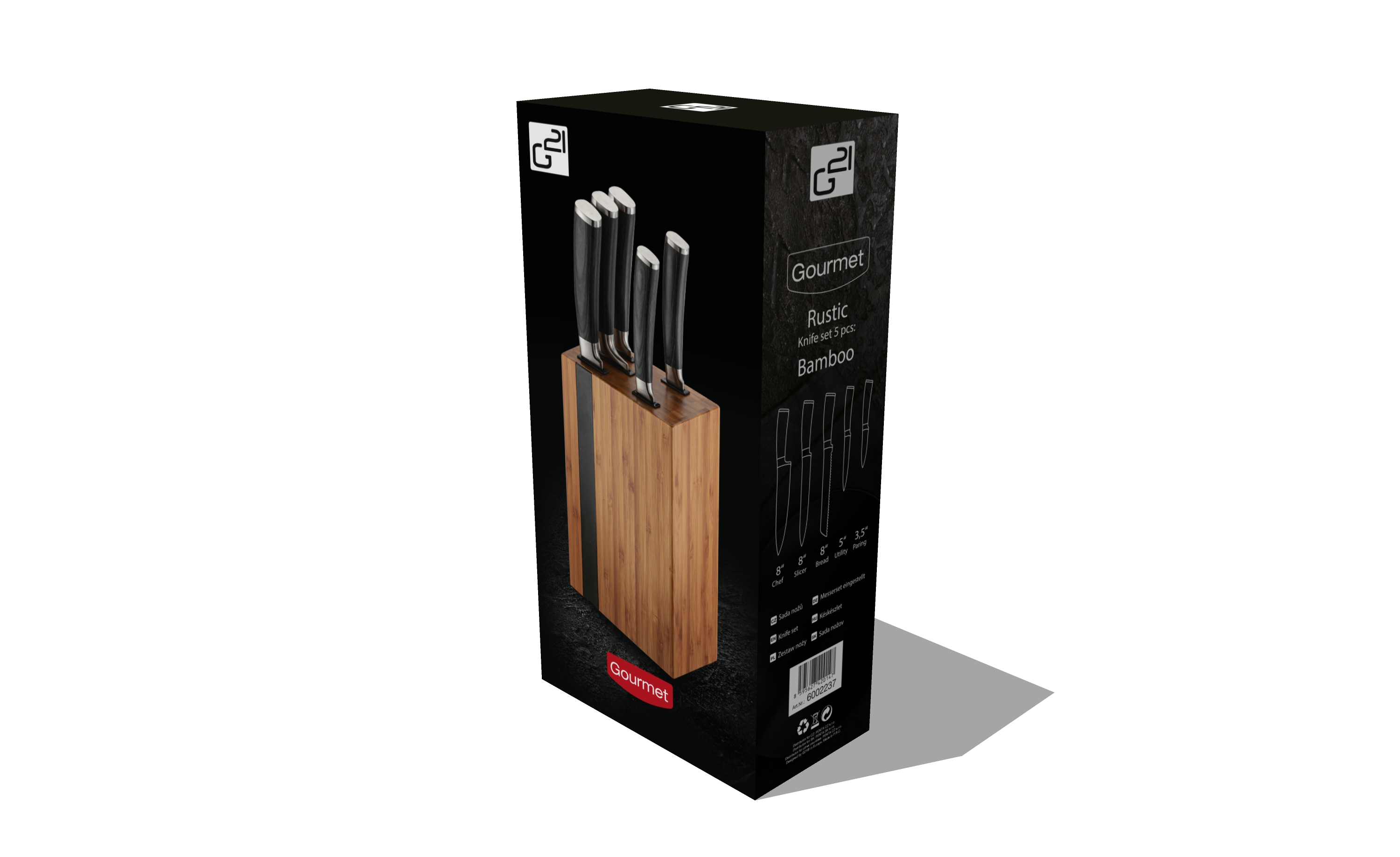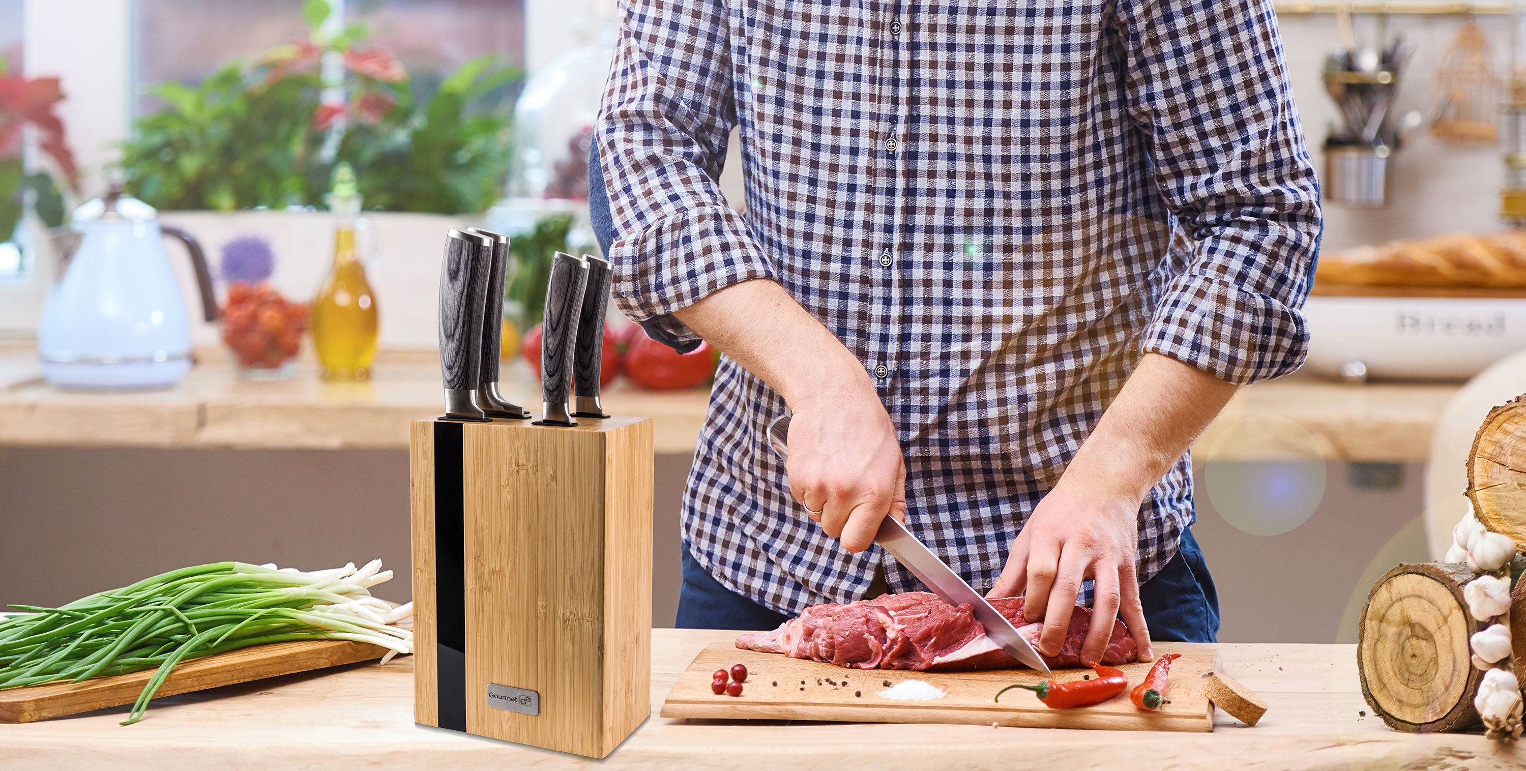 Správná péče o kuchyňské nože prodlouží jejich životnost a ostrost čepelí. Základem správné péče o nože je jejich vhodné ukládání – ideálně do stojanu na nože. Proto k sadě nožů G21 Gourmet Rustic dostanete i originální blok na nože z vysoce odolného bambusového dřeva s elegantní černou kovovou lištou na čelní straně stojanu na nože.