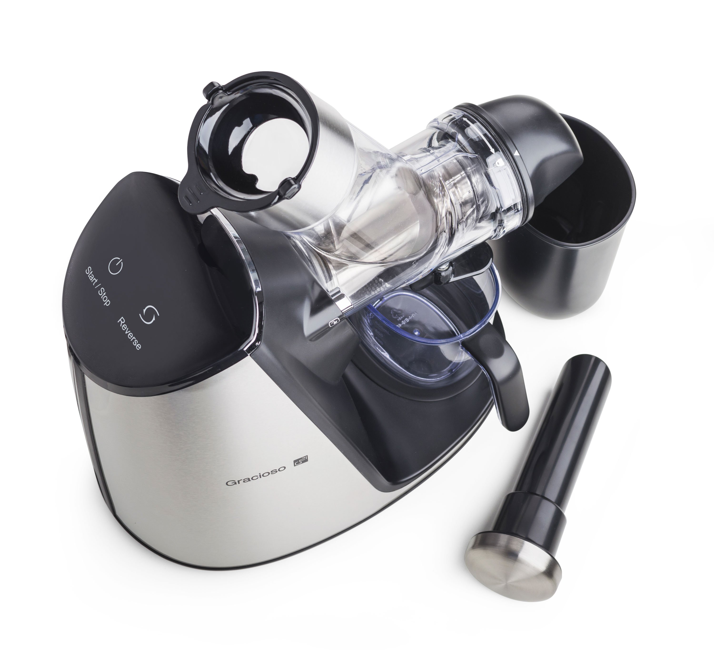 Odšťavňovač G21 Gracioso k vám nepřijde sám, vezme si sebou pomocníky. Kvalitní plastová nádoba s úchopem je uzpůsobená pro zachycení šťávy pod výpustí. Na odšťavněnou dřeň jsme vám přibalili nádobku z odolného plastu. Samozřejmě nechybí ani praktické pěchovadlo.