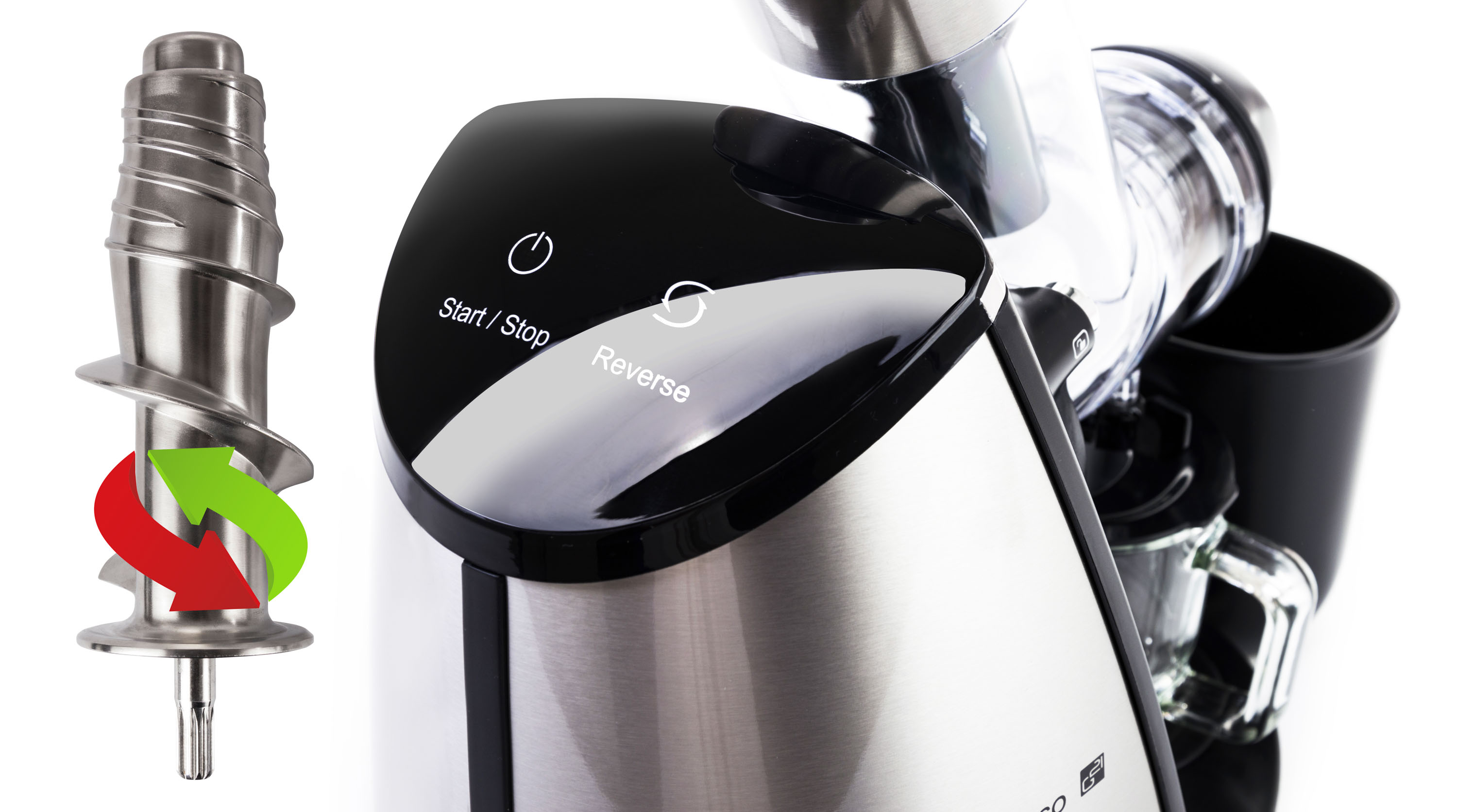 Ovládání odšťavňovače spočívá v přepínání dvou dotykových tlačítek. Jedním tlačítkem přístroj zapnete a vypnete a druhým přepnete na zpětný chod. Když se vám ve šneku zasekne kousek ovoce či zeleniny, nezoufejte. Přepněte na zpětný chod, šnek se uvolní a můžete pokračovat v práci.