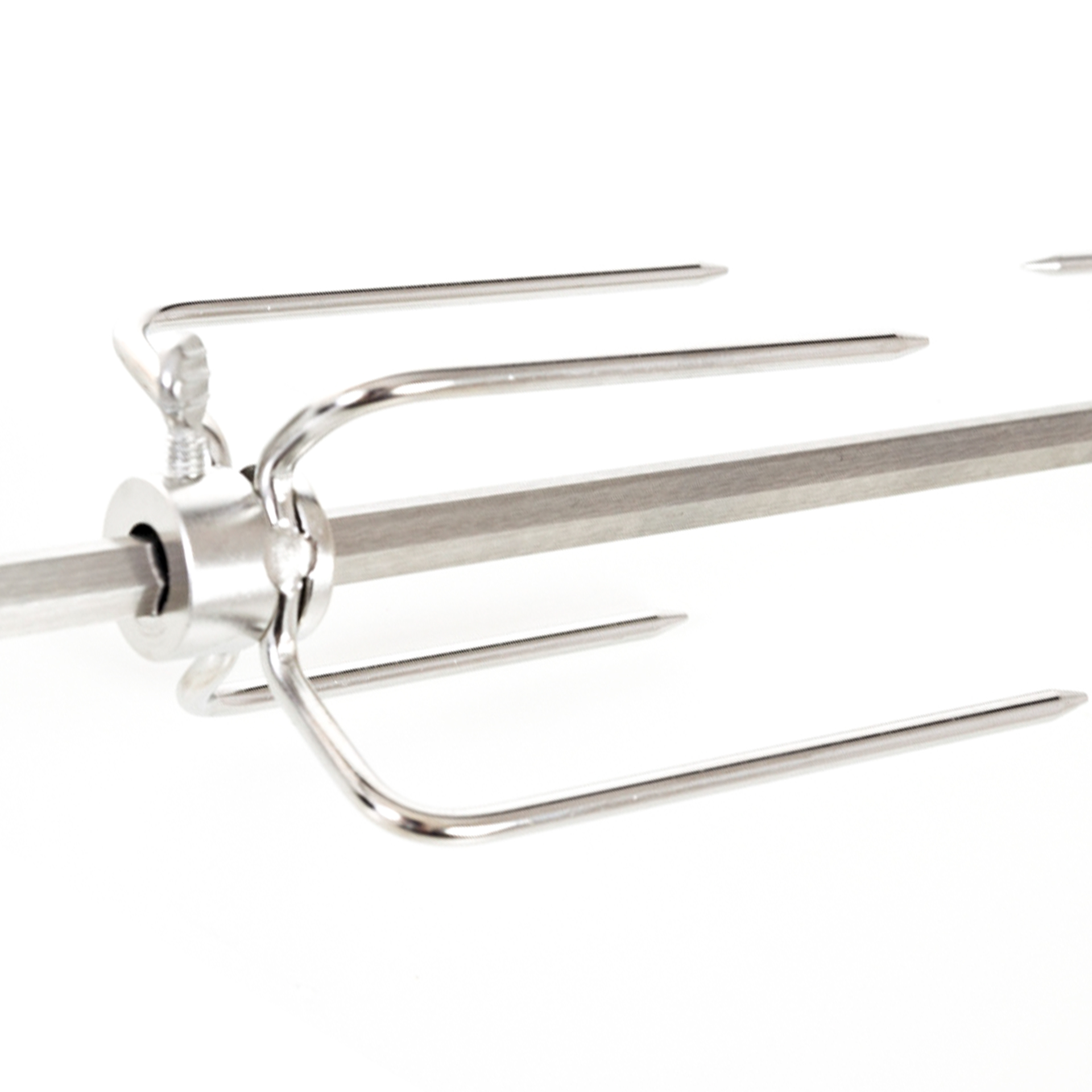 Grilovací jehla s motorem je vyrobena z nerezové oceli a z obou stran je opatřena čtyřmi jehlicemi s aretačními šrouby, díky kterým si můžete jehlice nastavit podle vlastní potřeby.