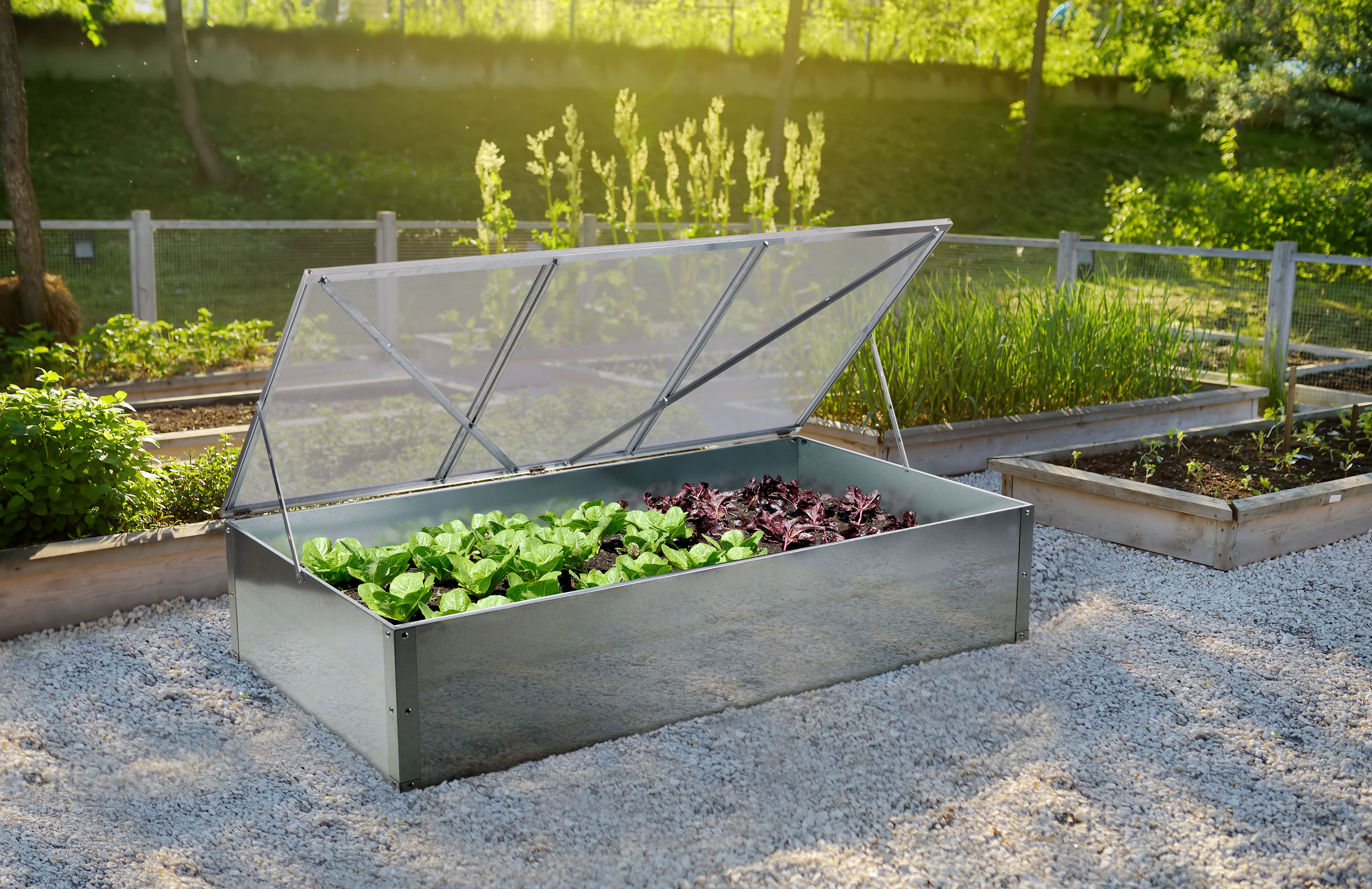 Horní aluminiový rám s výplní z kvalitního 4mm polykarbonátu vám při sadbě a péči o zasazené rostliny umožní pohodlný přístup díky variabilnímu nastavení v požadované poloze.