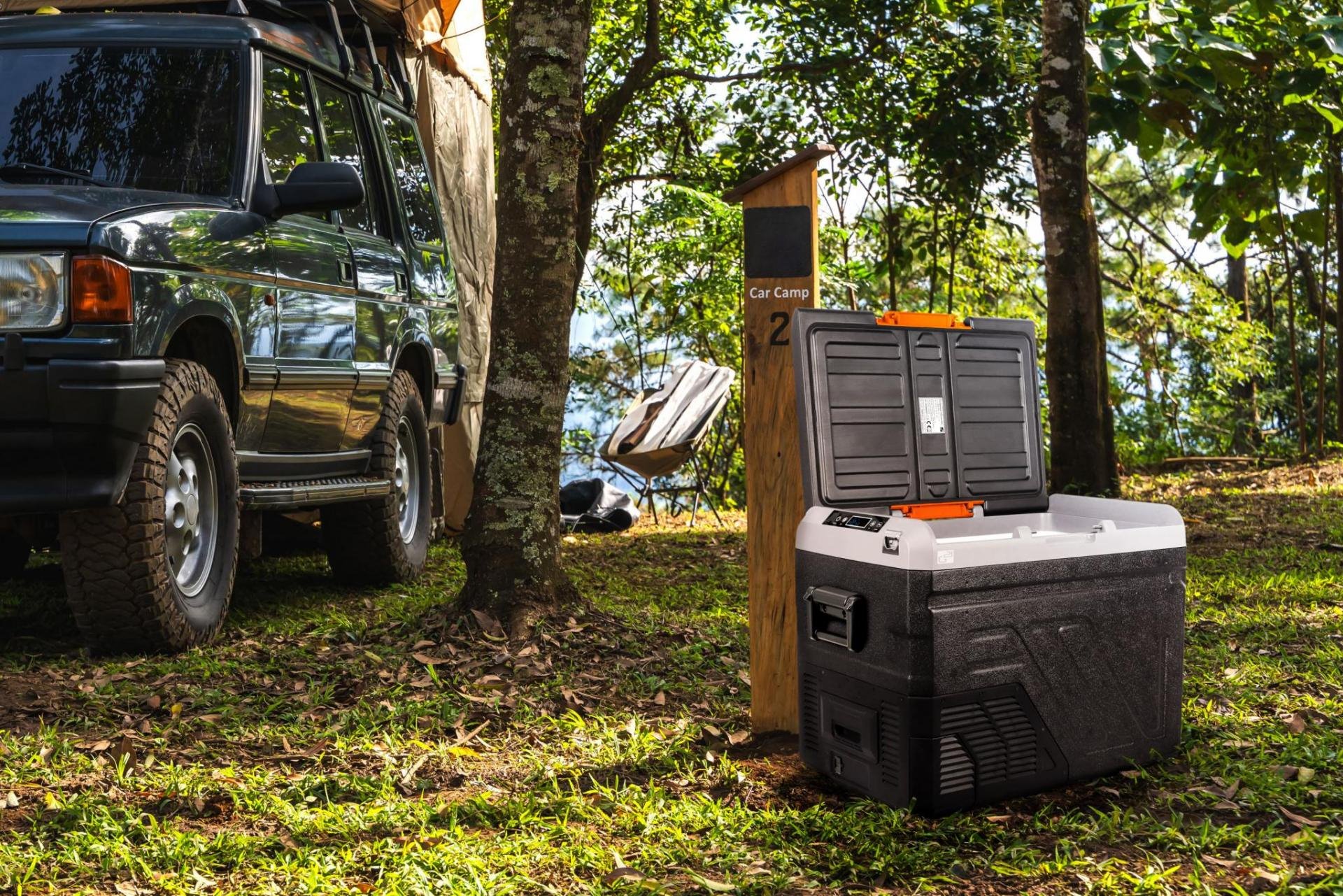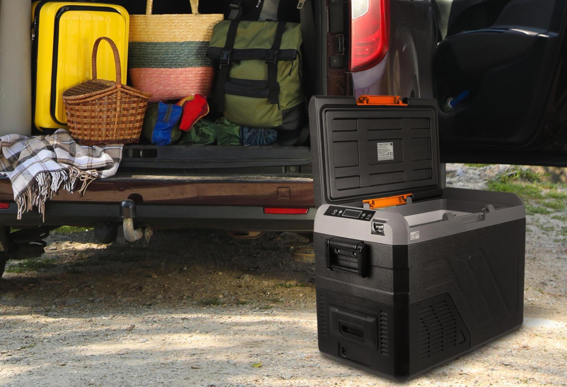 Kompresorová autochladnička s využitím v autě i v domácnosti, připojovací kabely na 12/24 V a 240 V jsou součástí balení. Objem 50 l, oboustranně otevíratelné víko, výstupy USB a USB-C, otvírák na lahve.