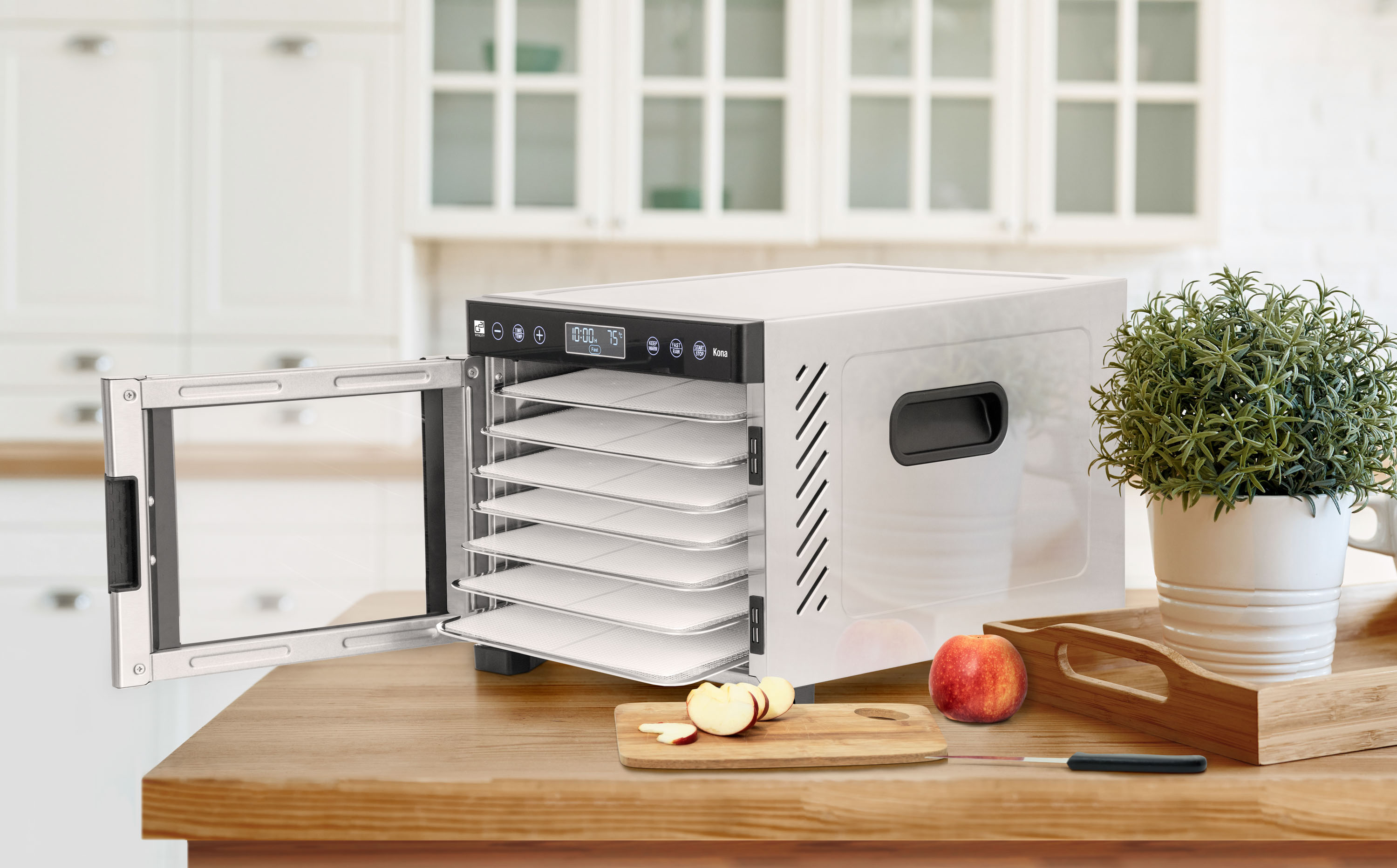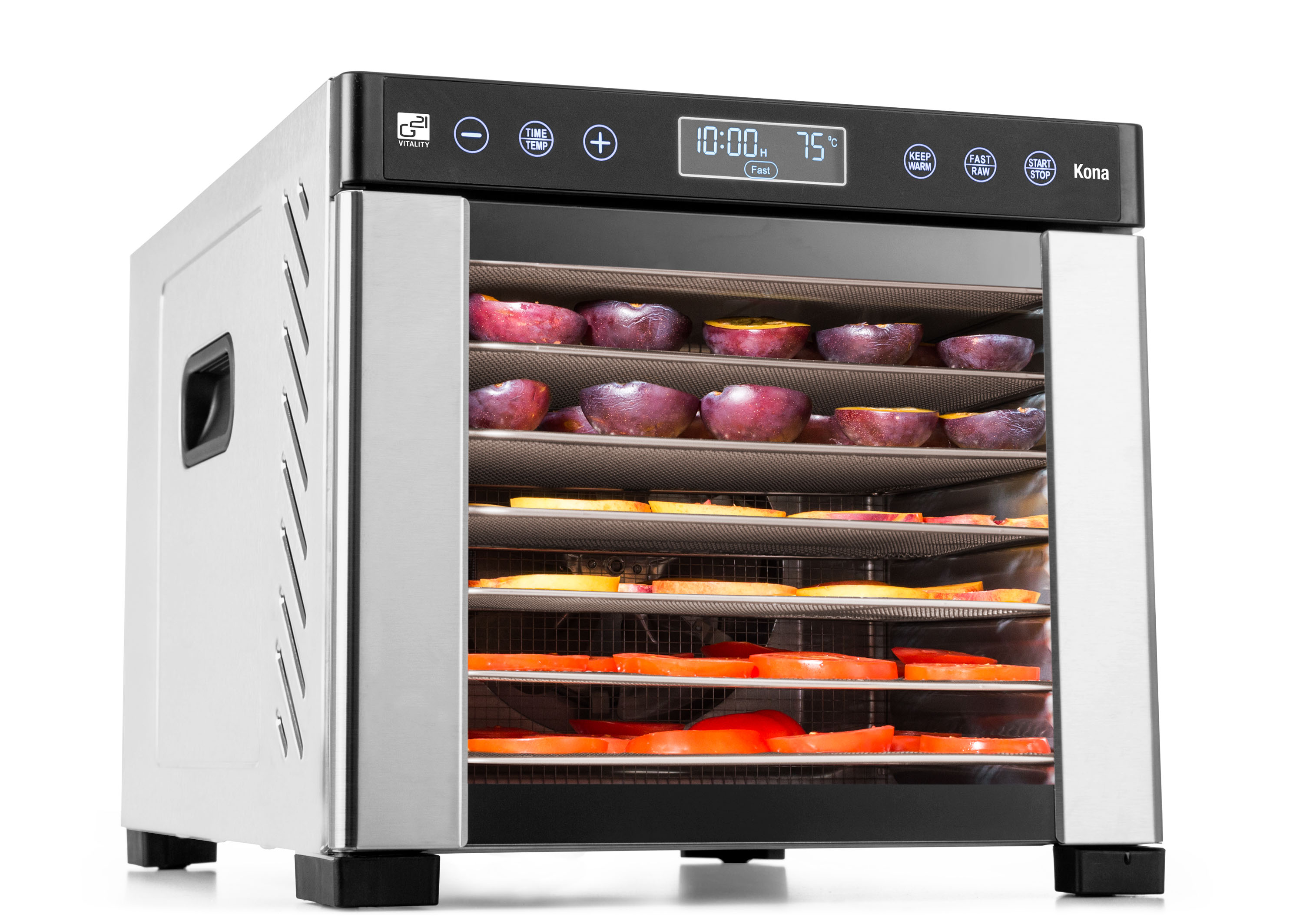Sucho už má v názvu a svými schopnostmi i výkonem vás tato kompaktní sušička rozhodně překvapí. Pokud jste si při výběru sušičky potravin došli k názoru, že hledáte spíš menší sušičku, zato ale s profesionálními vlastnostmi i provedením, Kona je přesně tou pravou sušičkou ovoce, zeleniny, hub, masa i bylinek pro vás.