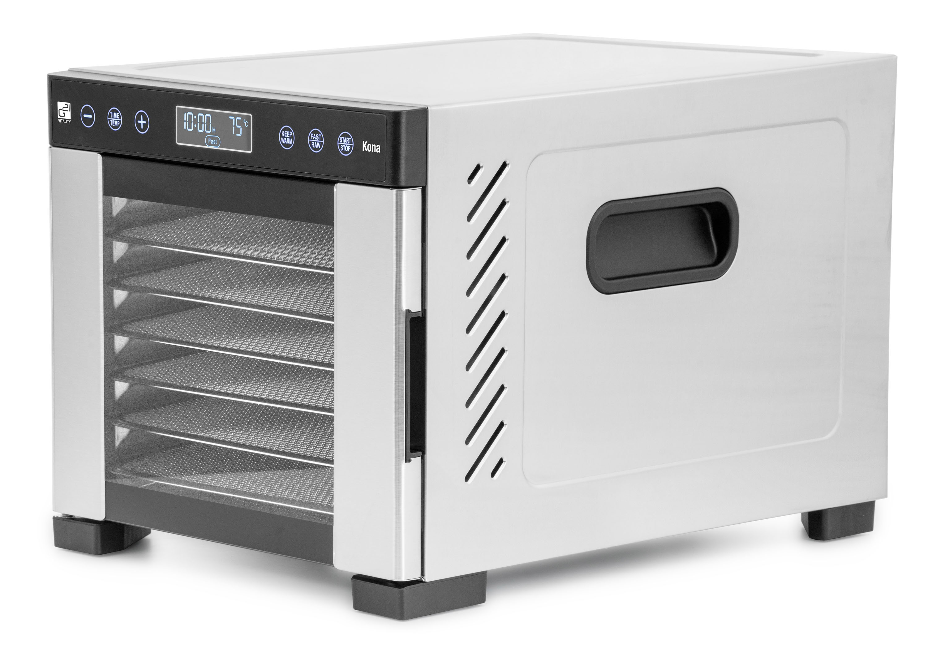 Zatímco u jiných sušiček v této cenové kategorii je ventilátor umístěný na spodní části, takže plata se sušenými surovinami musíte pro lepší usušení přesouvat, Kona je svým provedením o třídu výš. Díky strategicky umístěnému ventilátoru v ní proudí vzduch horizontálně. Dvířka s okénkem na čelní straně navíc zajišťují nižší spotřebu energie, dokonalou cirkulaci vzduchu, efektivnější sušení a zkracují dobu sušení potravin.