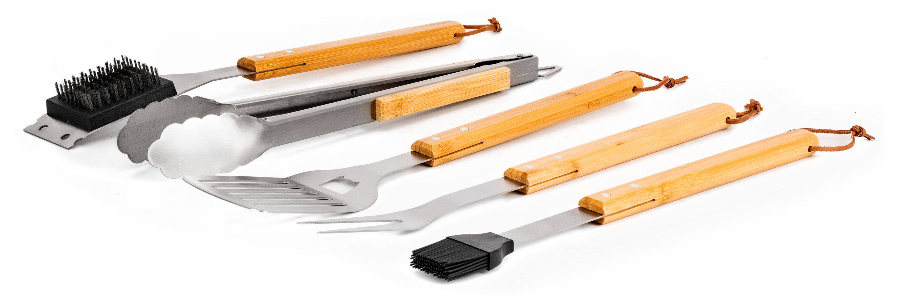Grilovací sada G21 obsahuje 3 ks grilovacího nářadí. Součástí sady je vidlice, obracečka a grilovací kleště. Rukojeti všech kusů nářadí jsou vyrobeny z bambusového dřeva.