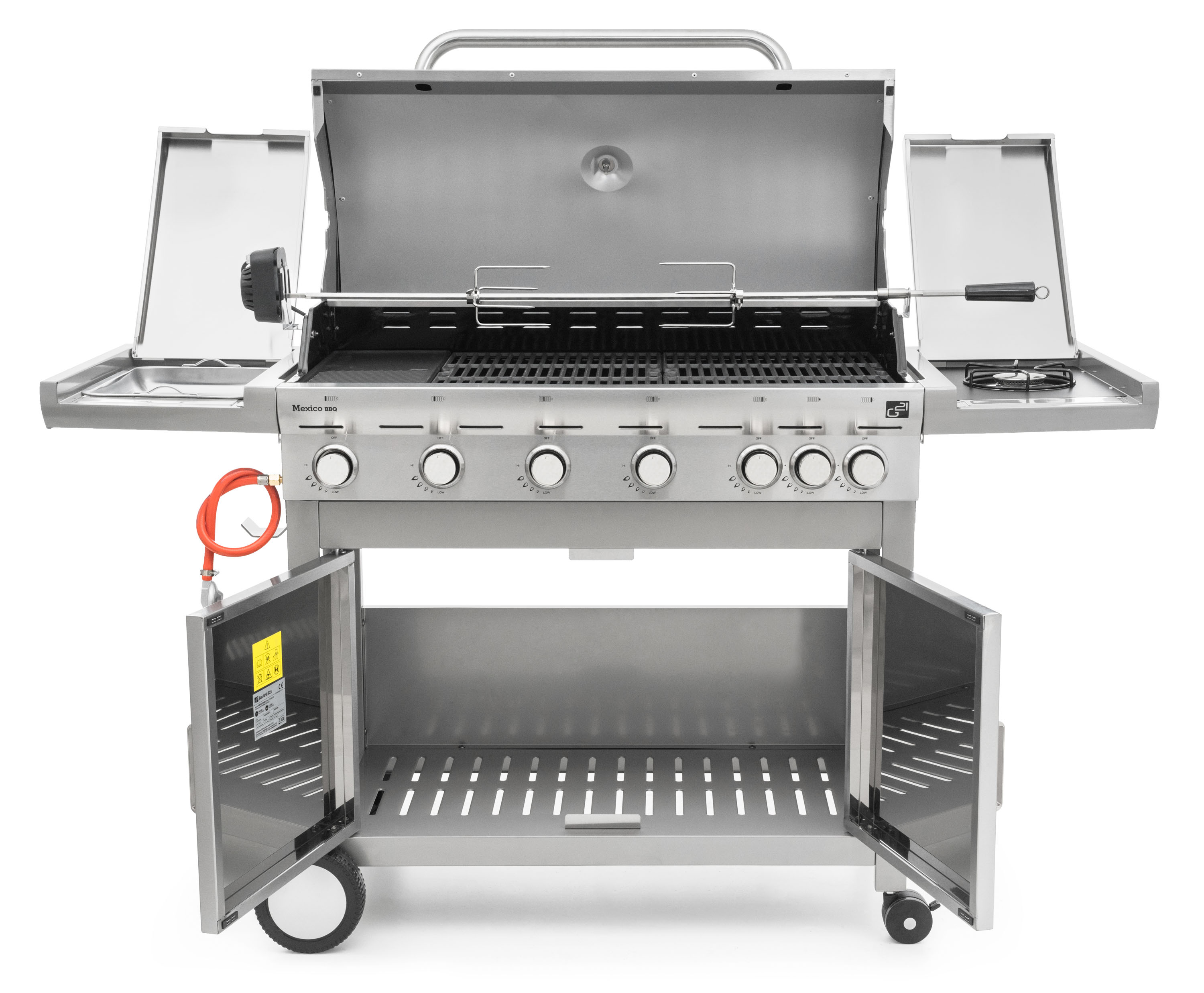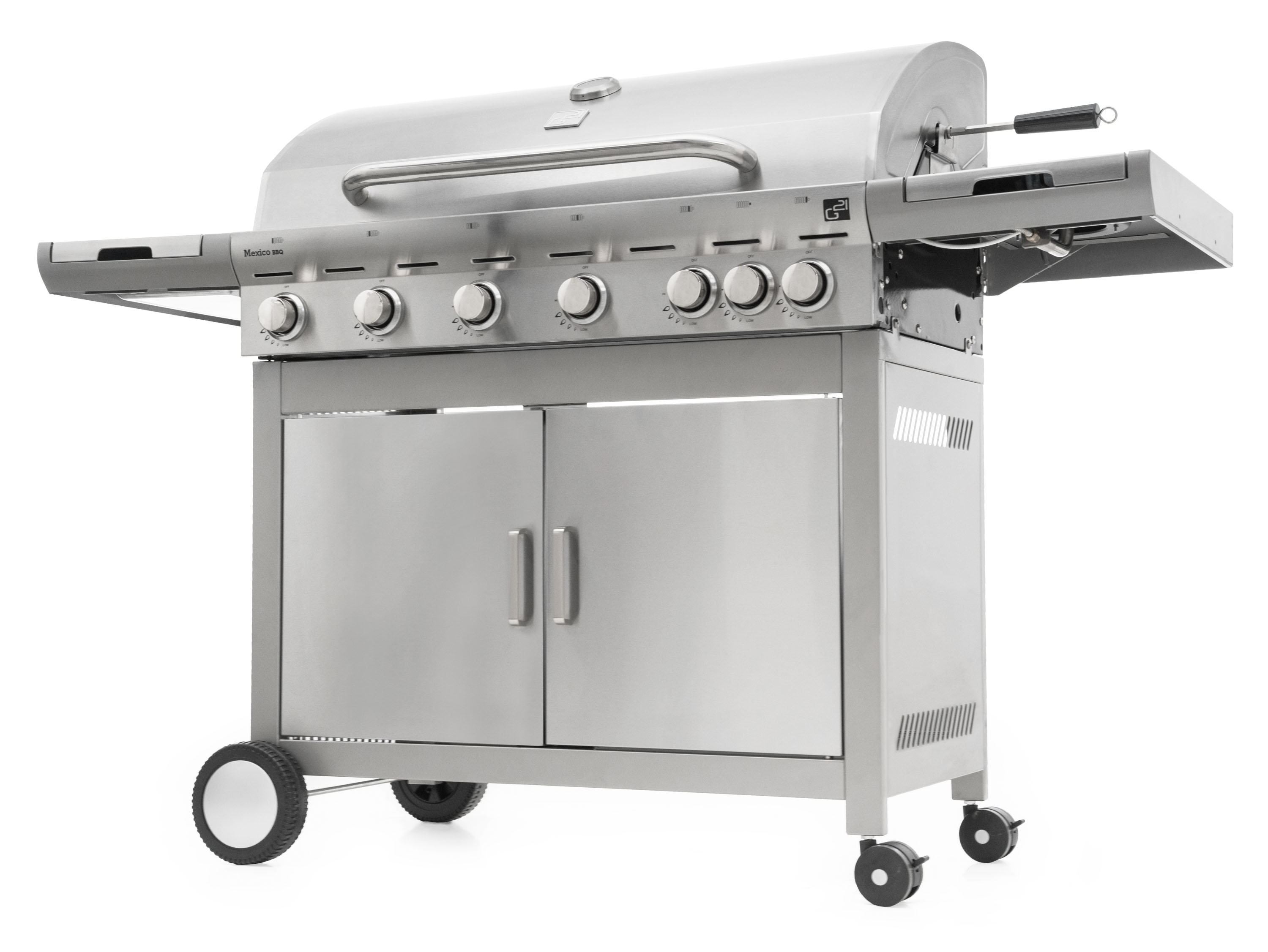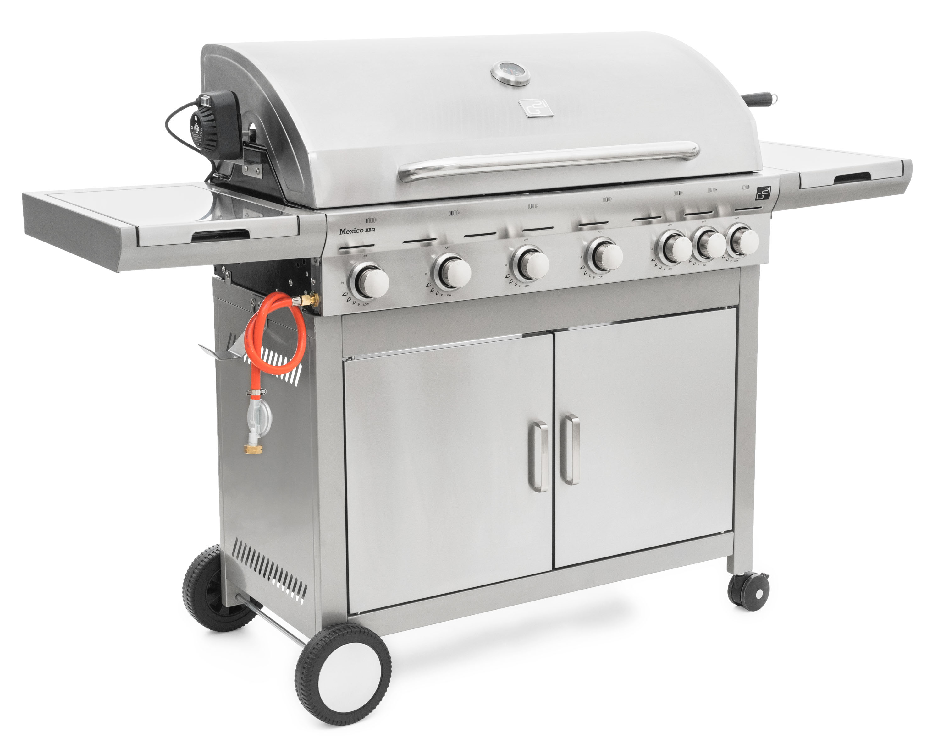 Plynový gril G21 Mexico BBQ Premium Line je vybaven systémem Flame Tamer, 6 hlavními nerezovými hořáky a jedním bočním hořákem s elektrickým zapalováním a plynovou regulací.