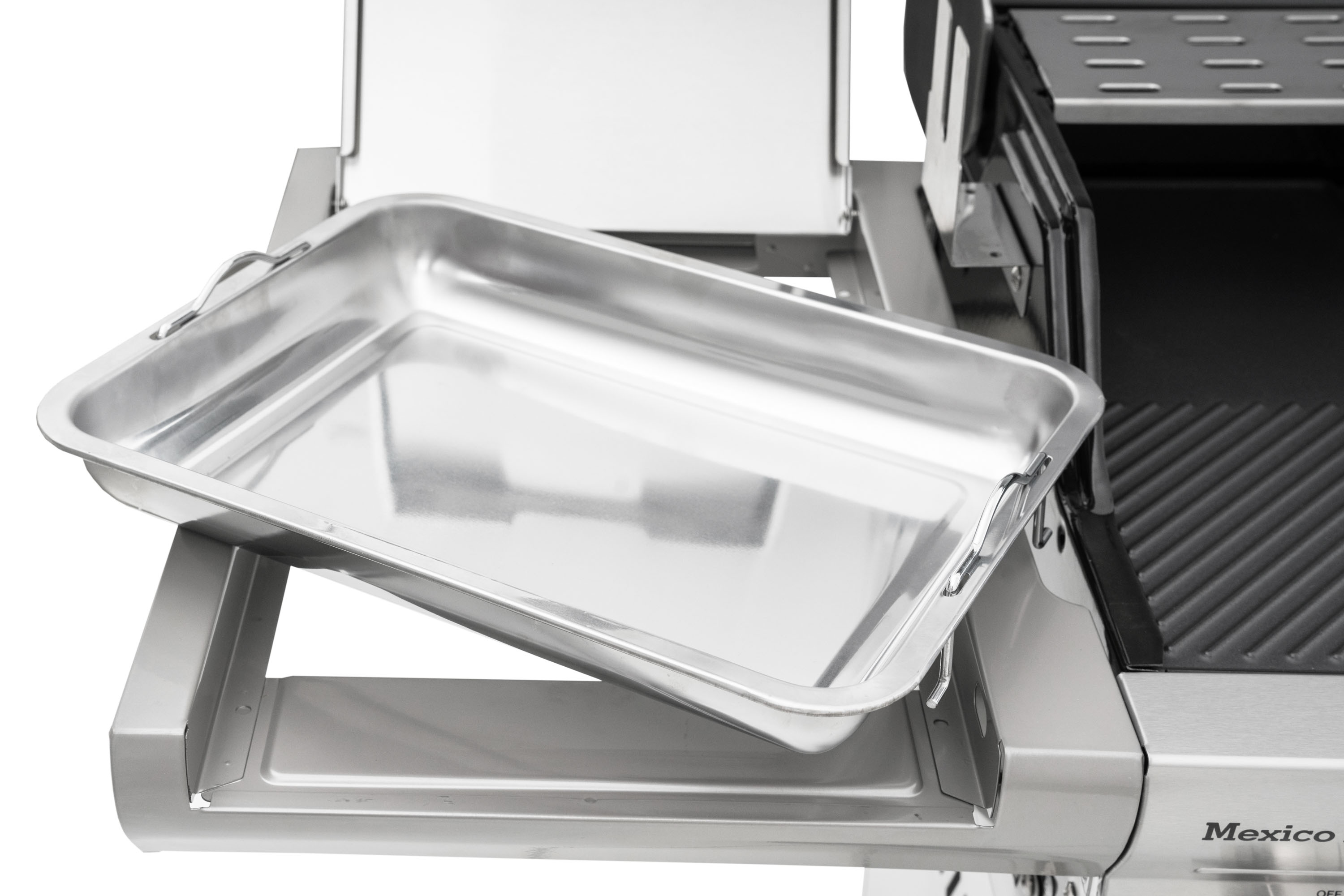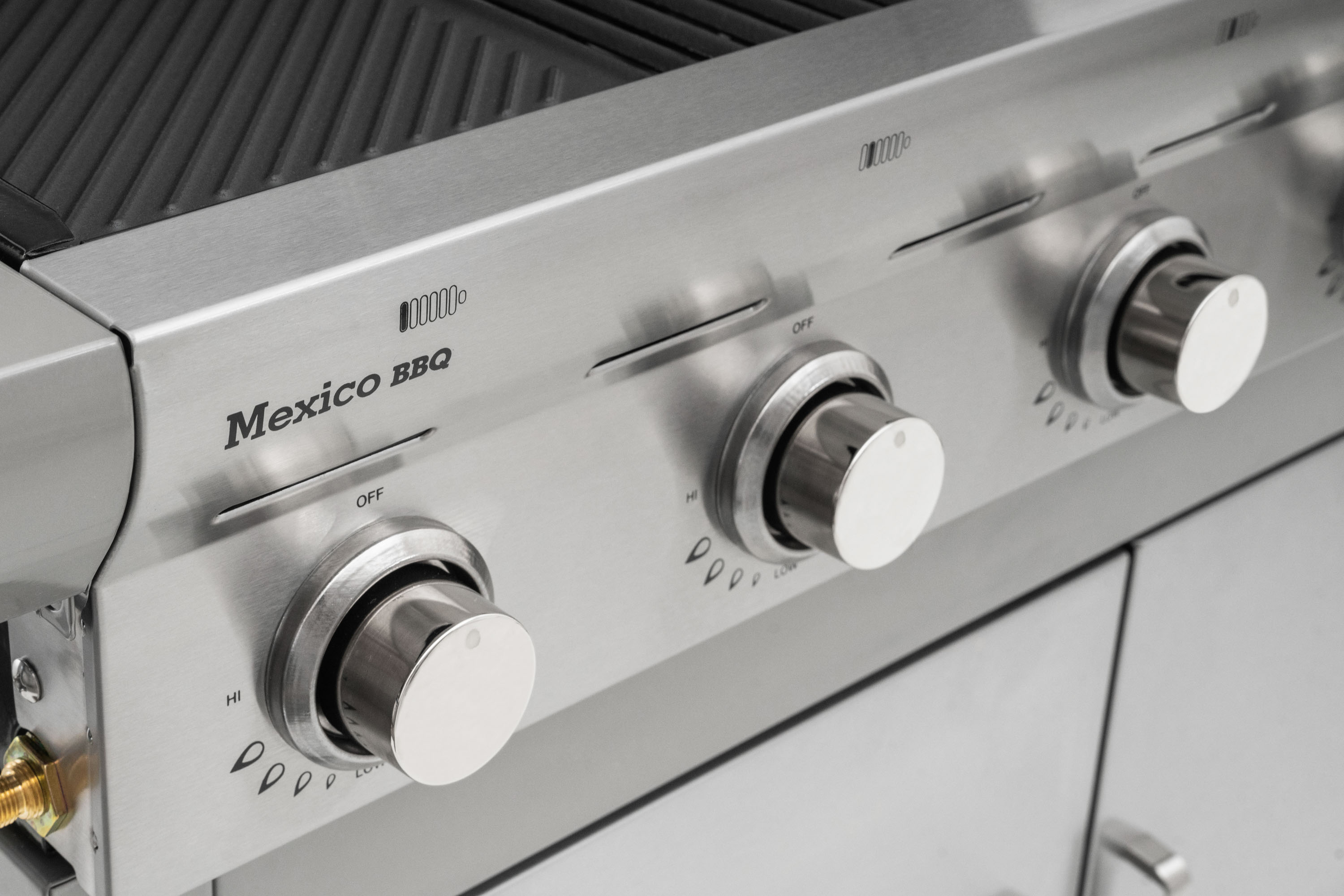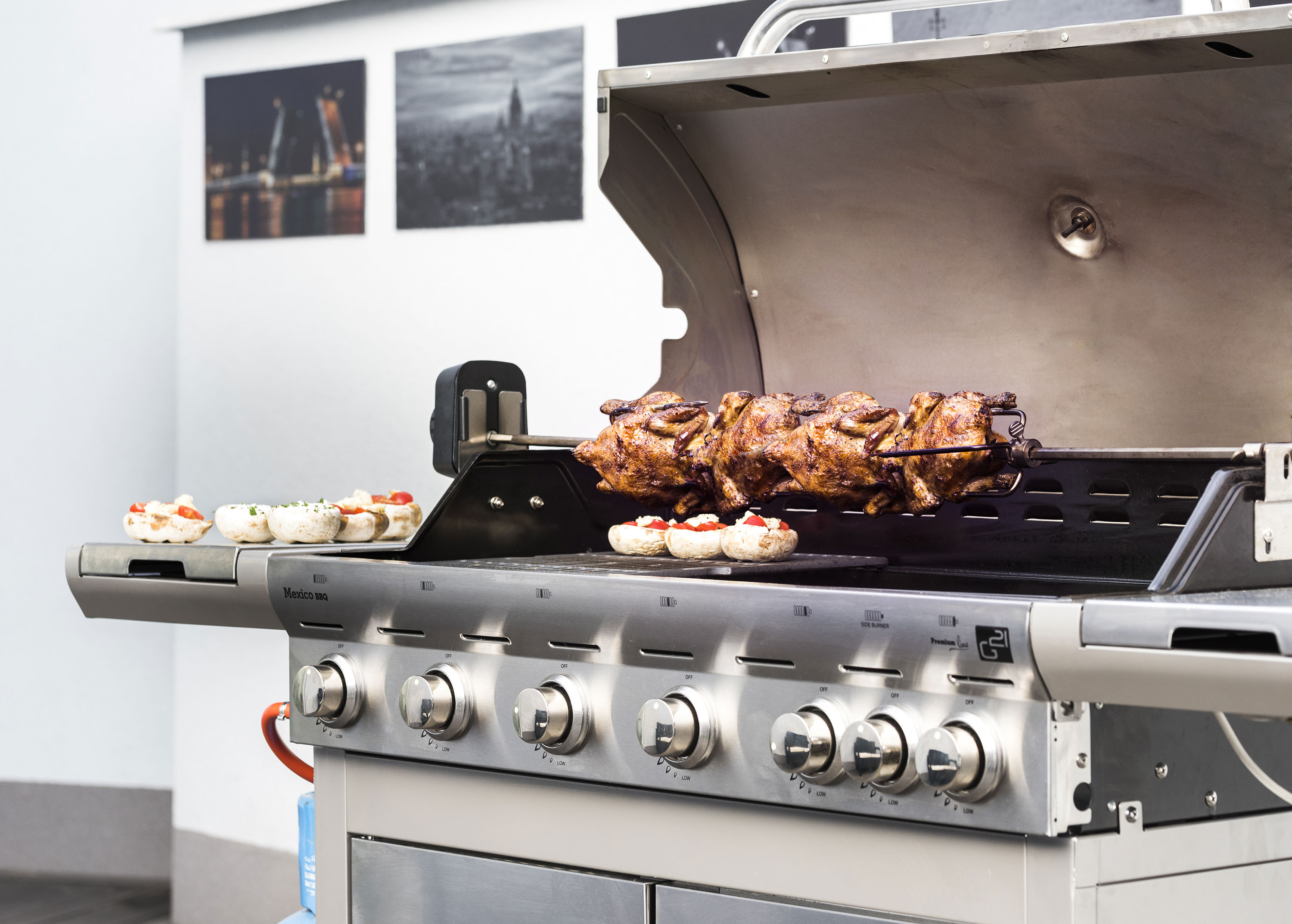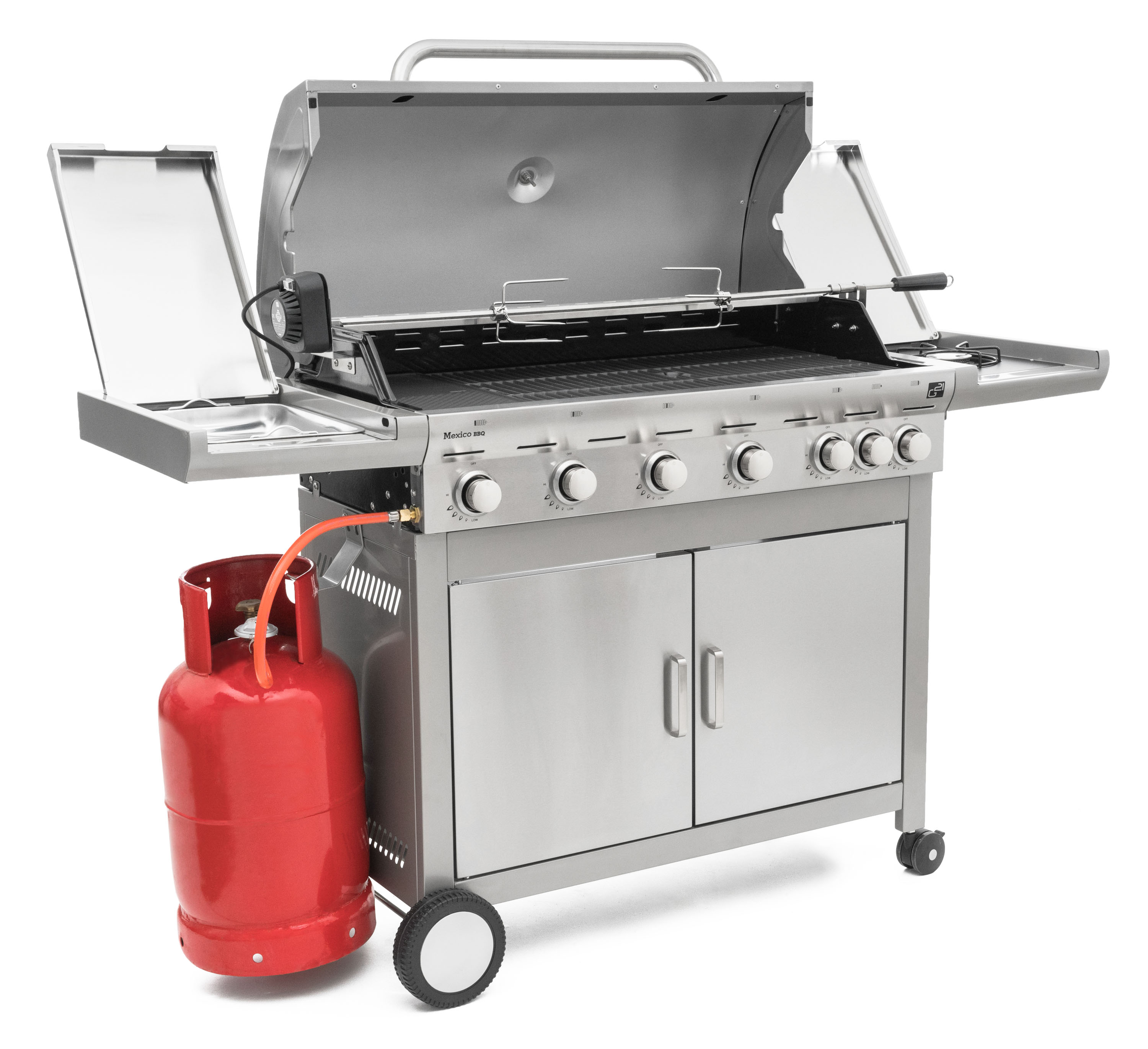 Plynový gril G21 Mexico BBQ Premium Line je vybaven systémem Flame Tamer, 6 hlavními nerezovými hořáky a jedním bočním hořákem s elektrickým zapalováním a plynovou regulací.