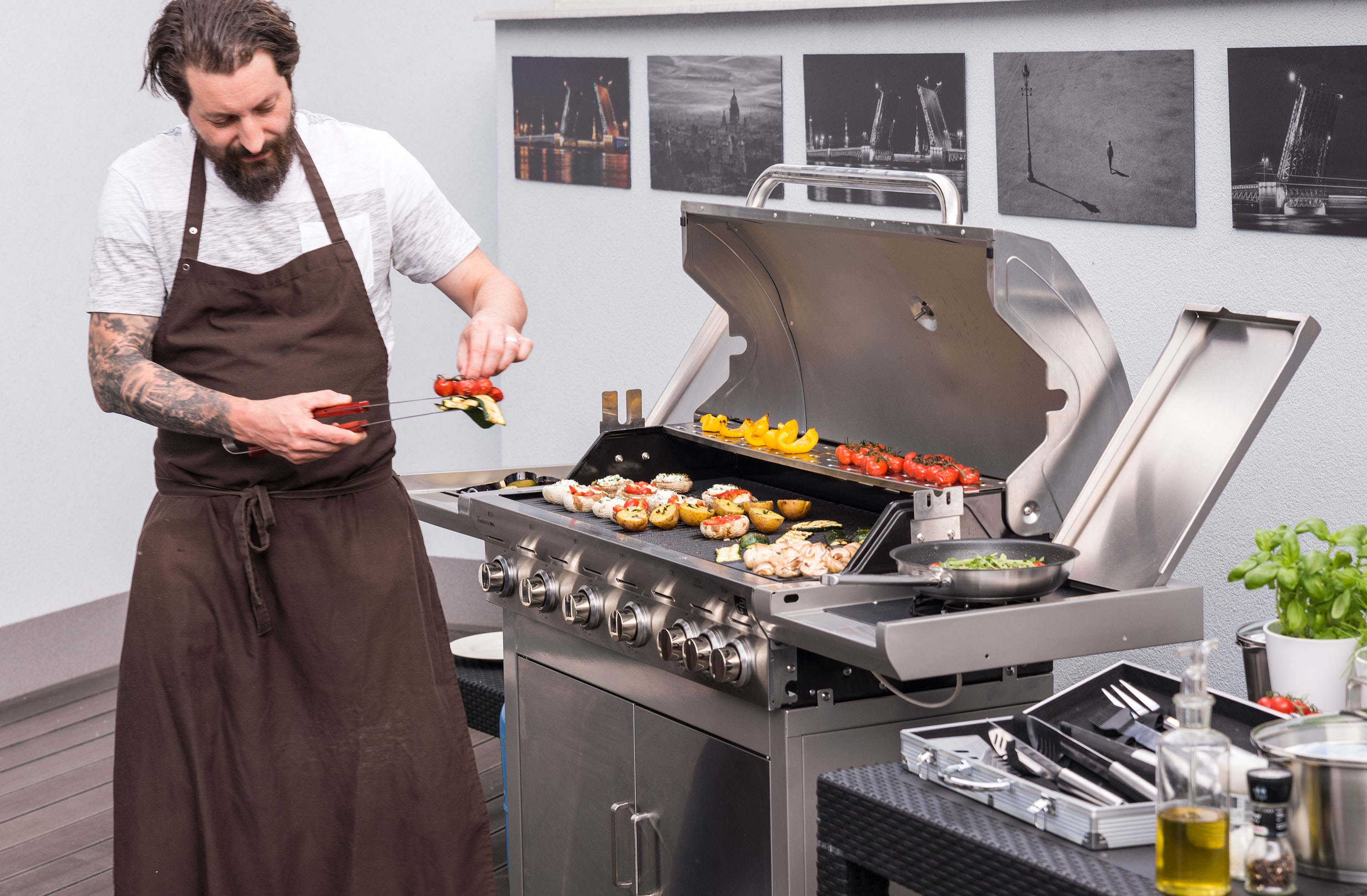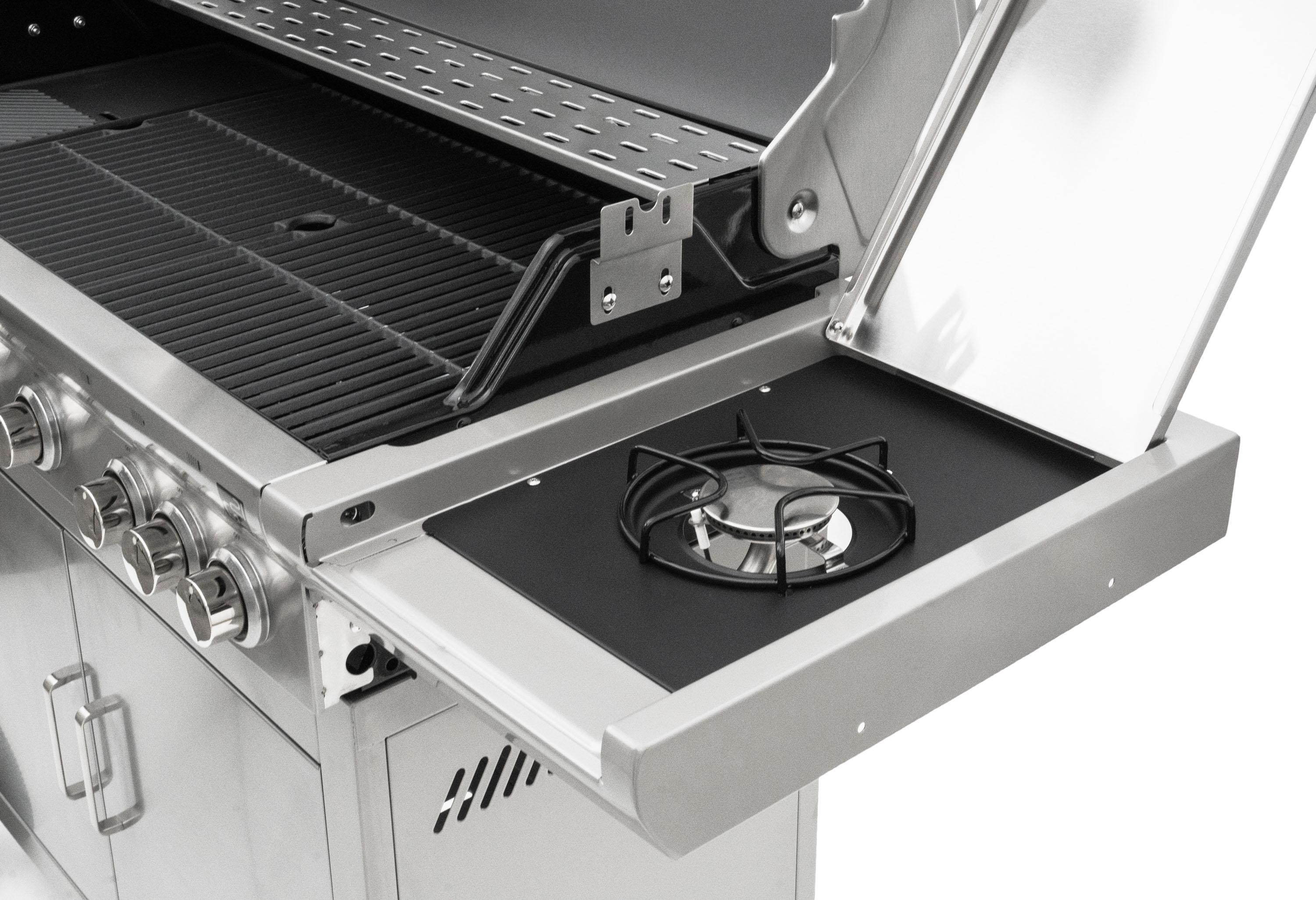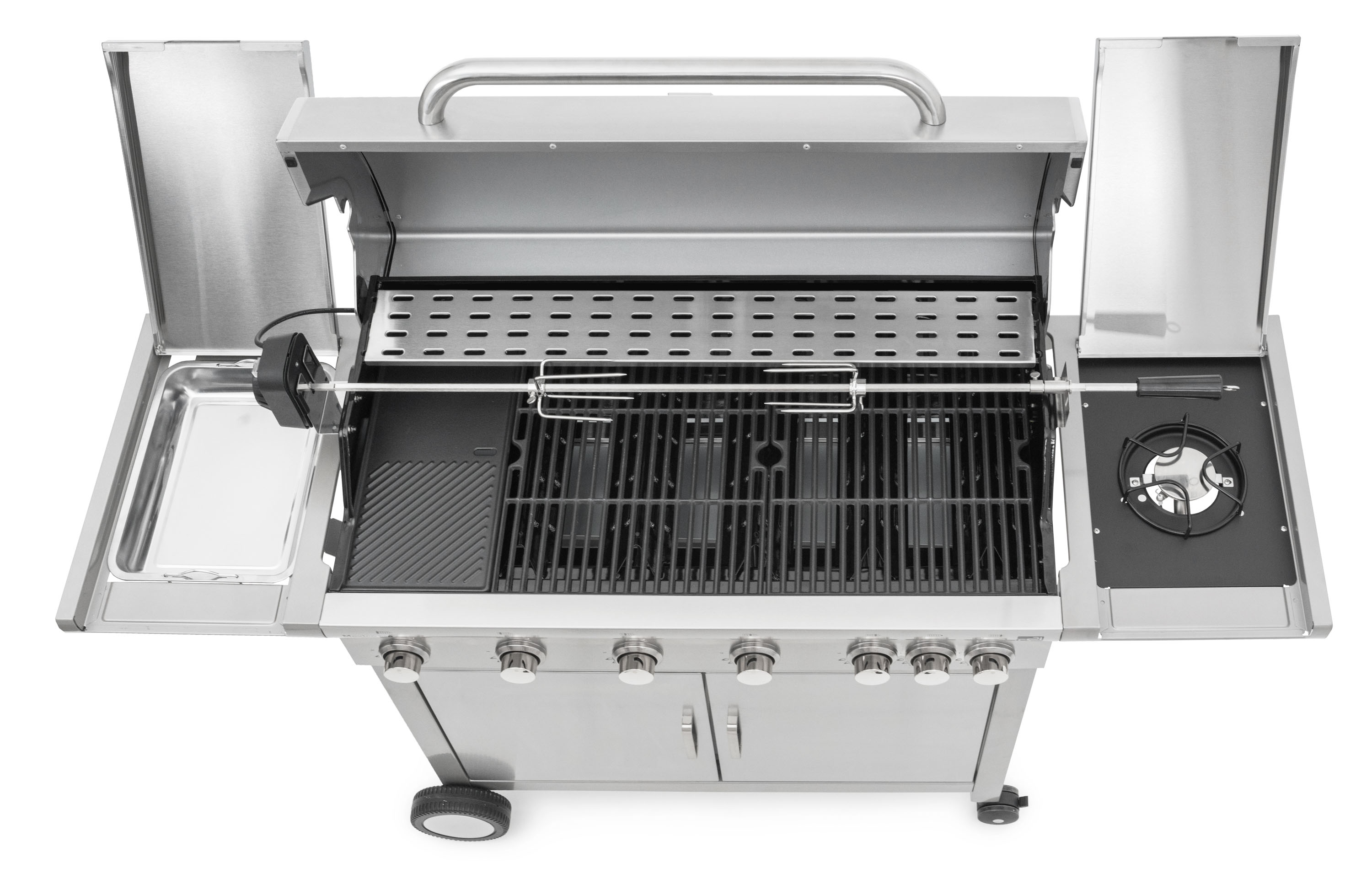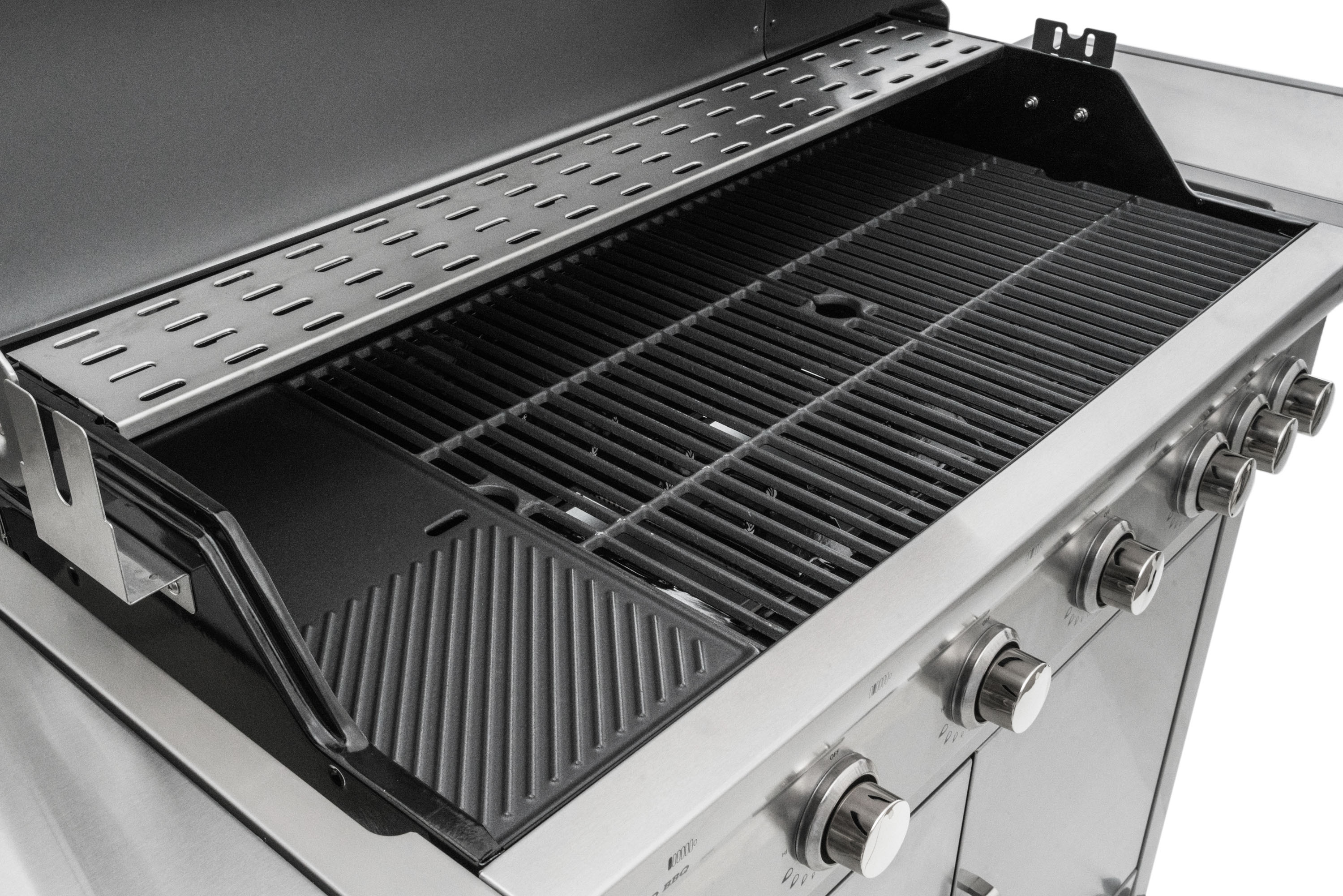 Celonerezový plynový gril se 3 litinovými rošty a jedním litinovým plátem. Elektrické zapalování, plynová regulace, boční hořák o výkonu 3,15 kW + 5 hlavních hořáků (5 x 3,5 kW).