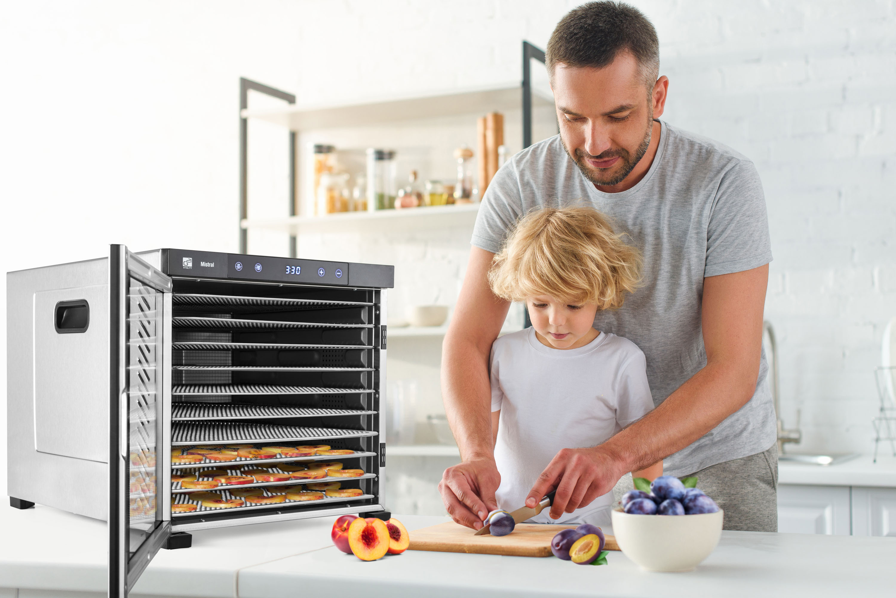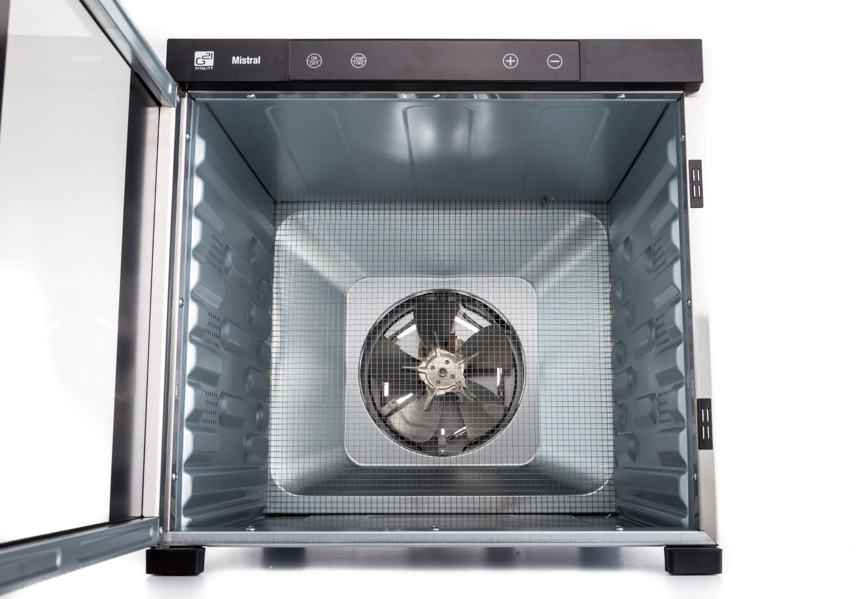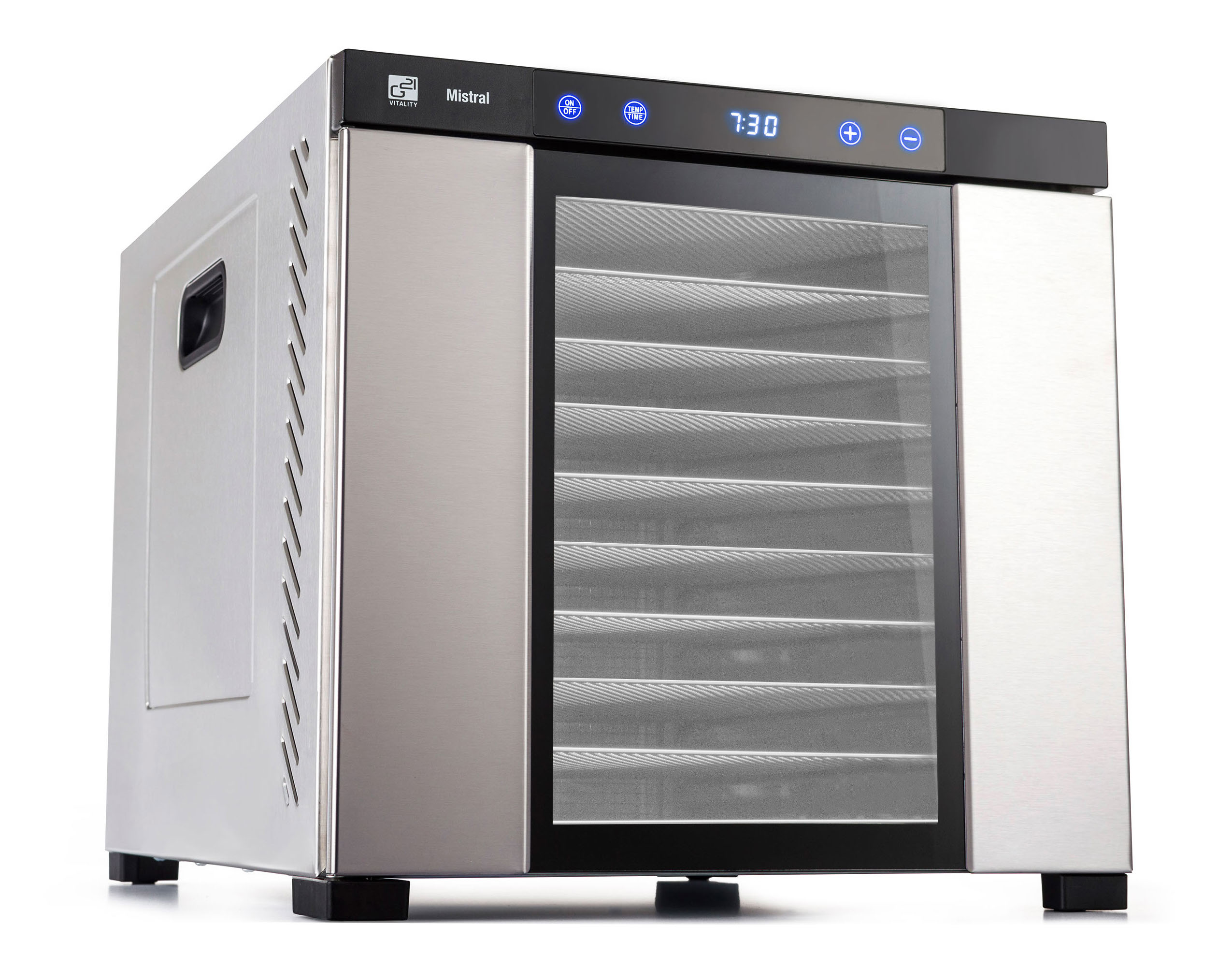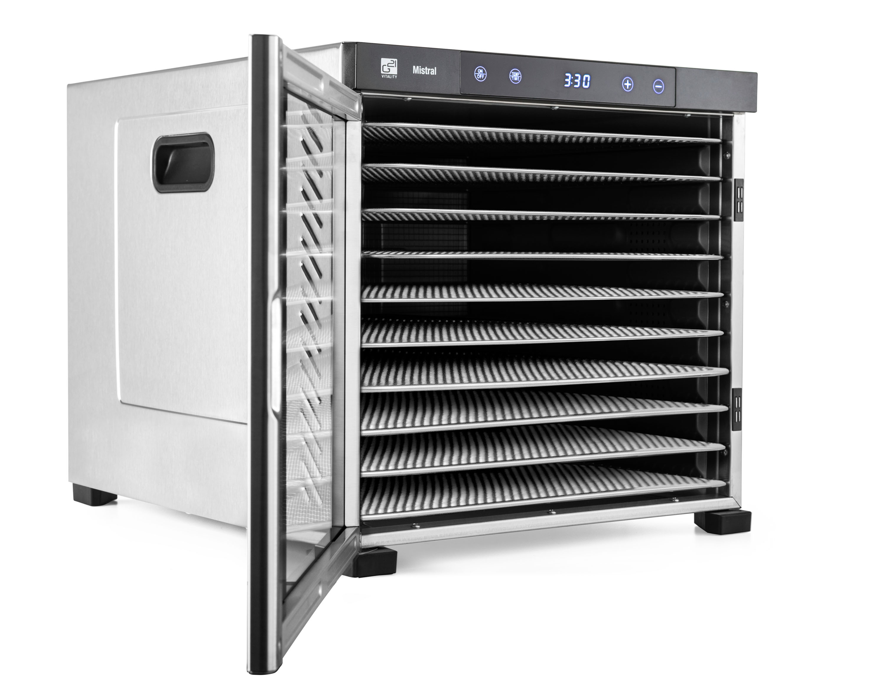 Řídící jednotka sušičky G21 Mistral má dokonale řešenou elektroniku, ovládání je intuitivní a snadné. Časovač hlídá dobu přípravy a po skončení sušení sušičku sám vypne. Regulátor teploty vám dává absolutní kontrolu nad sušícím procesem. Usušte si to, co chcete, přesně tak, jak to chcete.
