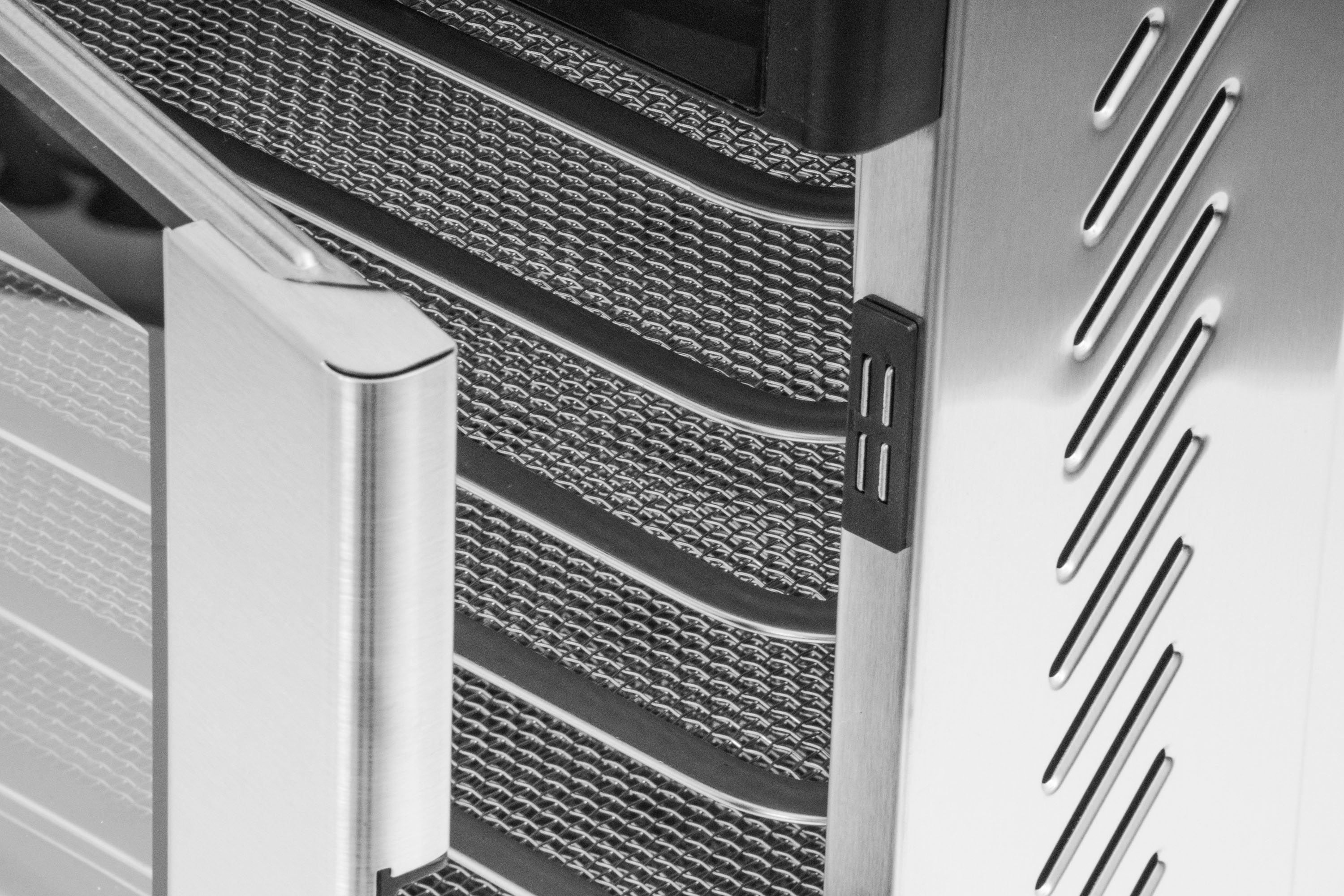 Sušička potravin G21 Mistral má na rozdíl od běžných sušiček také nerezová dvířka, která zajišťují nižší spotřebu energie, dokonalou cirkulaci vzduchu, efektivnější sušení a zkracují dobu sušení potravin. Abyste dvířka v průběhu sušení nemuseli otevírat a do sušičky se tak nedostal chladný vzduch, vybavili jsme je okénkem. Snadno a rychle tak zjistíte stav sušeného ovoce, zeleniny, bylinek, hub nebo masa. Díky dvířkům můžete také vyjmout libovolný počet plat a sušit na menším počtu bez obav, že narušíte kvalitu sušení.