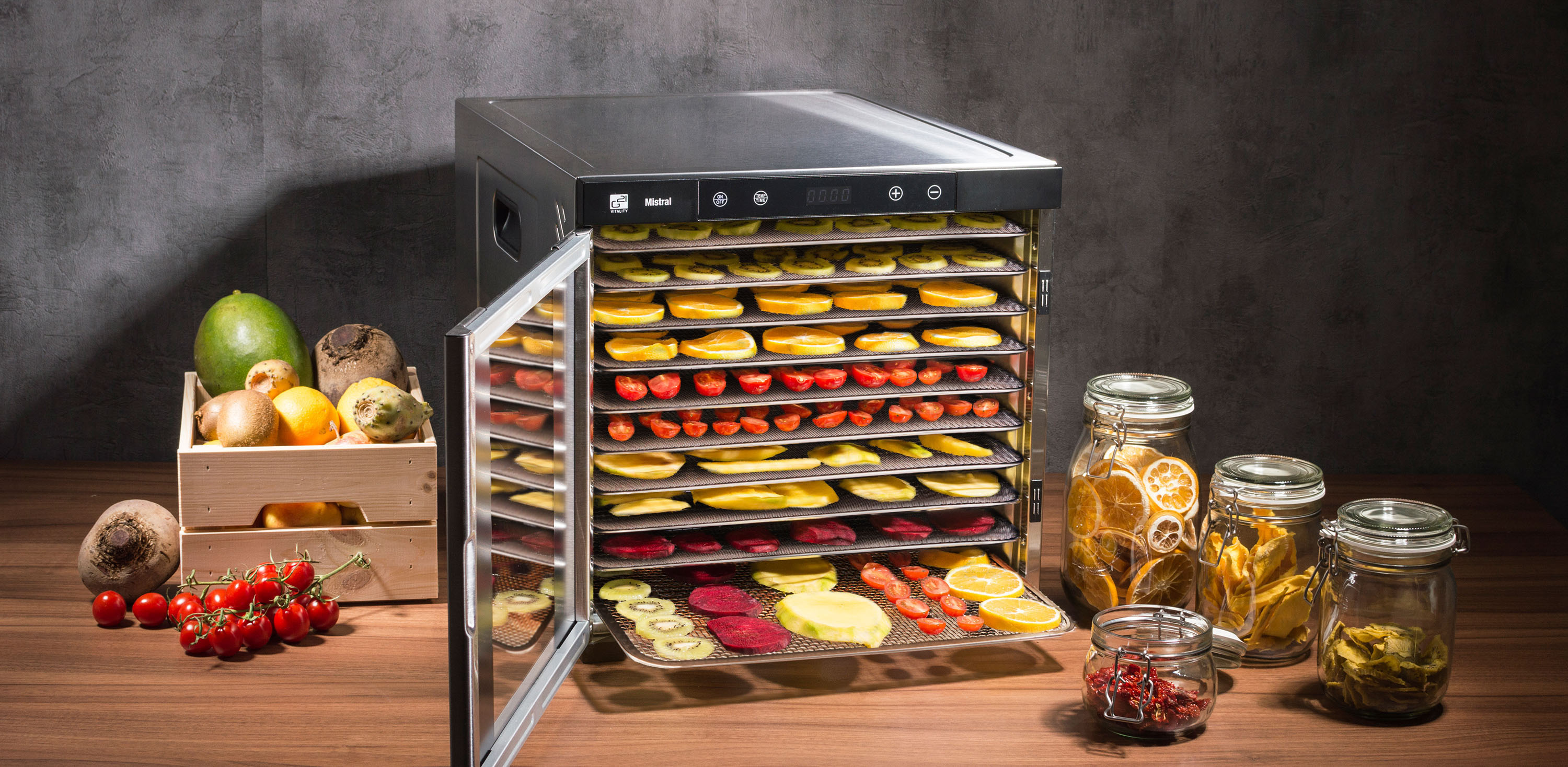 Řídící jednotka sušičky G21 Mistral má dokonale řešenou elektroniku, ovládání je intuitivní a snadné. Časovač hlídá dobu přípravy a po skončení sušení sušičku sám vypne. Regulátor teploty vám dává absolutní kontrolu nad sušícím procesem. Usušte si to, co chcete, přesně tak, jak to chcete.