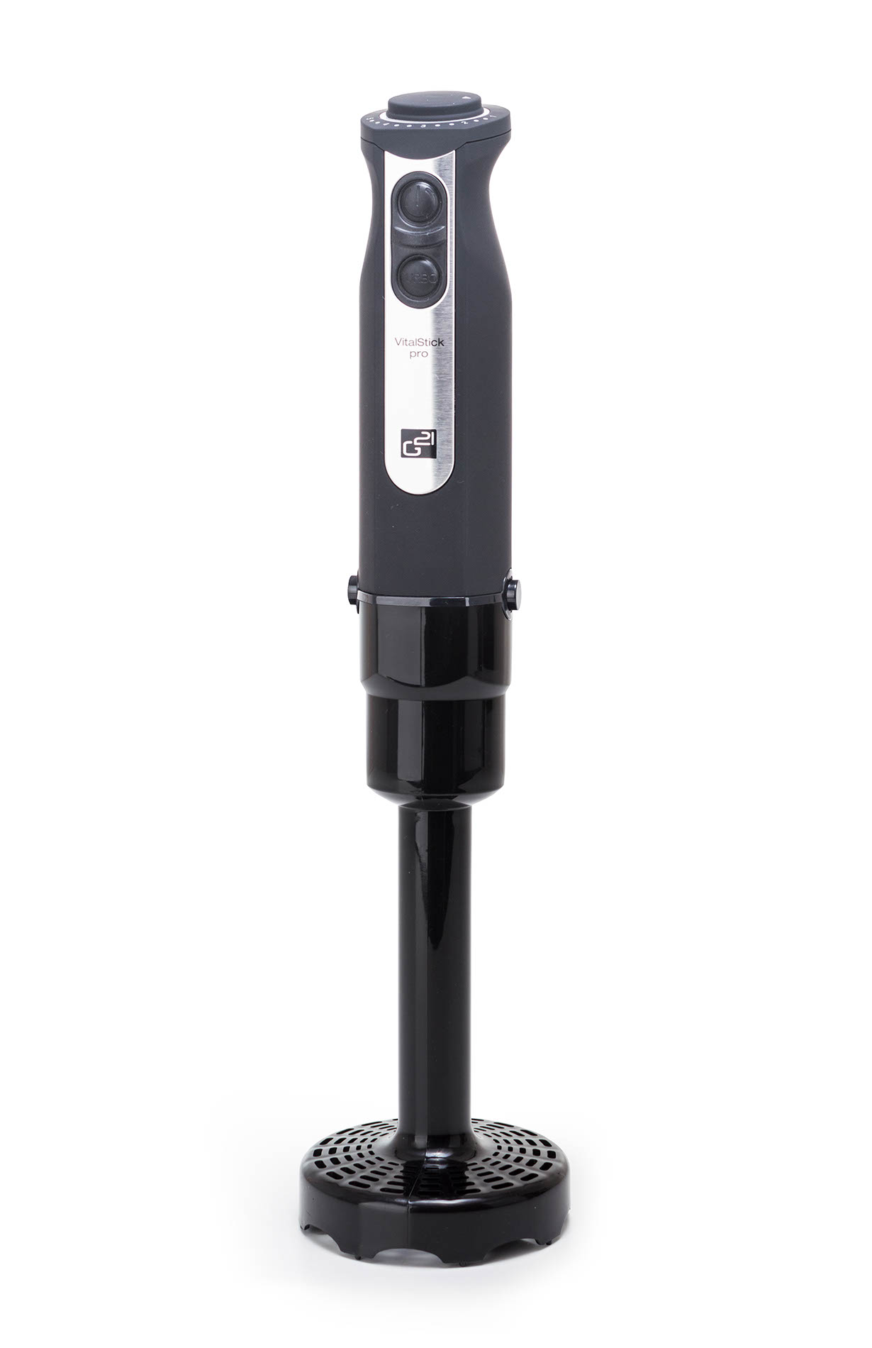 Multifunkční tyčový mixér G21 VitalStick Pro v černé barvě s výkonem 1000 W. Rozložení nožů 3D Quattro blade systém pro mixování ve 4 úrovních. Mixovací nástavec, šlehací metla, nástavec na pyré, nádoba na sekání, nádoba na šlehání, stojan.