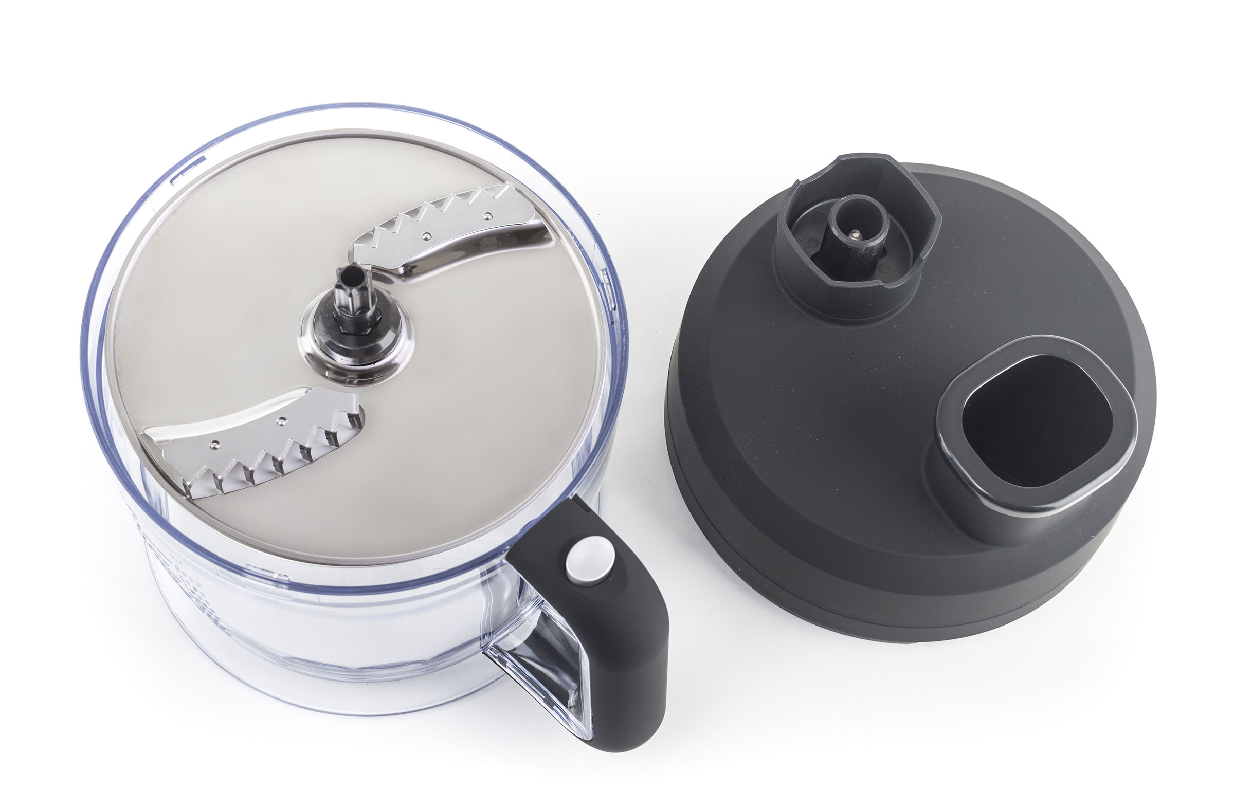 Nádoba z kvalitního bytelného plastu je vysoce odolná proti nárazu. Nebojte se sekání tvrdých potravin, nádoba to hravě vydrží. Horní víko nádoby v matném černém provedení se může pochlubit otvorem pro vhazování potravin za chodu. Teď už nemusíte přístroj vypnout a otevřít při každém přidávání ingrediencí. Pěchovadlo přesně kopíruje otvor pro přidávání surovin.