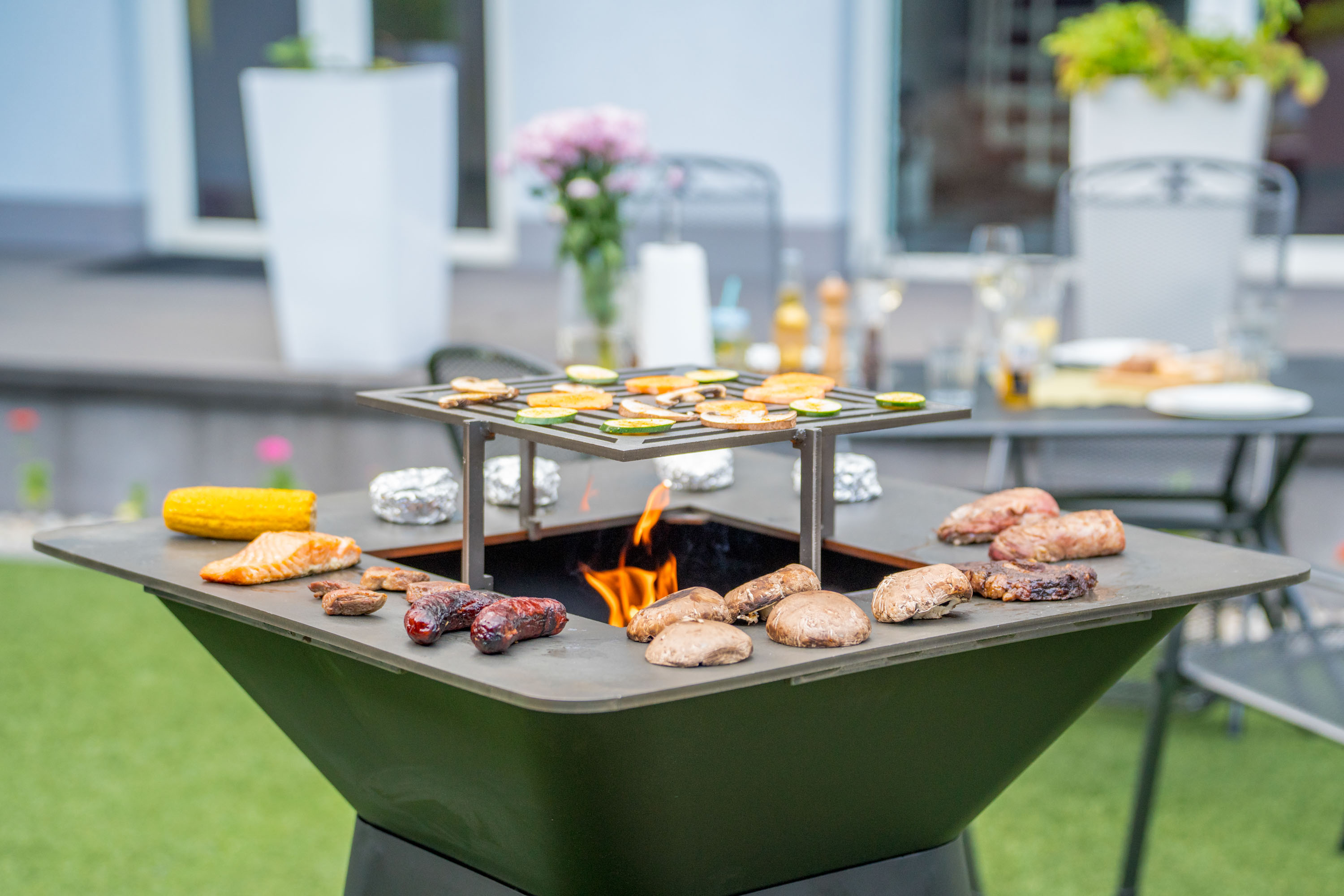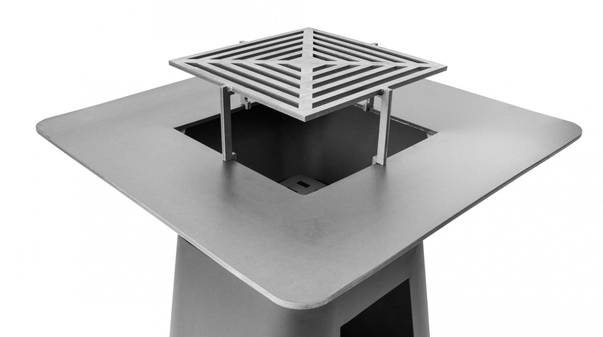 Robustní cortenový gril s planchou, speciální povrchová úprava pro dlouhou životnost, rozměr grilovací plochy 85 x 85 cm, výška grilu 90,5 cm, prostor na ukládání dřeva, dvojitý plášť. V balení je i obal na gril a příslušenství.