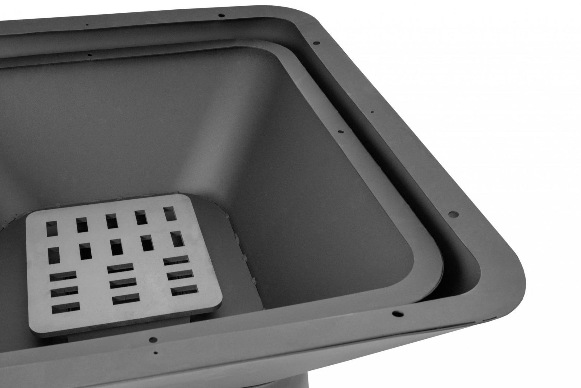 Horní část grilu tvoří topeniště s výsuvným popelníkem a dominantou grilu je obrovská grilovací plocha – plancha o tloušťce 1 cm s mírným náklonem směrem do středu.