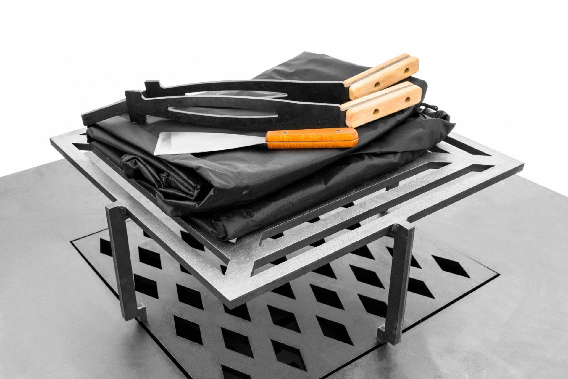 Robustní cortenový gril s planchou, speciální povrchová úprava pro dlouhou životnost, průměr prstence 85 cm, výška grilu 100,5 cm, prostor na ukládání dřeva, snadné čištění. V balení je i obal na gril a příslušenství.