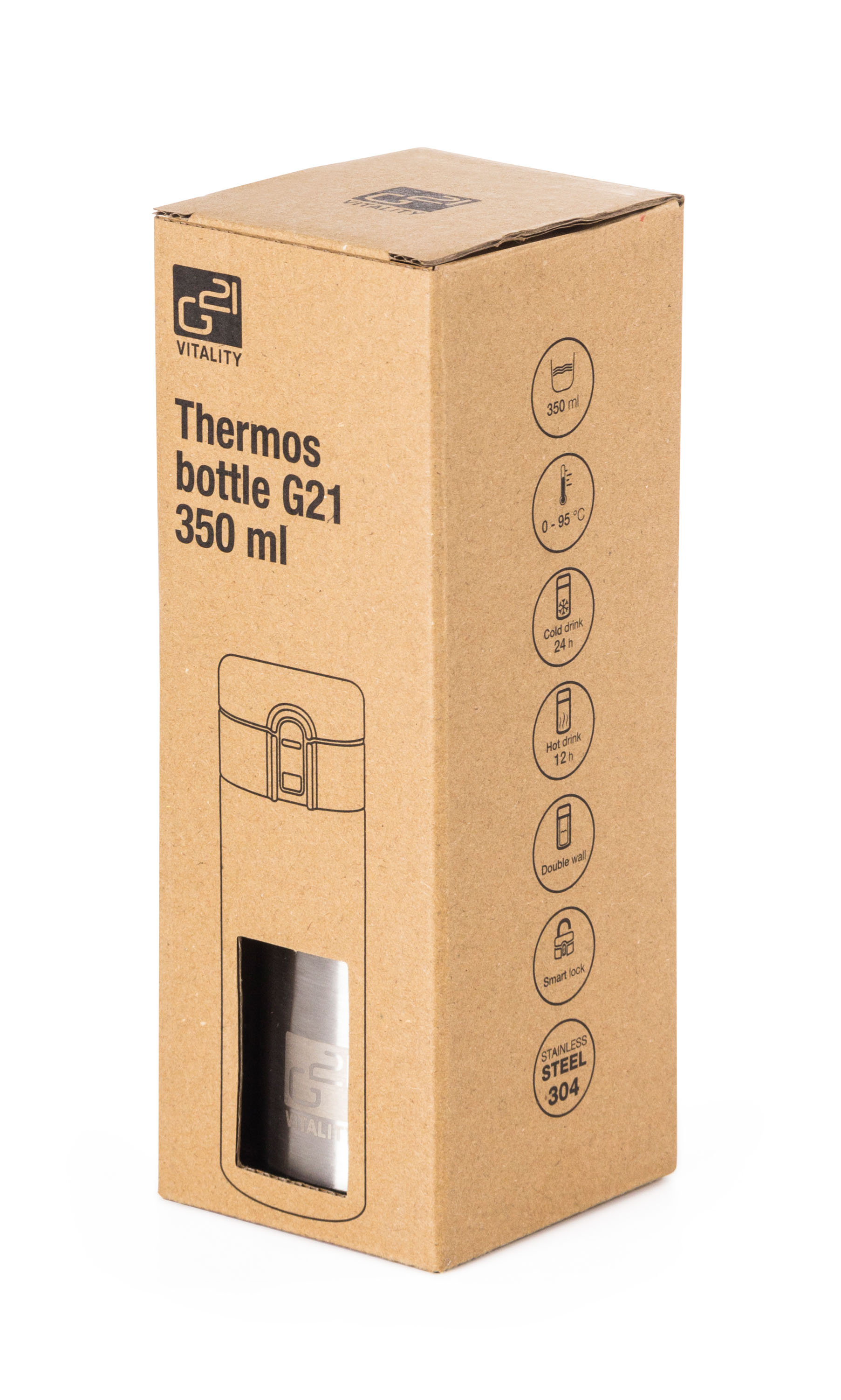 Největší předností termohrnku G21 je kvalitní termoizolace. Termoláhev z nerezové oceli má dvojité stěny a dokonale těsnící víčko. Nápoje tak udrží v požadované teplotě opravdu dlouho – horké až 12 hodin, studené k osvěžení až 24 hodin.