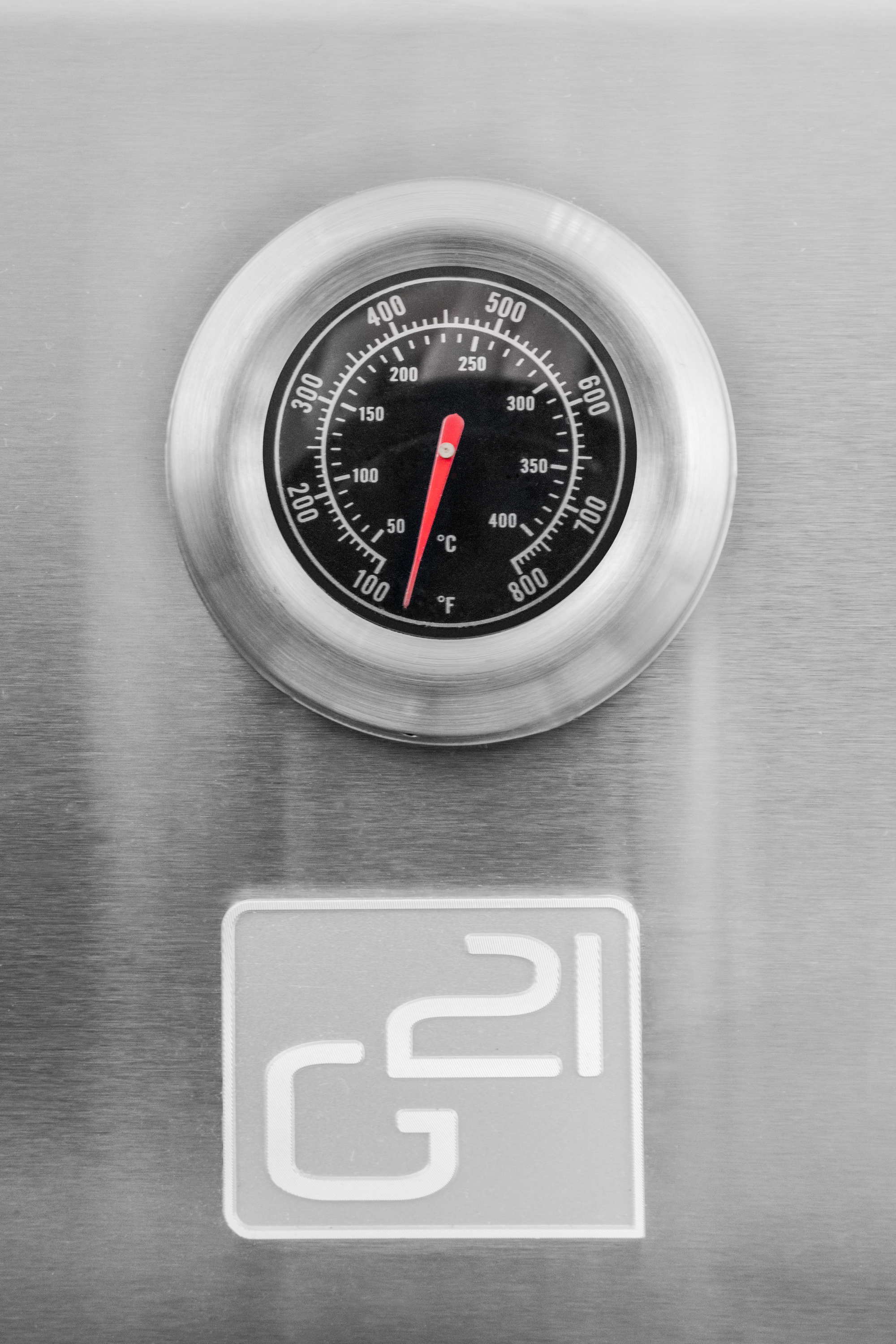Nerezový zahradní gril na plynovou bombu G21 Oklahoma BBQ s litinovým roštem a plátem, 3 nerezové hořáky s elektrickým zapalováním, výkon 3 x 3,5 kW, systém Flame Tamer. Vestavěný teploměr, odklápěcí kryt, odkládací poličky. Stříbrná barva.