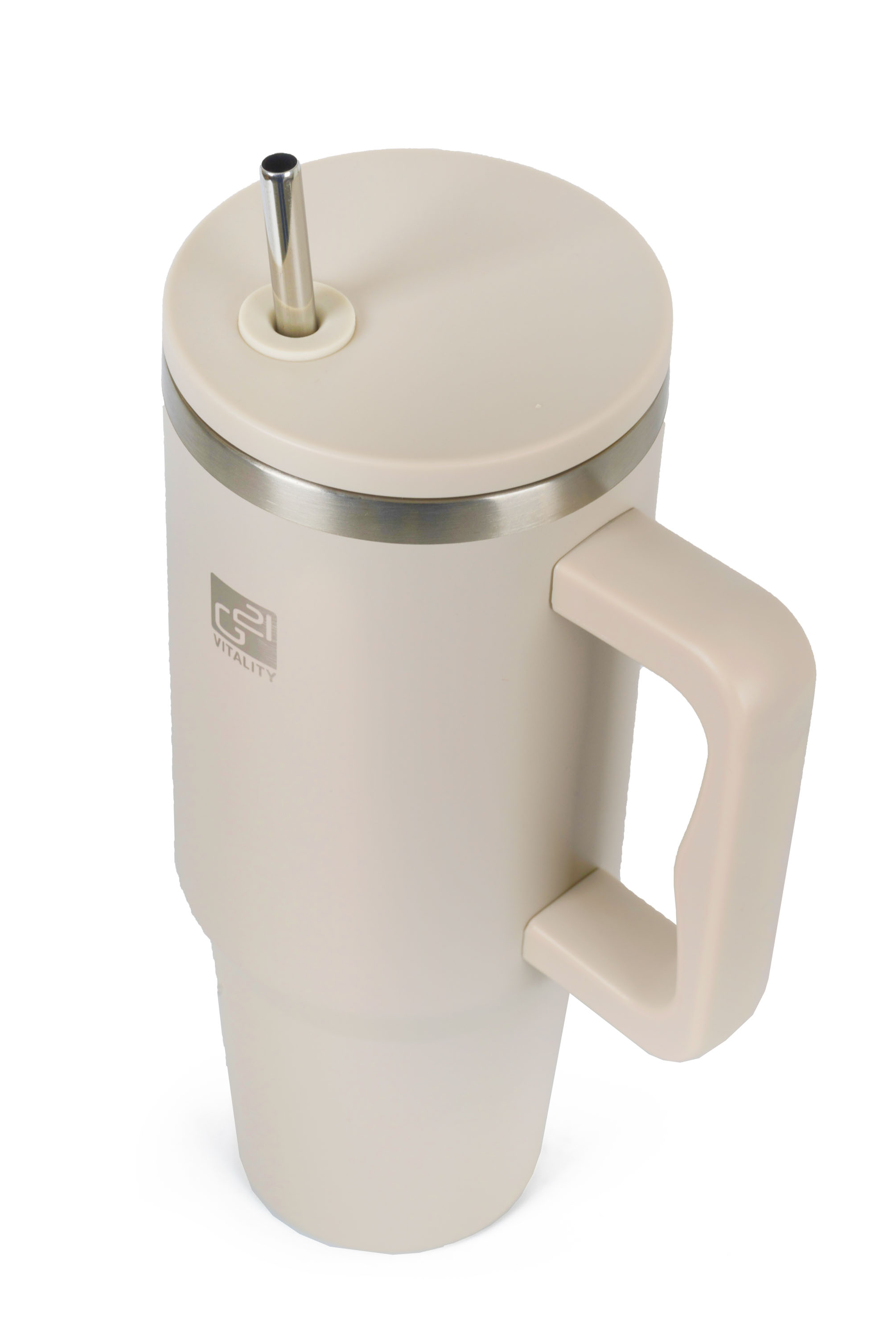 1200 ml objem, udrží nápoj chladný i studený 12 h, teplotní odolnost 0 - 45 °C, nerezová ocel, pasuje do držáku v autě, brčko a kartáček v balení. Pískově béžové barevné provedení.