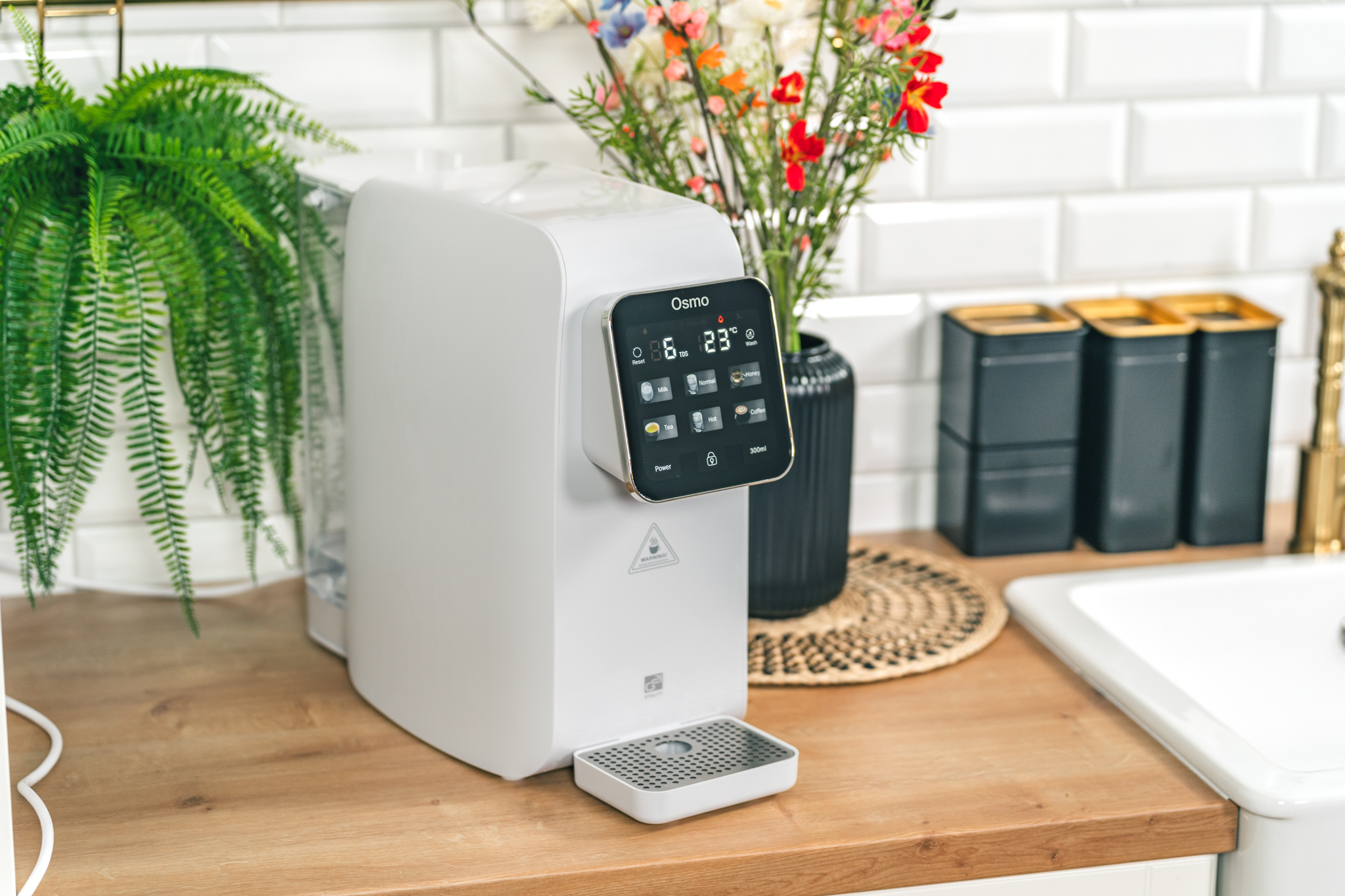 Výdejník vody s reverzní osmózou a ohřevem, dokonalá filtrace pro maximální čistotu vody, 6 nastavení teploty od 25 °C až po 95 °C, dotykový displej, dětský zámek.