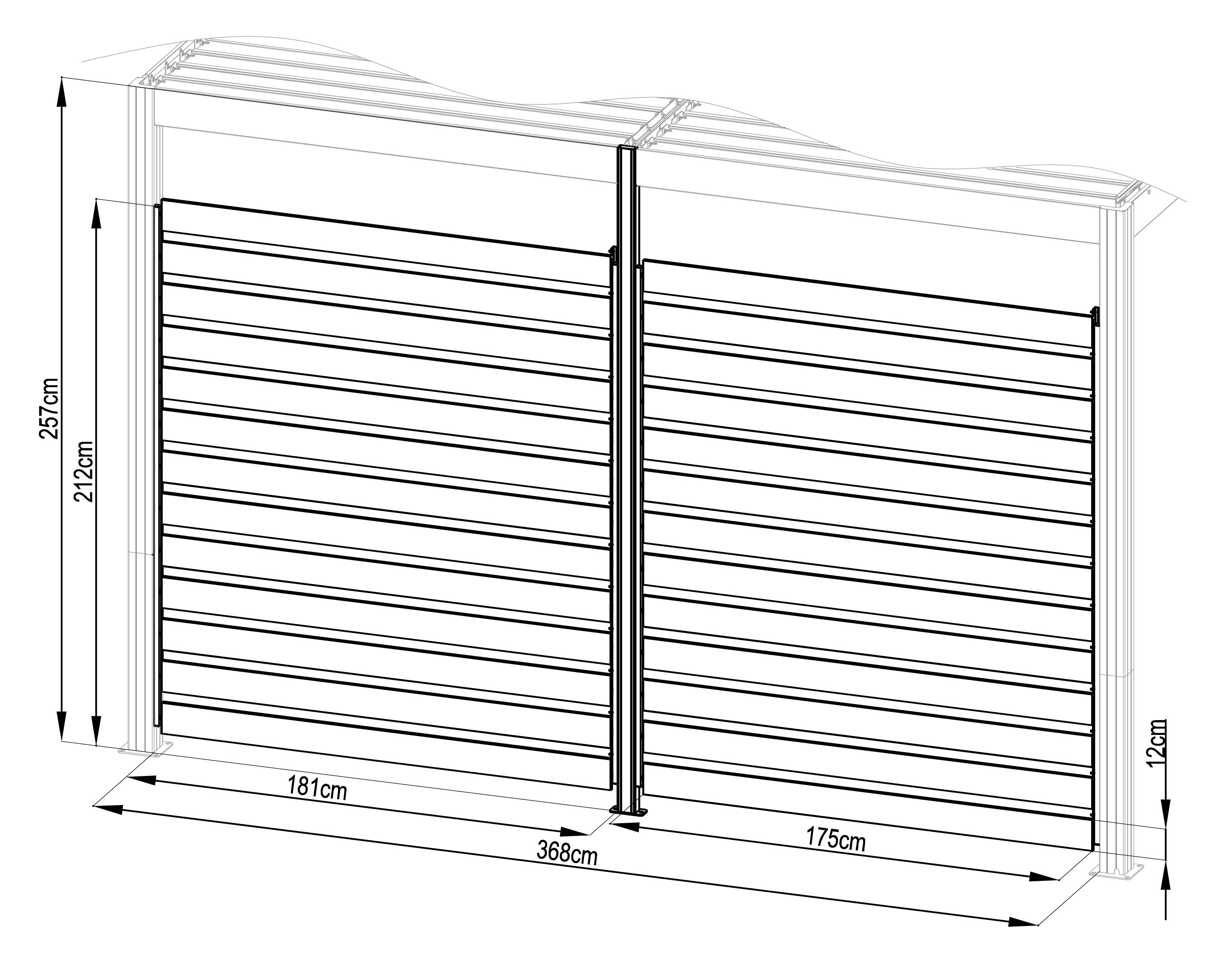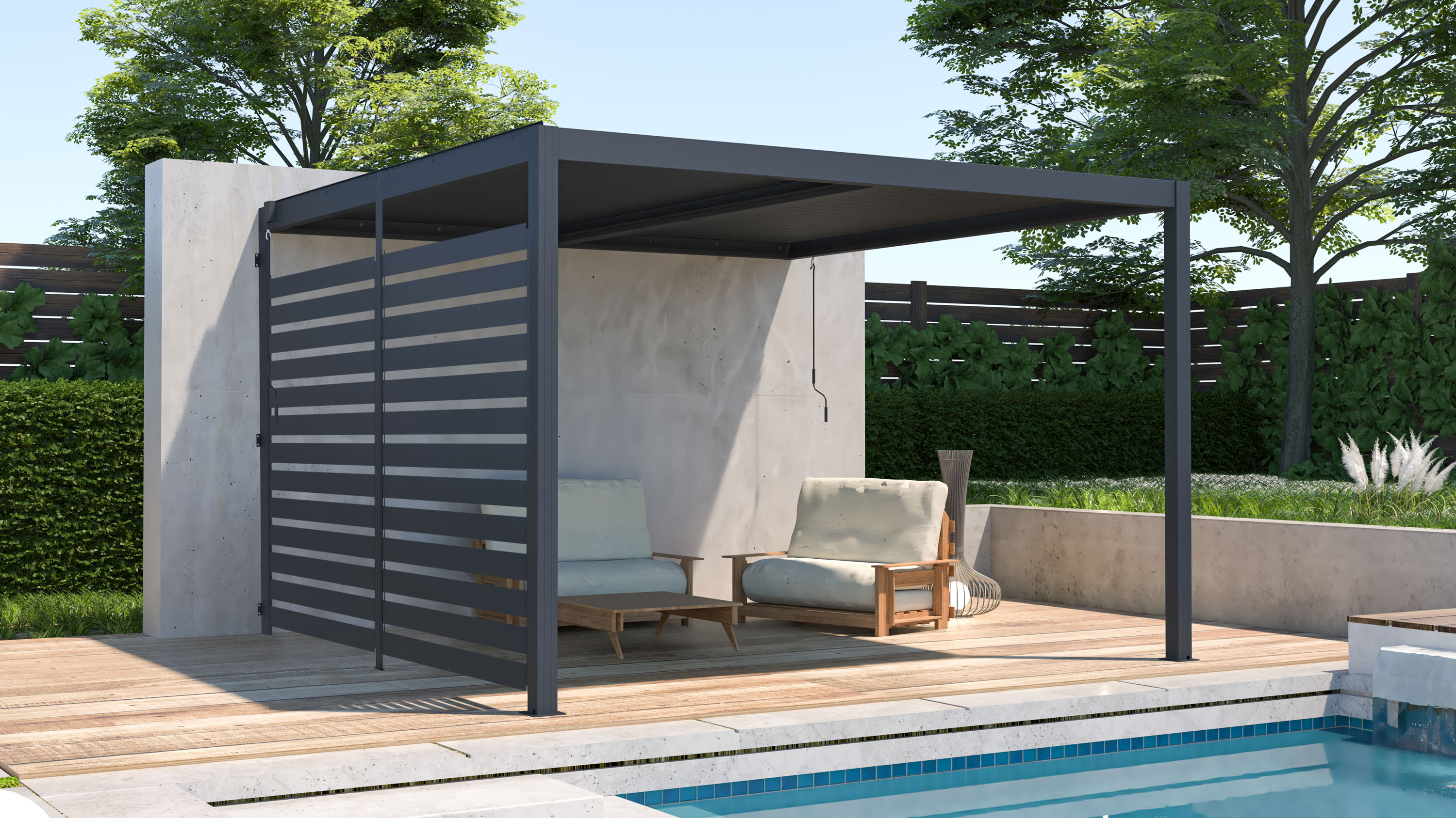 Boční stěna s otočnými pozinkovanými lamelami pro větší soukromí i ochranu před větrem,deštěm či sluncem. Stabilní konstrukce z kvalitního hliníku, snadná instalace.