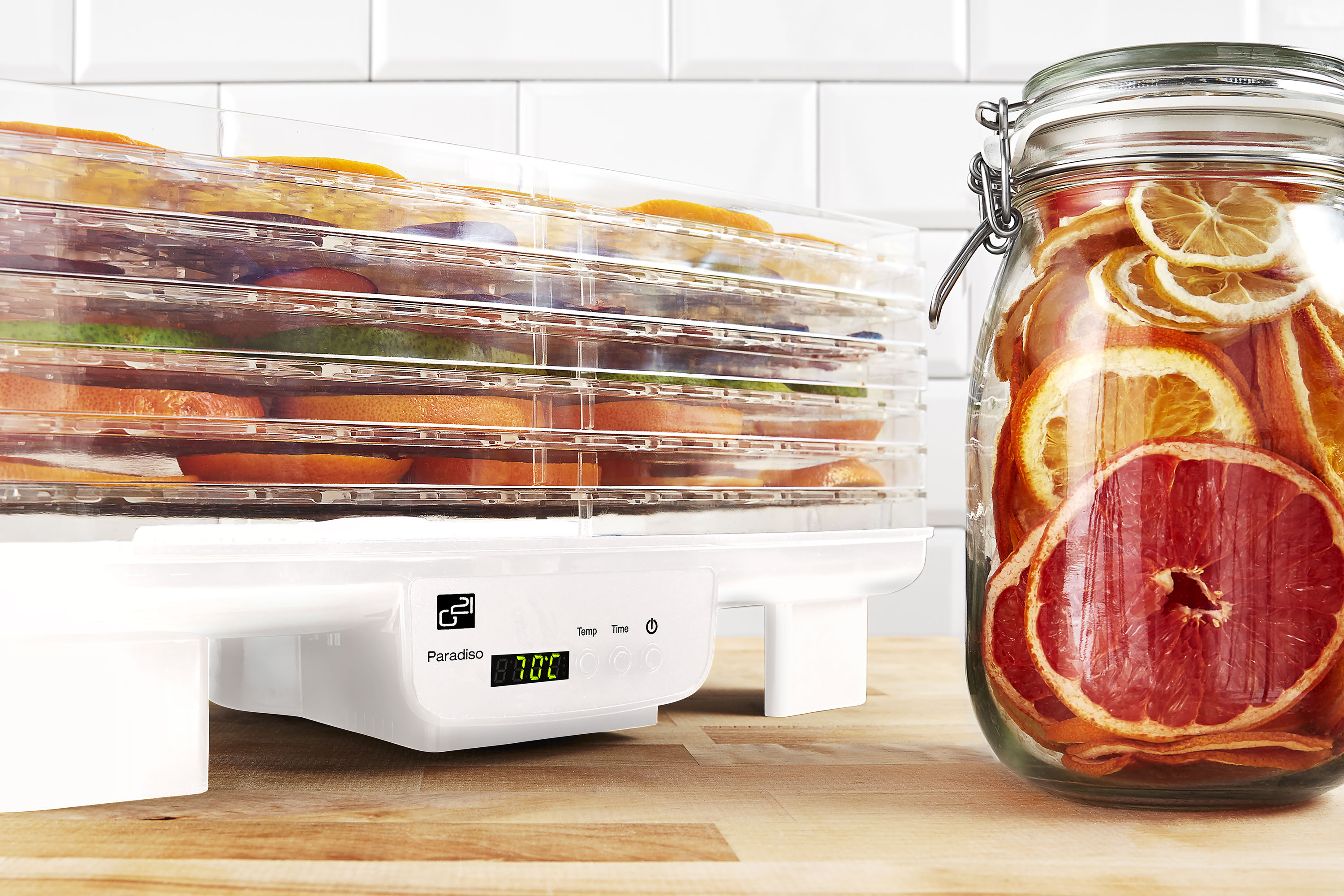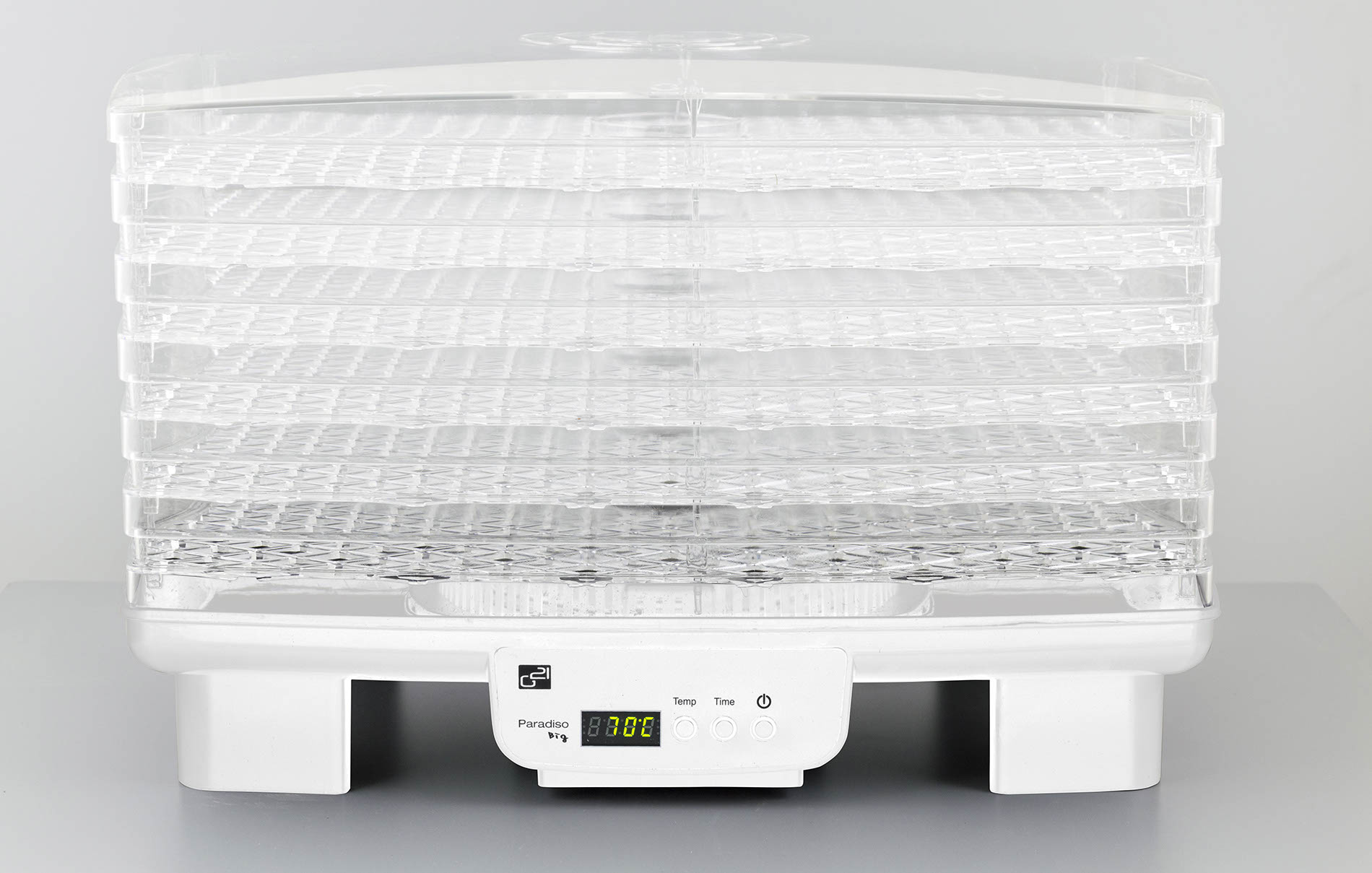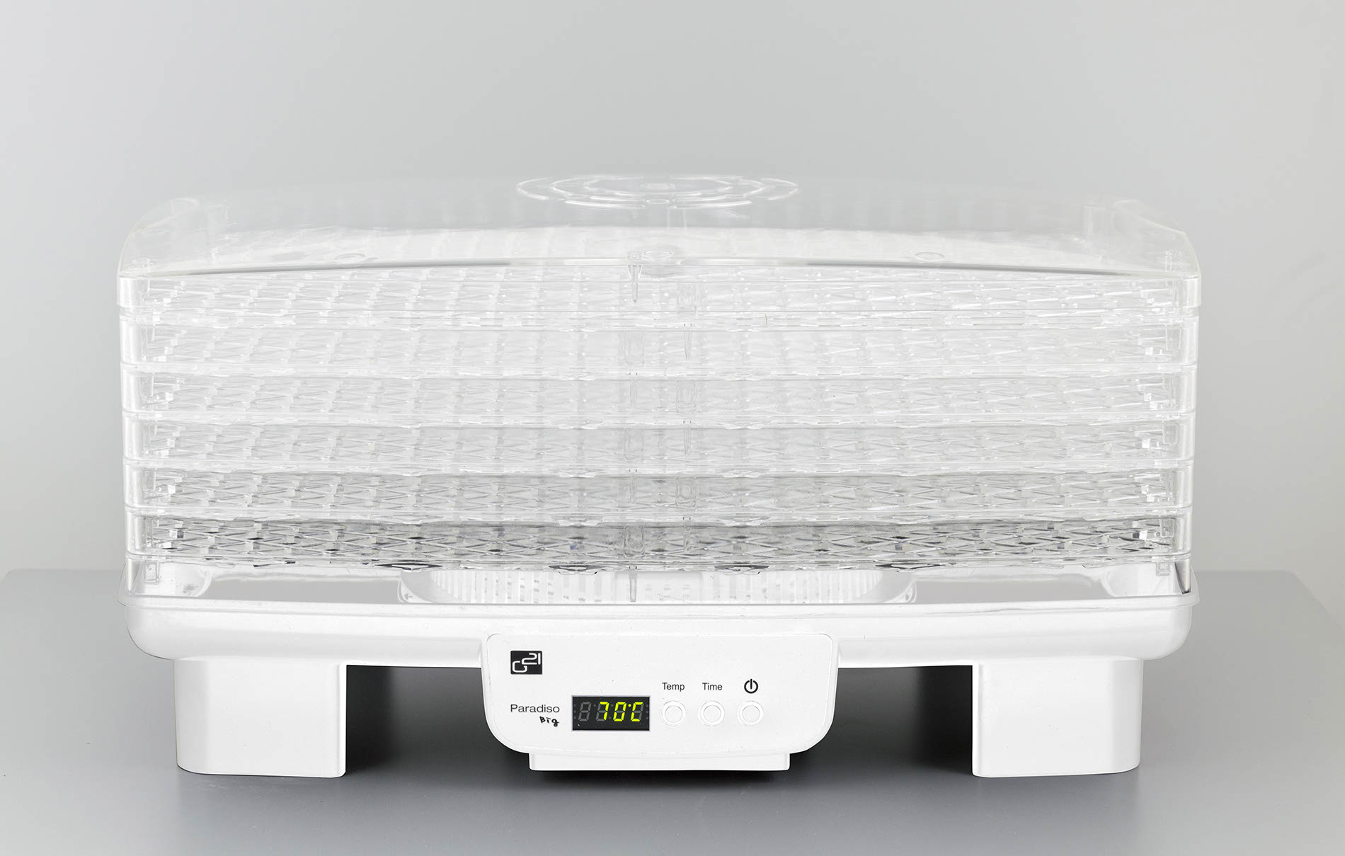 Teplotu sušení můžete zvolit v rozpětí od 40 do 70 °C. Doporučenou dobu sušení nastavíte na časovači, který díky funkci “automatické vypnutí” sušičku po stanovené době sám vypne. Nastavení i zbývající čas sušení můžete sledovat na digitálním displeji. Ovládání je proto velmi snadné a pohodlné. Sušičku G21 Paradiso Big skutečně hlídat nemusíte. Dělá to, co má. Suší.