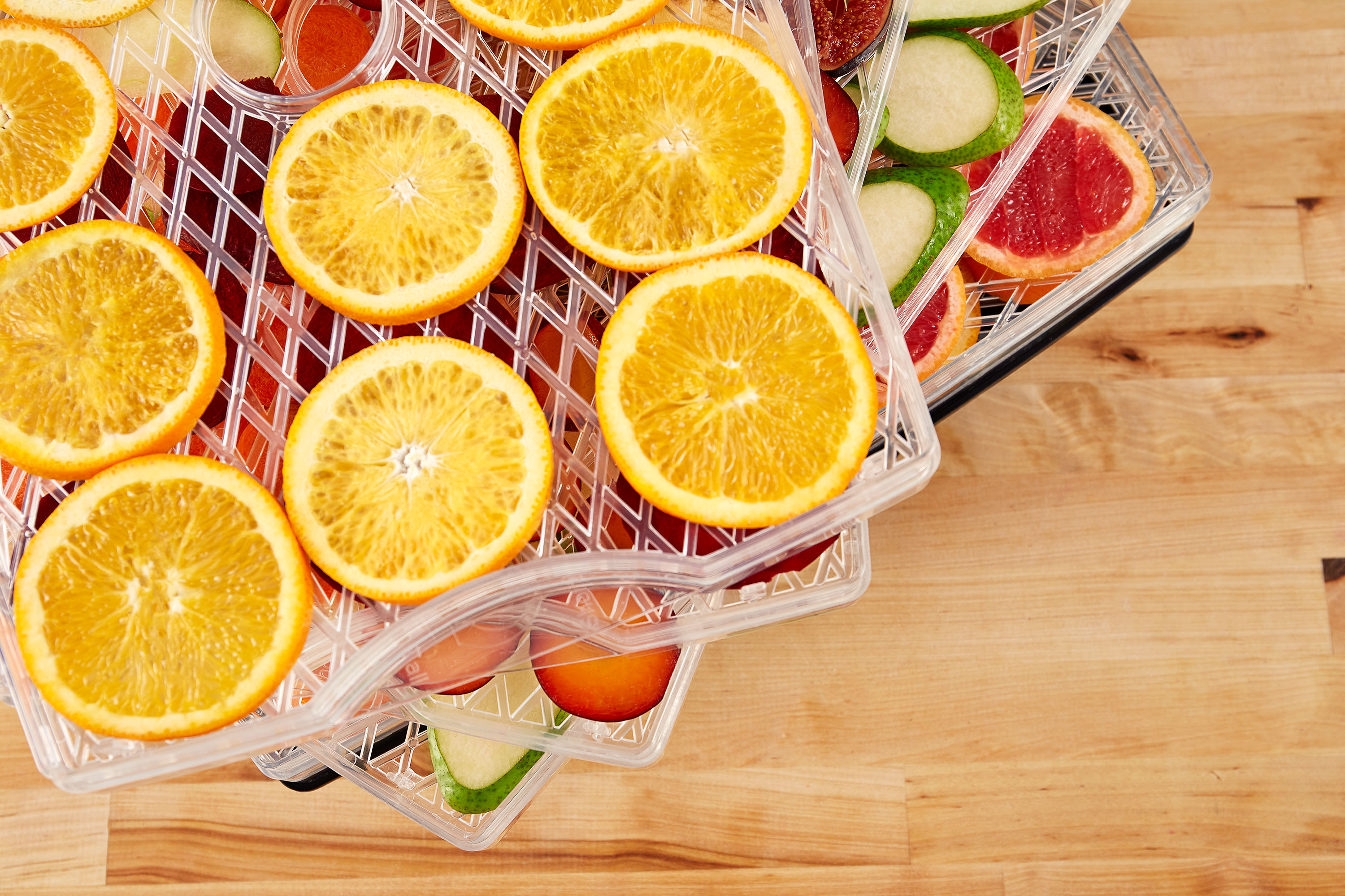 Usazení ventilátoru, výborně řešená sušící plata a navíc možnost jejich výškového nastavení garantuje rovnoměrné a rychlé sušení. Materiál sušících plat vám zase dopřeje jednoduché vyndání usušeného ovoce i zeleniny. Suroviny k platům nepřilnou, snadno je proto oddělíte.