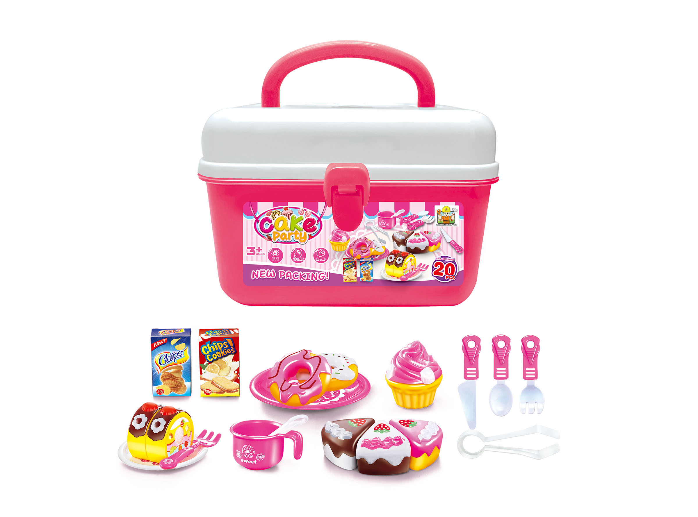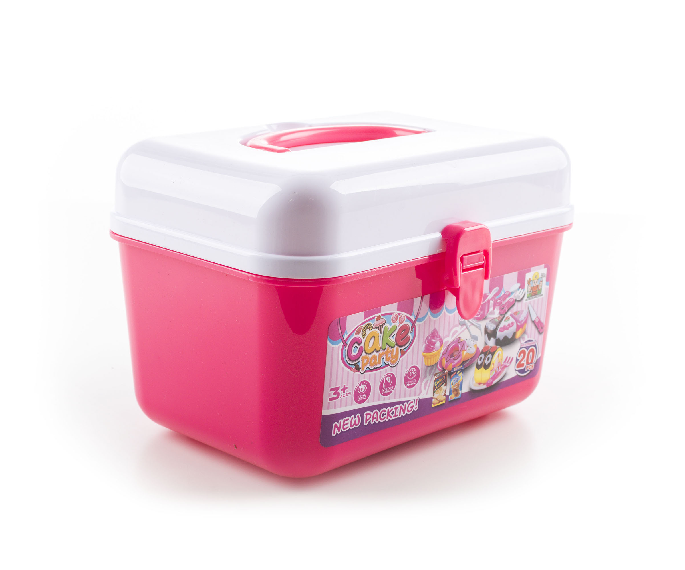 V kufříku najdete krásné barevné plastové dortíky, donuty, rolády, krabičky s ingrediencemi, nádobí i příbory. Zkrátka vše, co je v krámku s dobrotami potřeba. Součástí kufříku je také držadlo, díky kterému může mít vaše malá cukrářka svůj krámek s dortíky u sebe i na cestách.