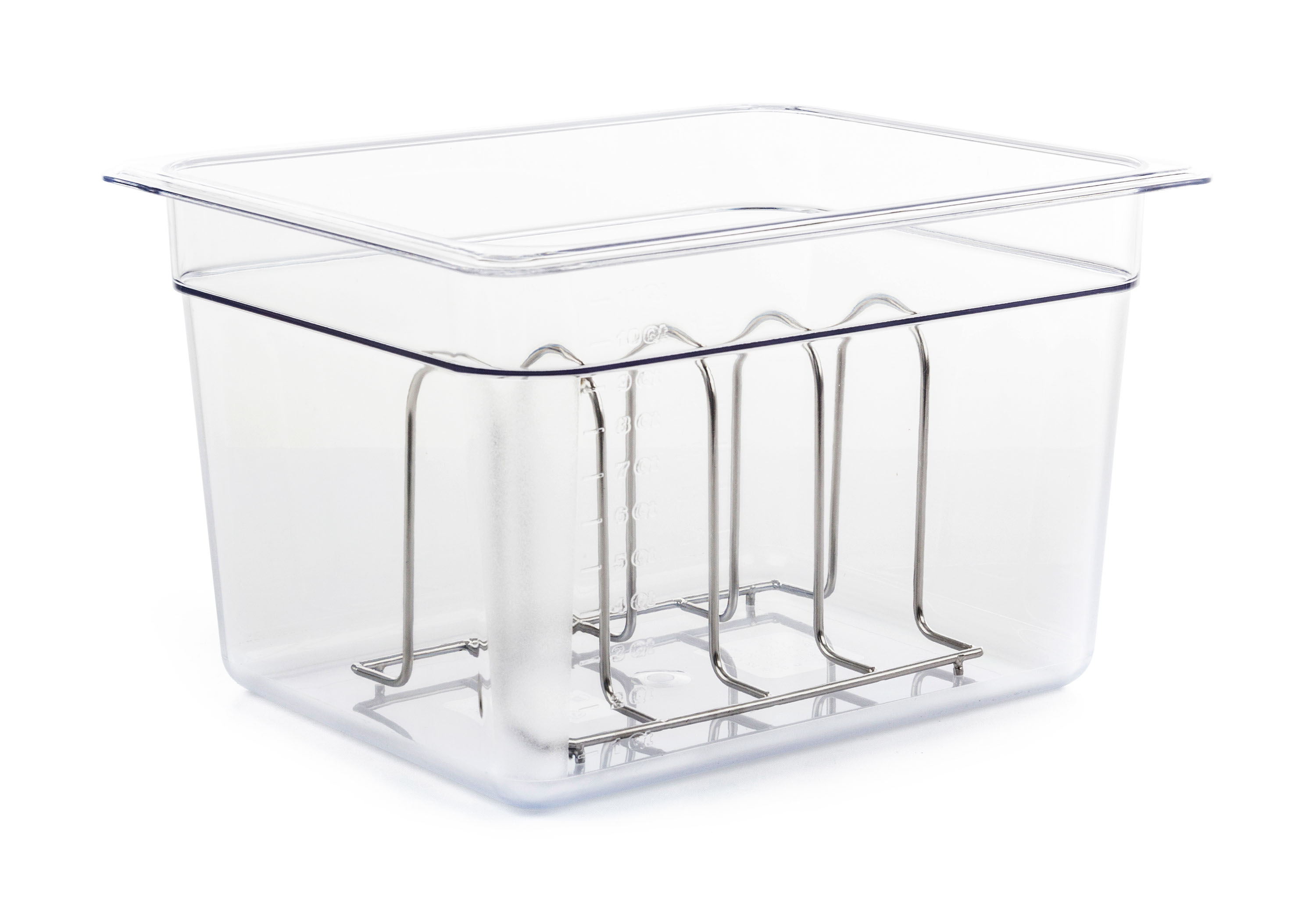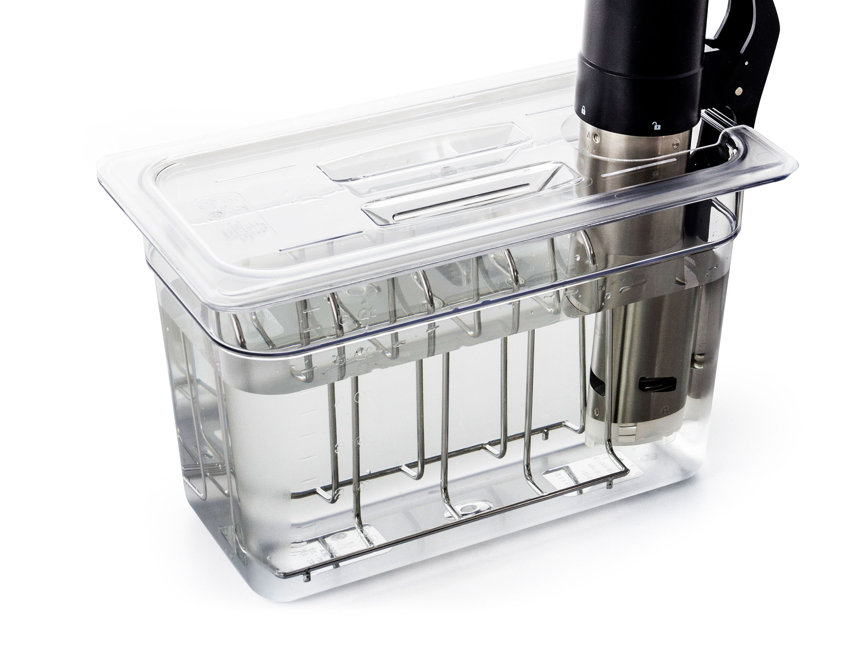 12l nádoba pro vaření metodou Sous Vide zabraňuje vypařování vody, pomáhá lépe udržovat teplotu a zamezí nežádoucím tepelným ztrátám. Nádoba je z polykarbonátu v čiré barvě.