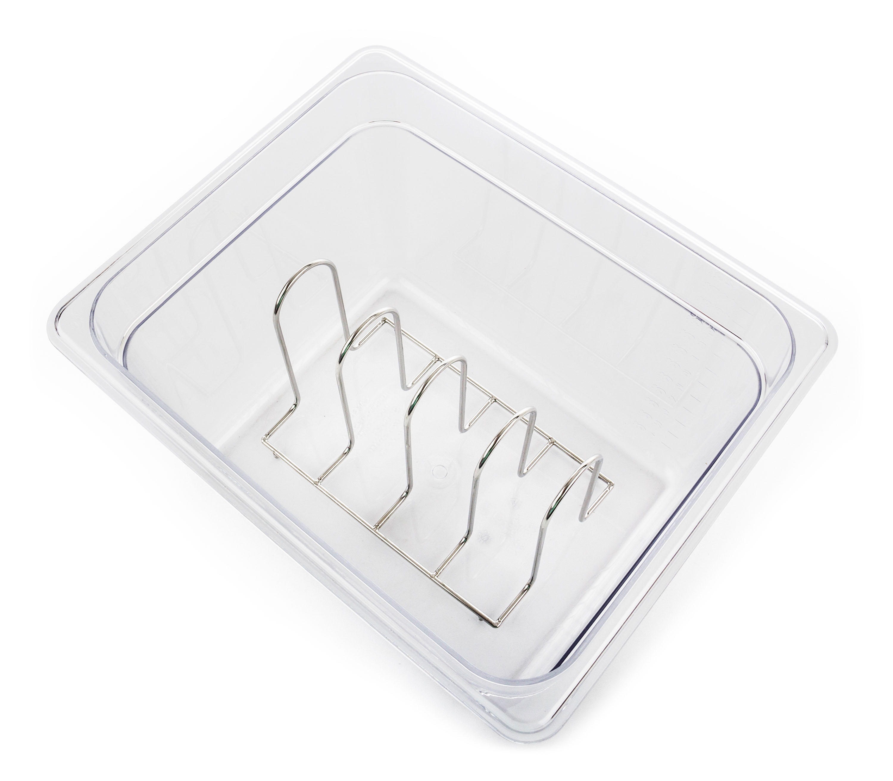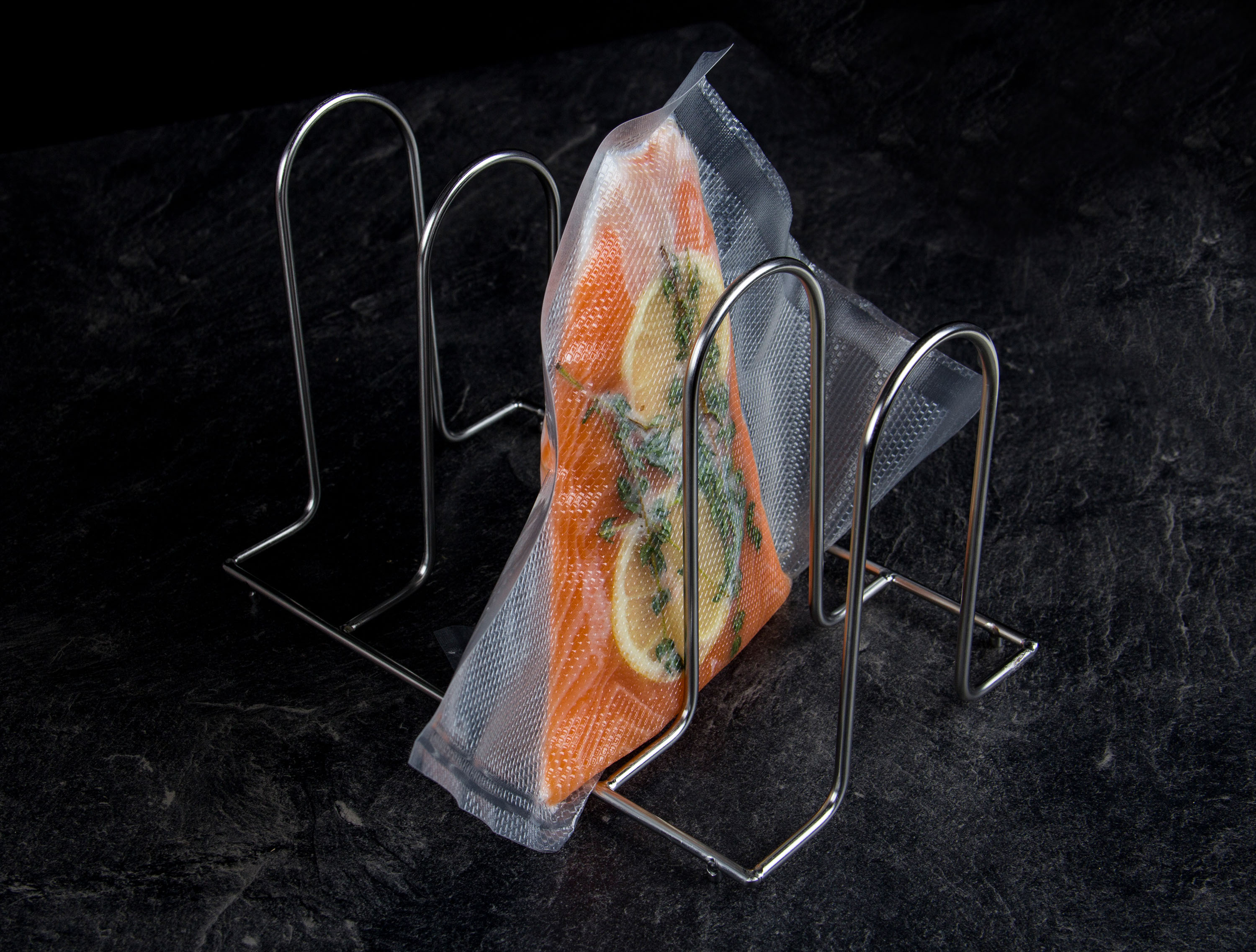 Vyzkoušejte praktický doplněk pro sous-vide vaření. 4místný stojan do kontejnerů a nádob pro vaření metodou sous-vide zachová odstup mezi zavakuovanými balíčky s masem a dalšími surovinami.