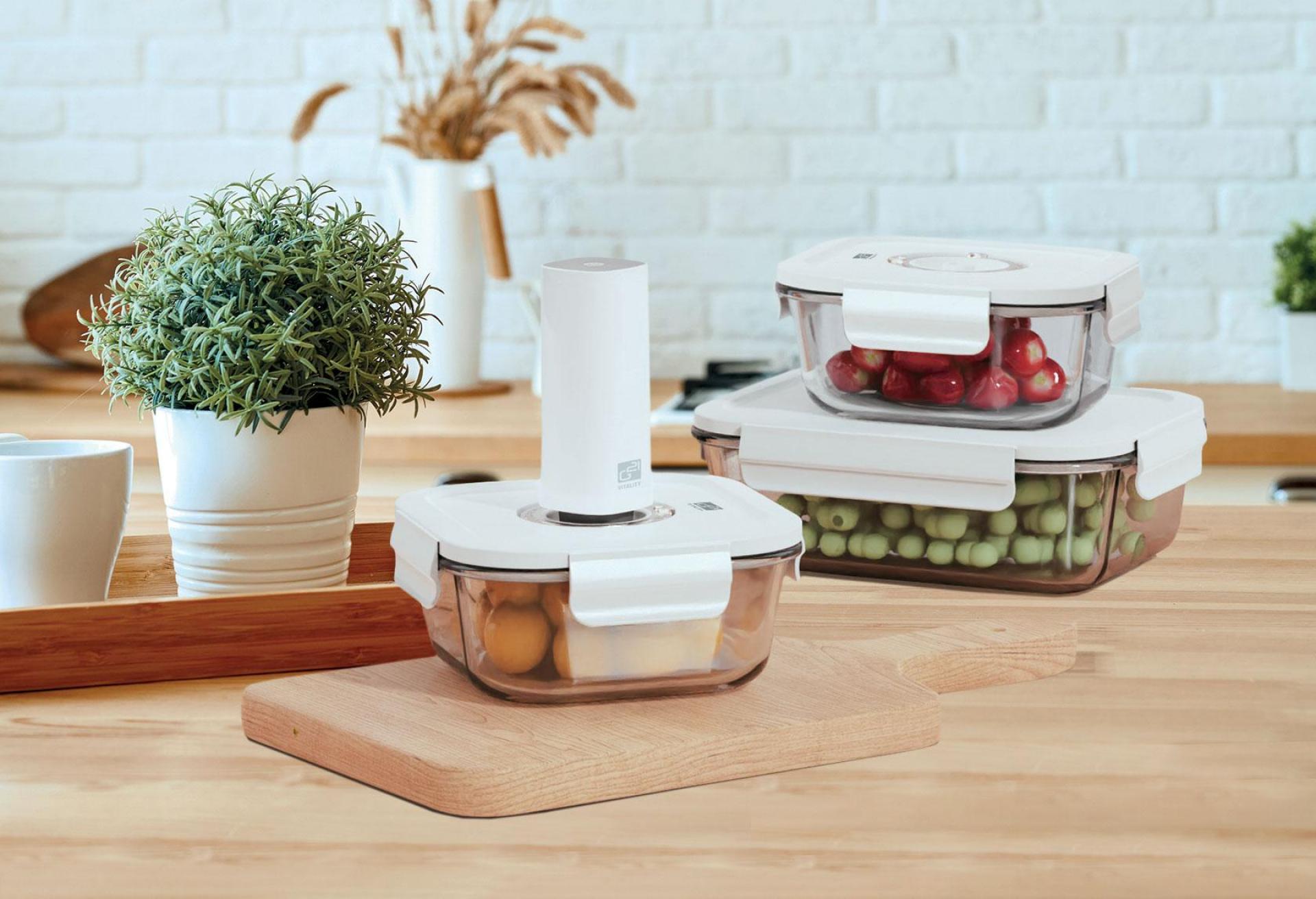Prodloužení trvanlivosti potravin a zachování čerstvosti, vakuování, chlazení i mražení, skleněné borosilikátové tělo, víko BPA Free, nastavení data, teplotní odolnost dózy -20 až + 400 °C.