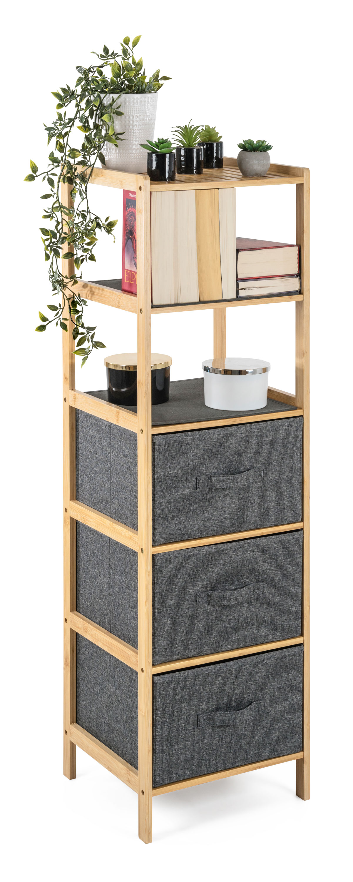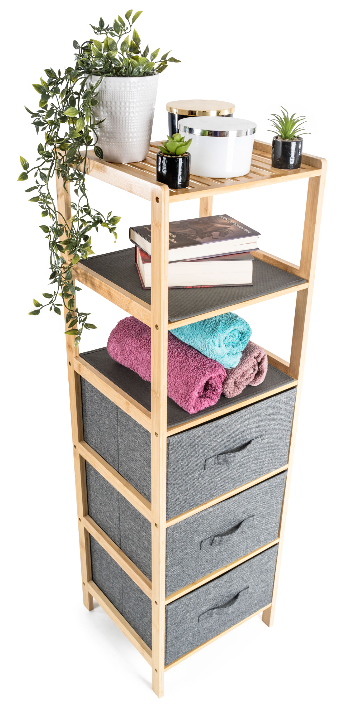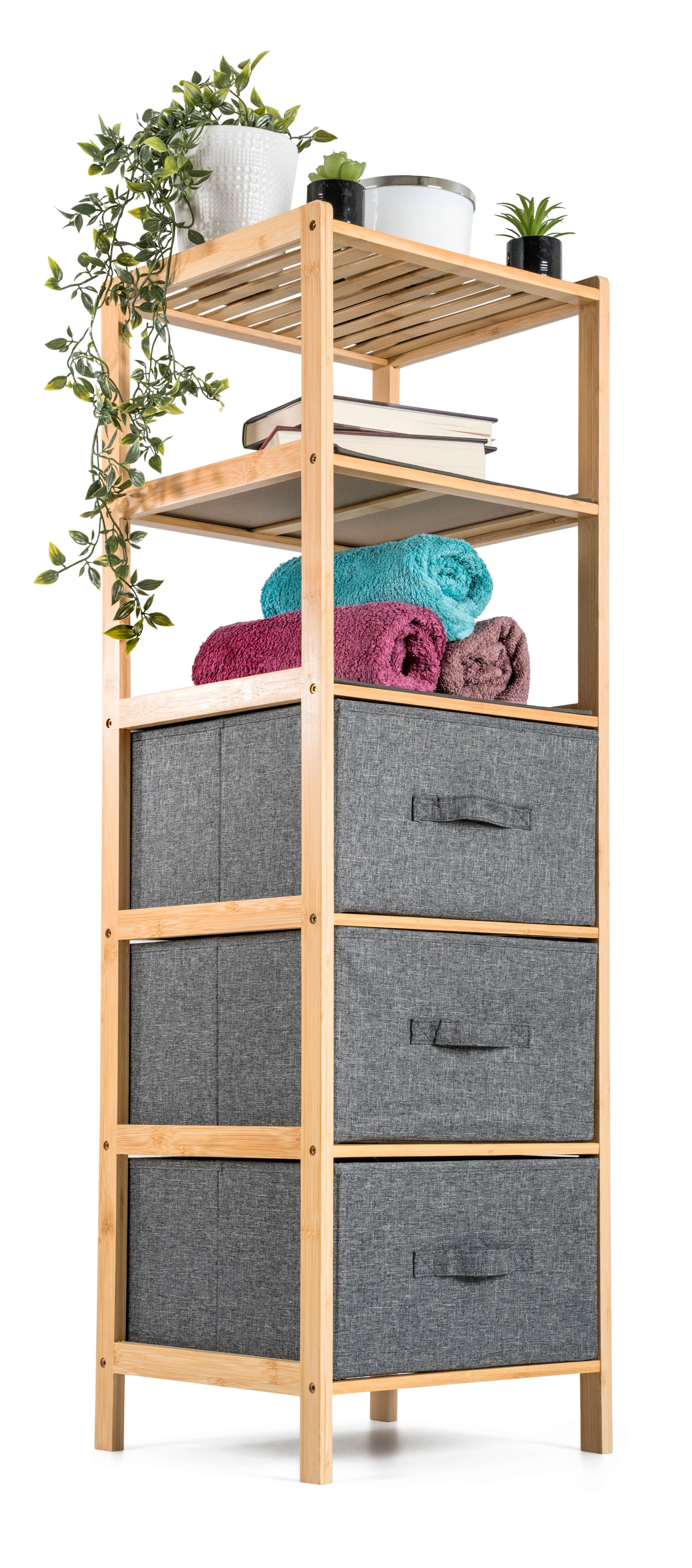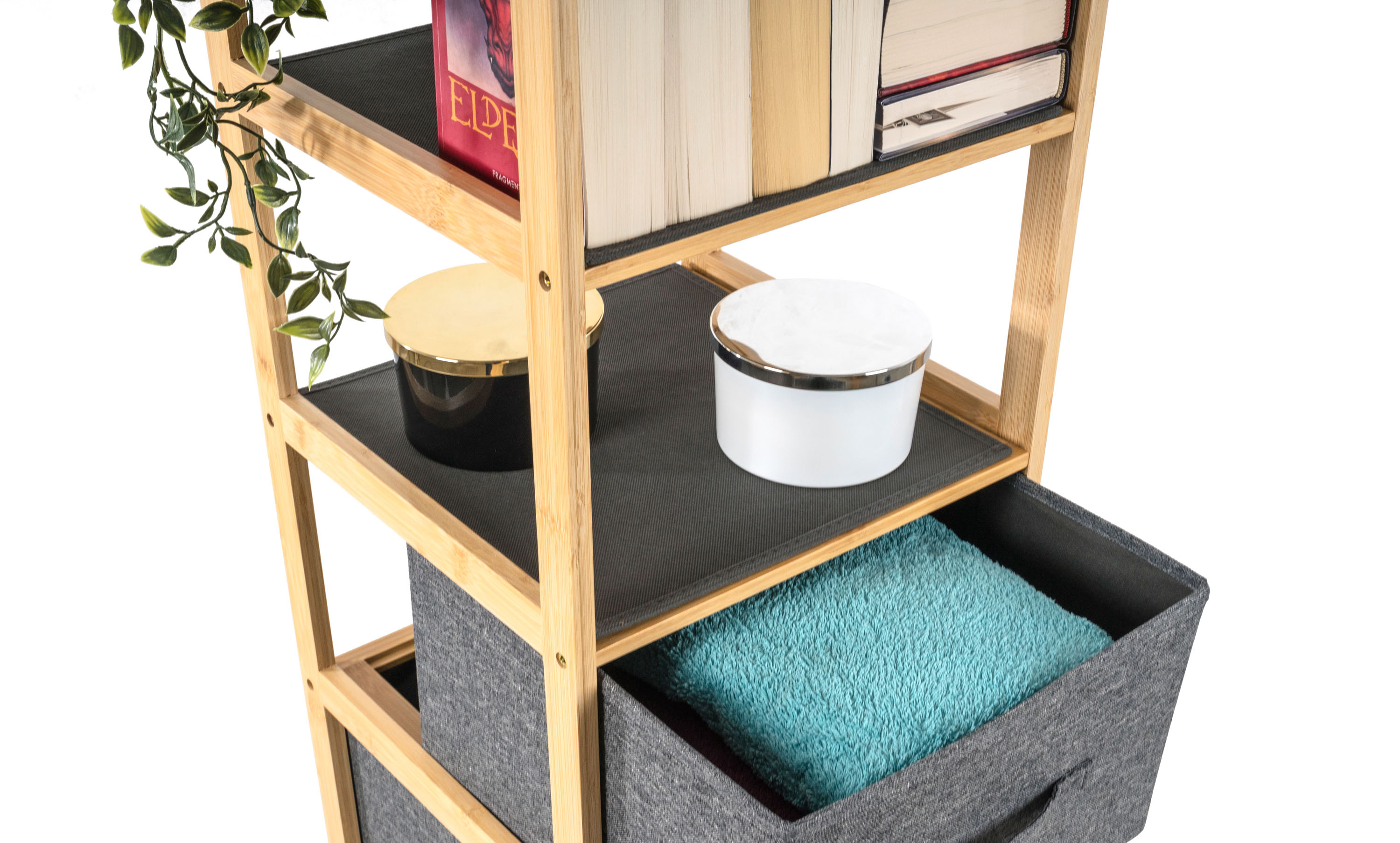 Bambusový regál s výsuvnými látkovými zásuvkami dodává interiéru příjemný přírodní dojem, pocit lehkosti a přirozenosti, zatímco jeho pevnost a dlouhá životnost zajišťují stabilitu a trvanlivost.