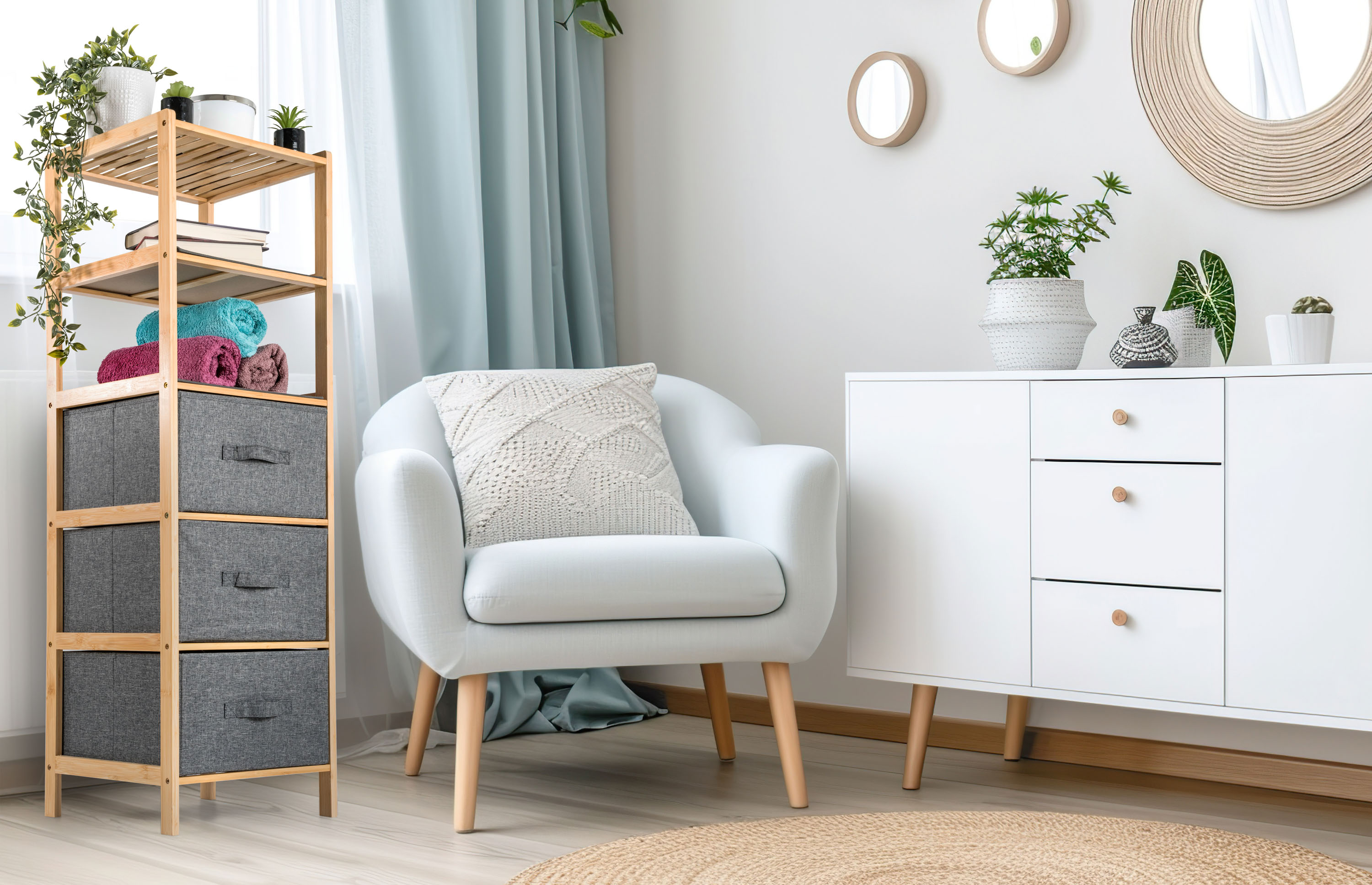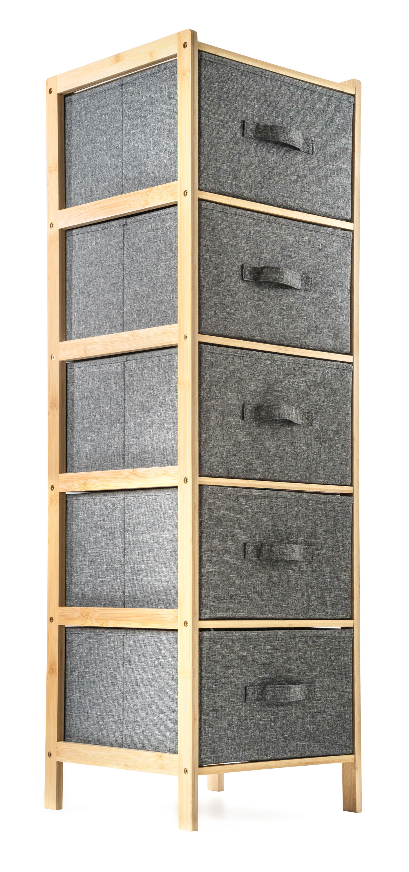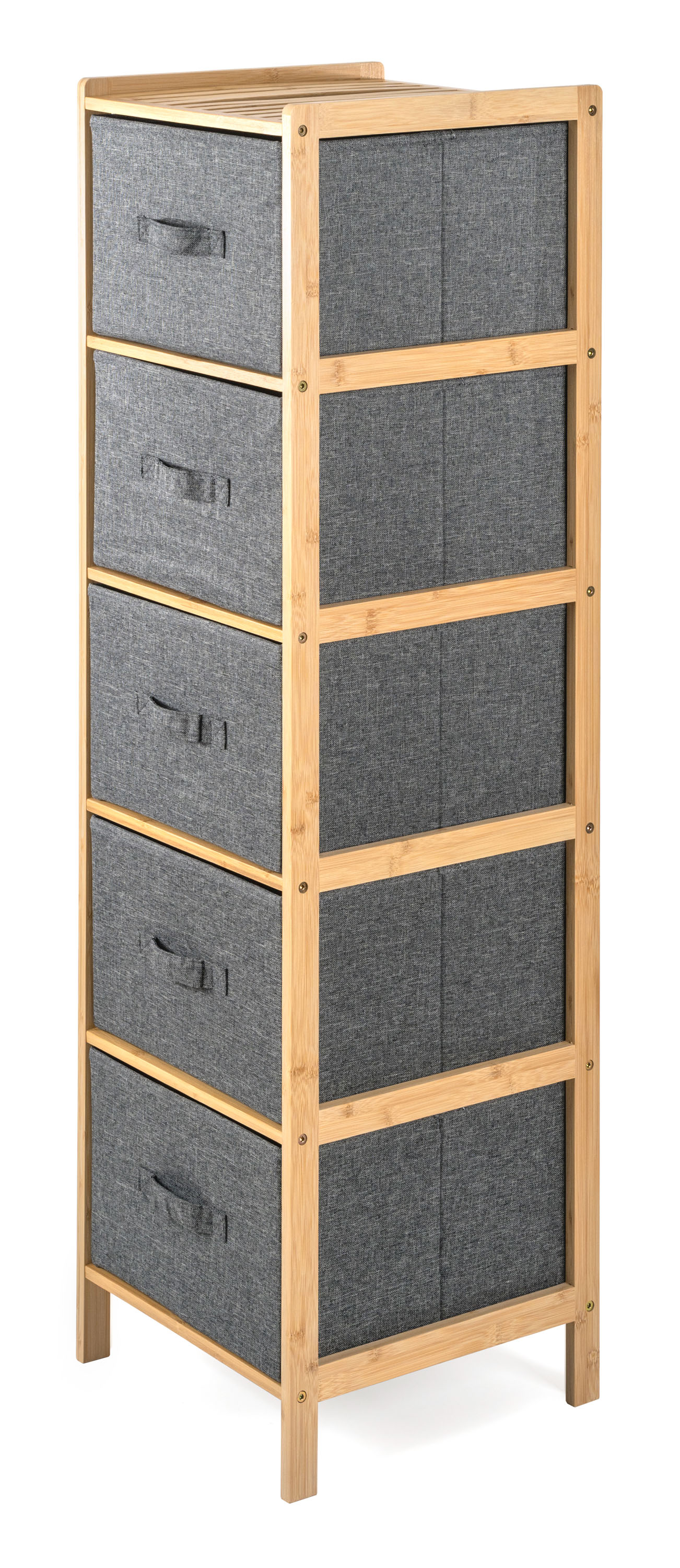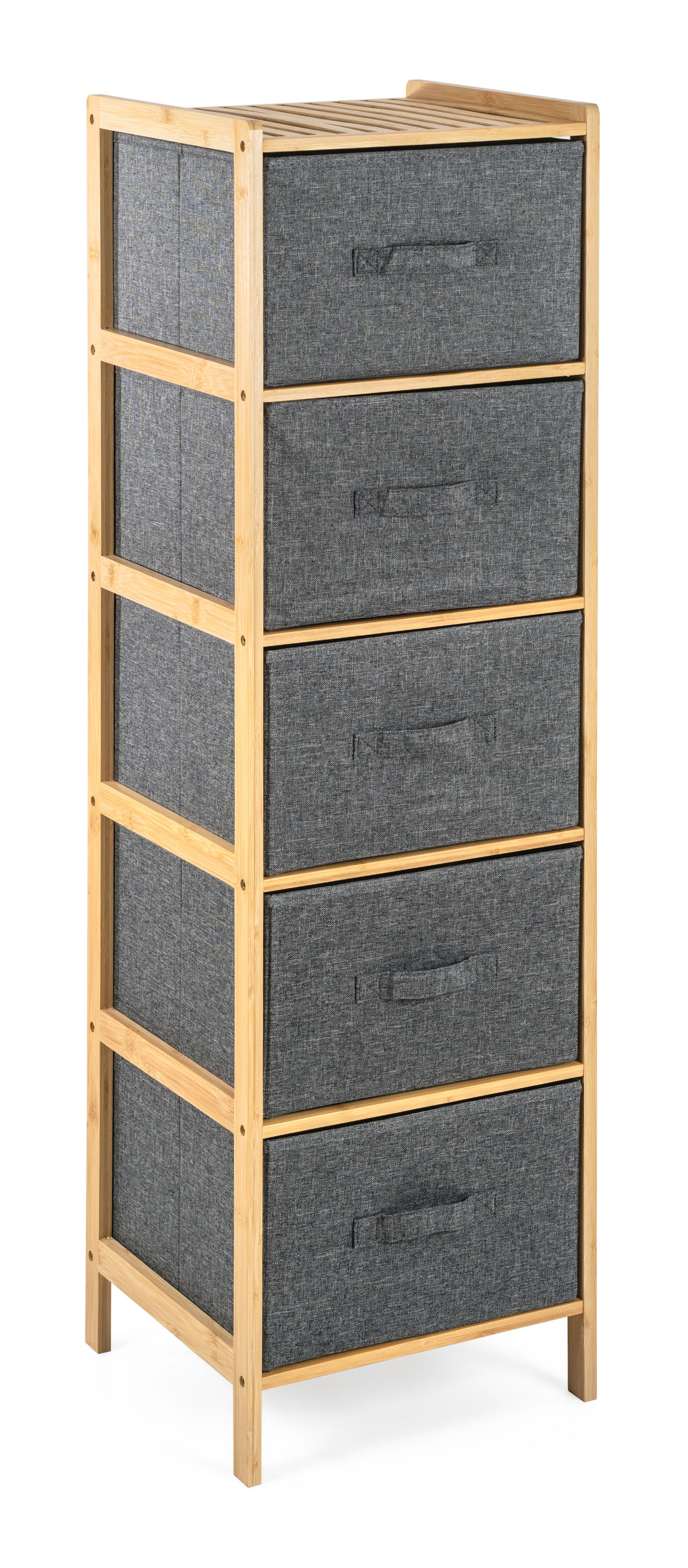 Bambusový regál s výsuvnými látkovými zásuvkami dodává interiéru příjemný přírodní dojem, pocit lehkosti a přirozenosti, zatímco jeho pevnost a dlouhá životnost zajišťují stabilitu a trvanlivost.