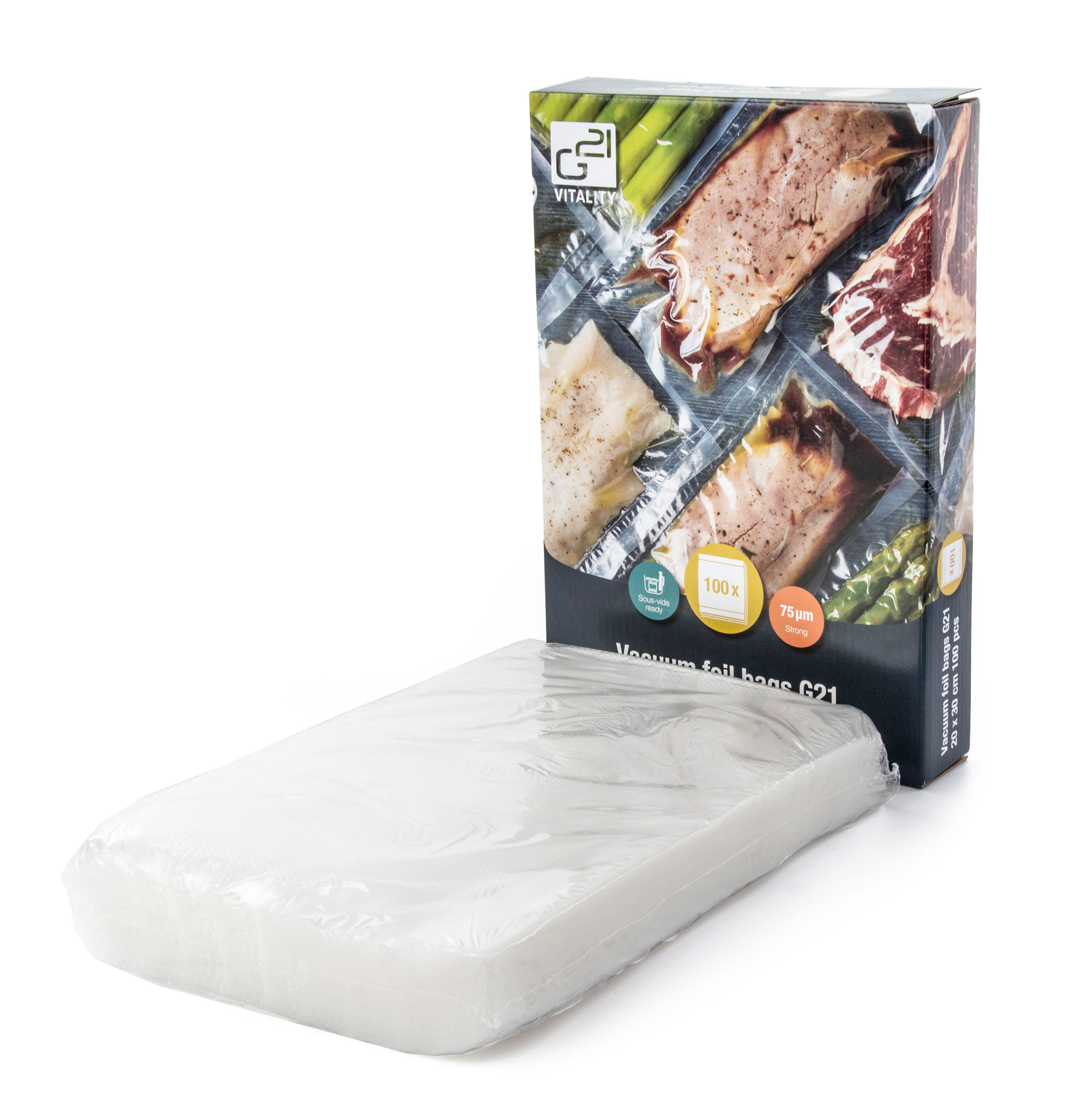 Vakuovací sáčky G21 o rozměrech 20 x 30 cm jsou díky své vysoké pevnosti a kvalitnímu provedení vhodné nejen pro prodloužení trvanlivosti potravin vakuováním a jejich uchovávání v ledničce nebo v mrazáku, ale využijete je i k vakuování surovin pro sous-vide vaření.