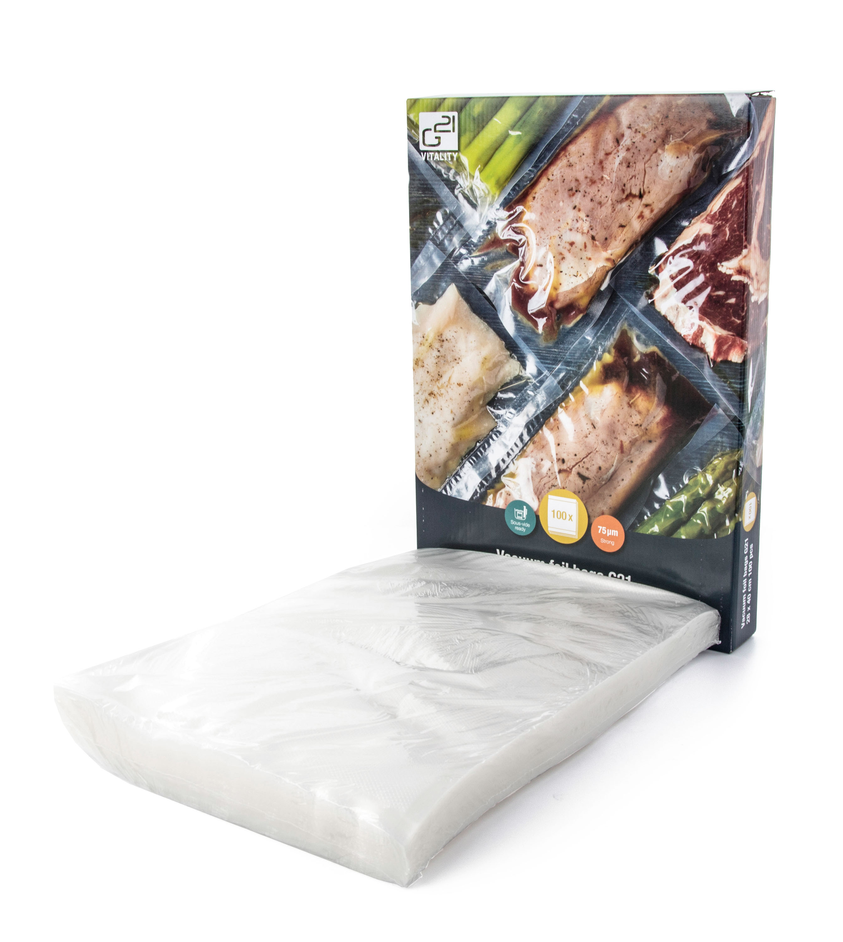 Vakuovací sáčky G21 o rozměrech 28 x 40 cm jsou díky své vysoké pevnosti a kvalitnímu provedení vhodné nejen pro prodloužení trvanlivosti potravin vakuováním a jejich uchovávání v ledničce nebo v mrazáku, ale využijete je i k vakuování surovin pro sous-vide vaření.